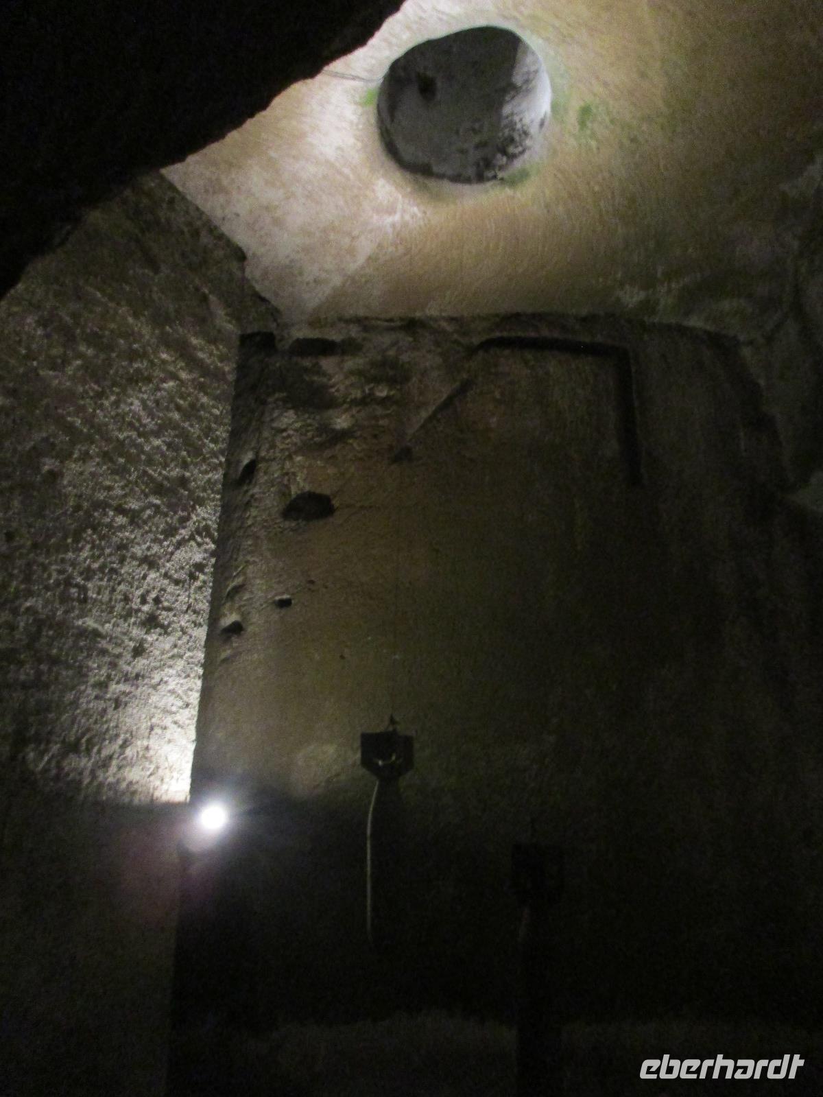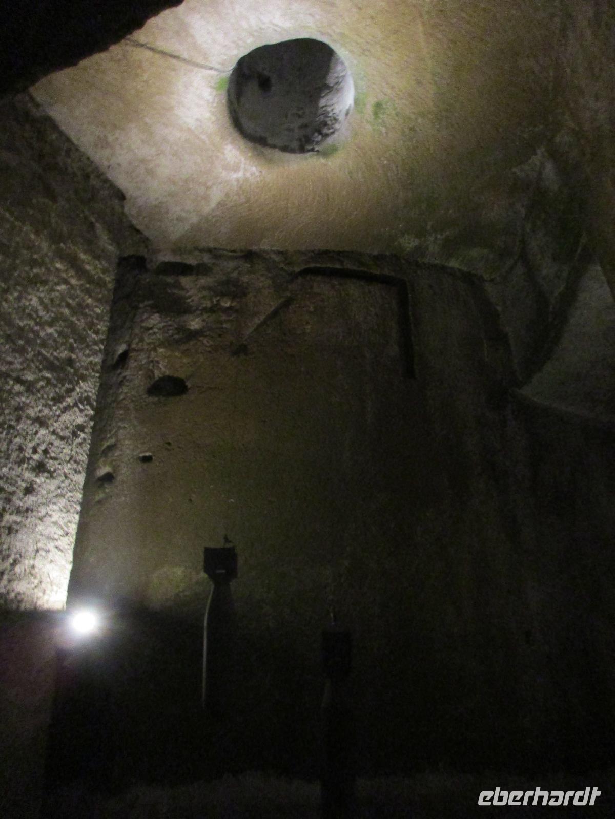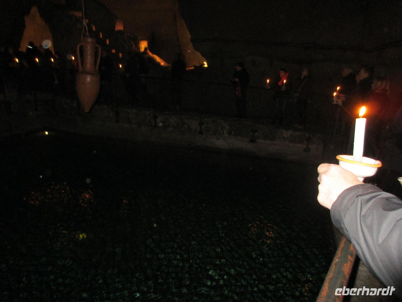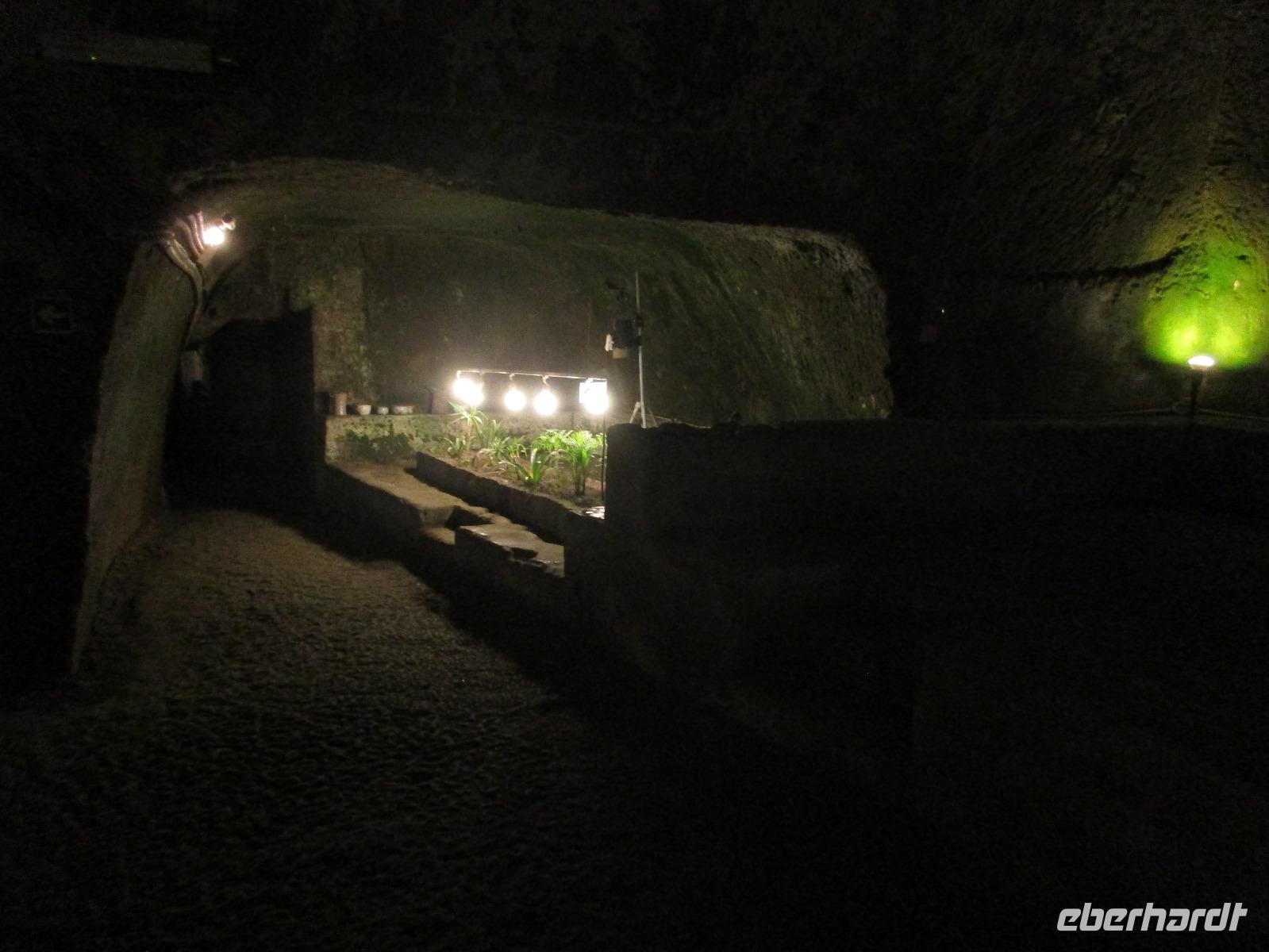 In Neapel ¬angekommen steuern wir die „Napoli Sotteranea", die Unterwelt Neapels, an. Die unterirdische Höhlenlandschaft wurde einst von den alten Griechen errichtet um den Tuffstein, aus dem Neapel erbaut ist, abzubauen. Später wurden die Höhlen als Zisternen genutzt, um die Bevölkerung mit Wasser zu versorgen. Für die Erbauung der „Unterwelt" wurden circa 60 % Neapels untergraben, heute ist davon nur noch ein Bruchteil begehbar. Bei der Besichtigung sehen wir jedoch nicht nur die großen Höhlen, wir haben auch die Möglichkeit die „Unterwelt" mal etwas spannender zu erleben und so durchlaufen wir, zur Beleuchtung mit Kerzen ausgestattet, ein hundert Meter langes, jedoch nicht mal einen Meter breites Gangsystem, welches die Zisternen miteinander verbindet.