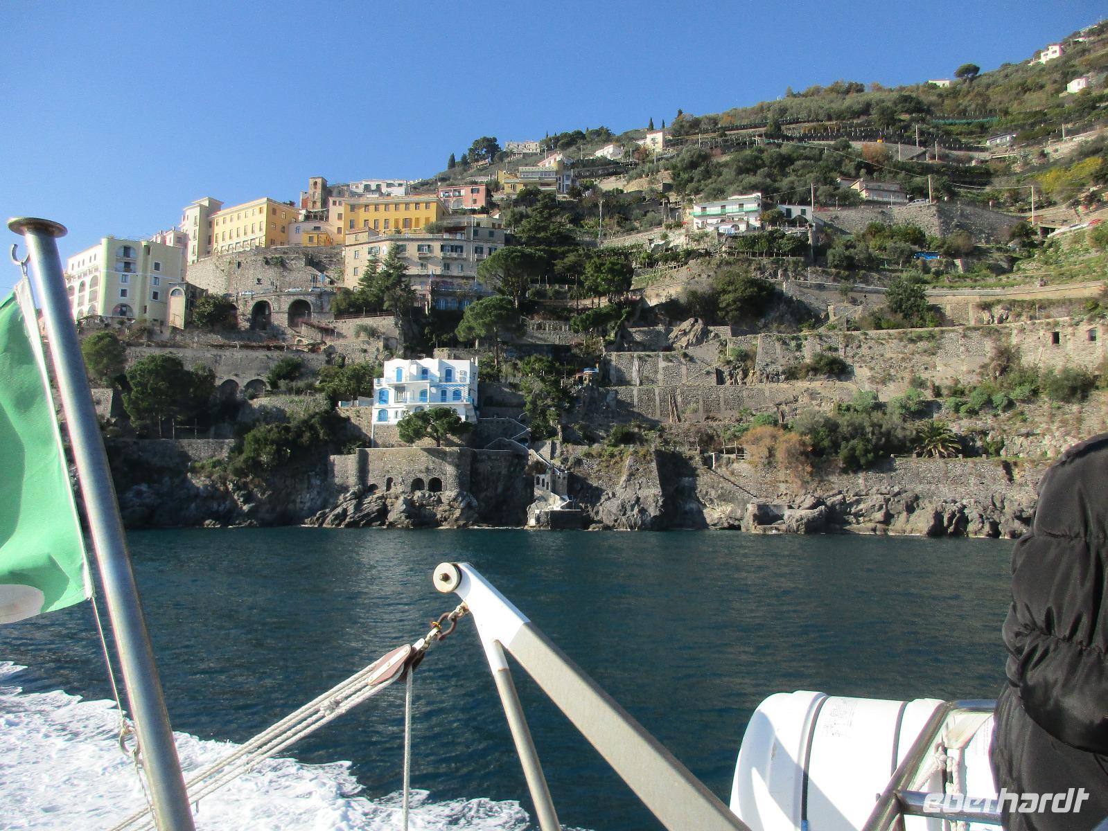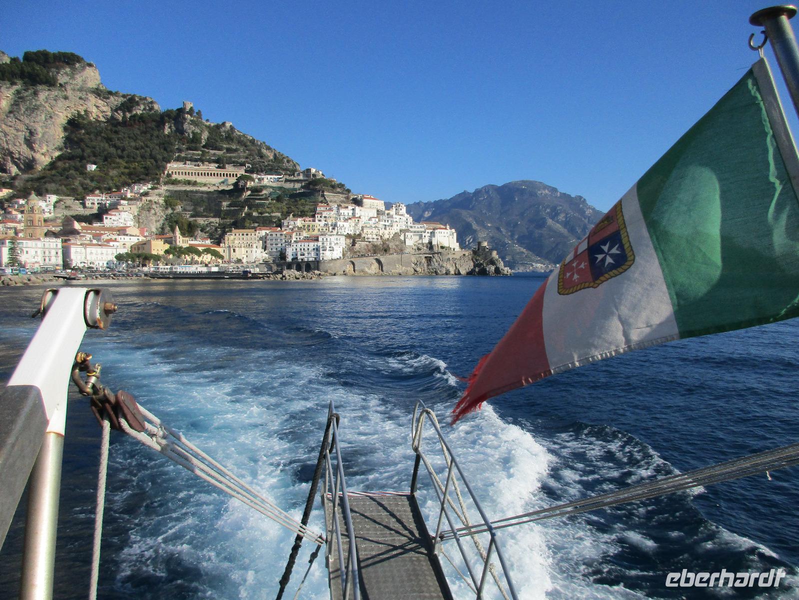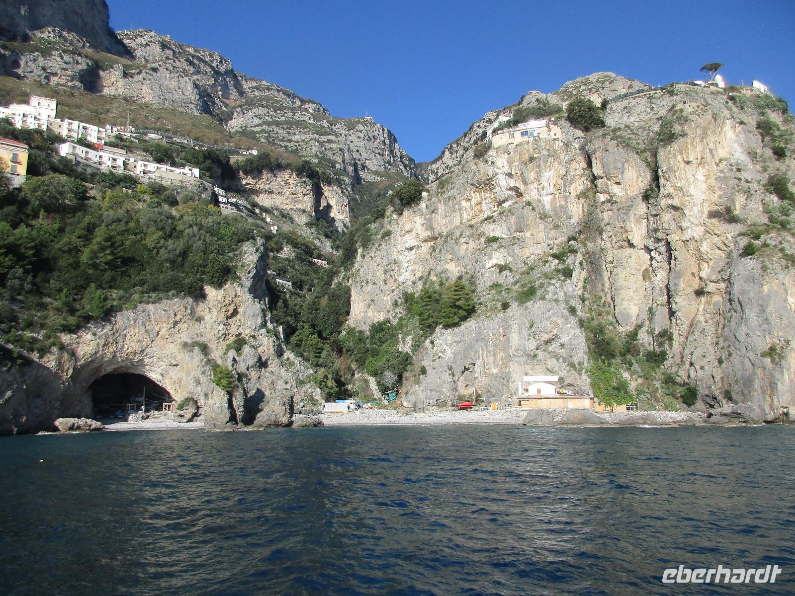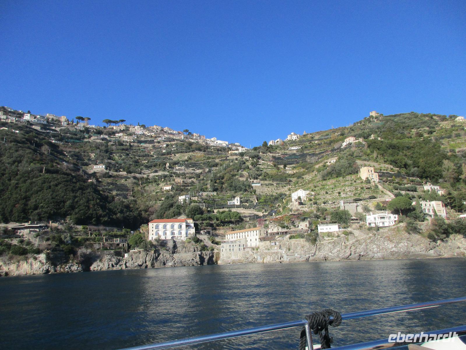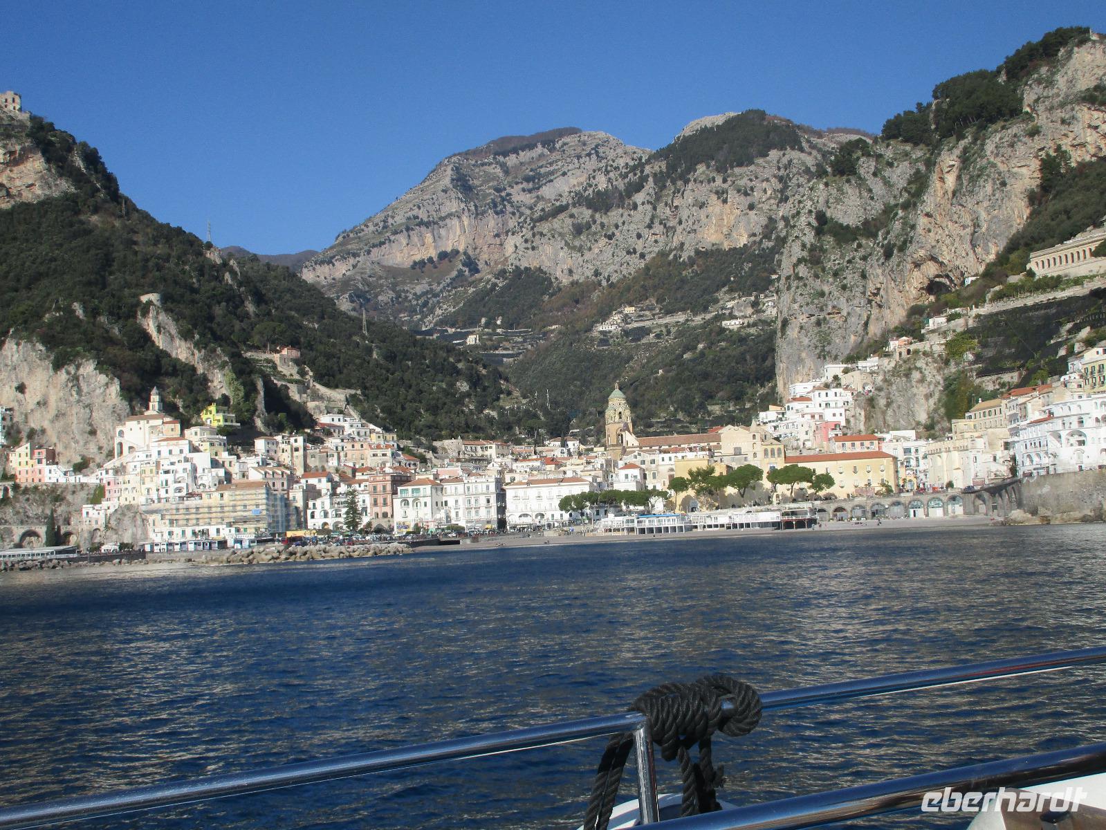 Nach dem morgendlichen Frühstück treffen wir uns 08.45 am Hotel mit Mathias und beginnen unsere Panoramatour an der Amalfiküste entlang. Zuerst passieren wir den kleinen Pass, der die sorrentinische Küste von der Amalfiküste trennt. Vorbei an steilen Felswänden und Zitronenhainen schlängelt sich die Straße an der Küste entlang. An kurzen Panoramastopps bekommen wir schon einen kleinen Vorgeschmack auf die Landschaft und die Umgebung. Während der Fahrt erzählt Mathias wieder jede Menge über Land und Leute und organisiert nebenbei auch noch eine kleine Küstenfahrt mit dem Boot. Gesagt, getan: Als wir in Amalfi ankommen, gehen wir direkt zum Pier, an dem wir nach italienischen 10 Minuten des Wartens auch von unserem Boot abgeholt werden und die Küstenpanoramafahrt beginnen. Vorbei an steinigen Küstenfelsen, vergessenen Fischerbuchten und versteinerten Elefanten können wir die Schönheit der Amalfiküste und ihrer kleinen Ortschaften bestaunen.