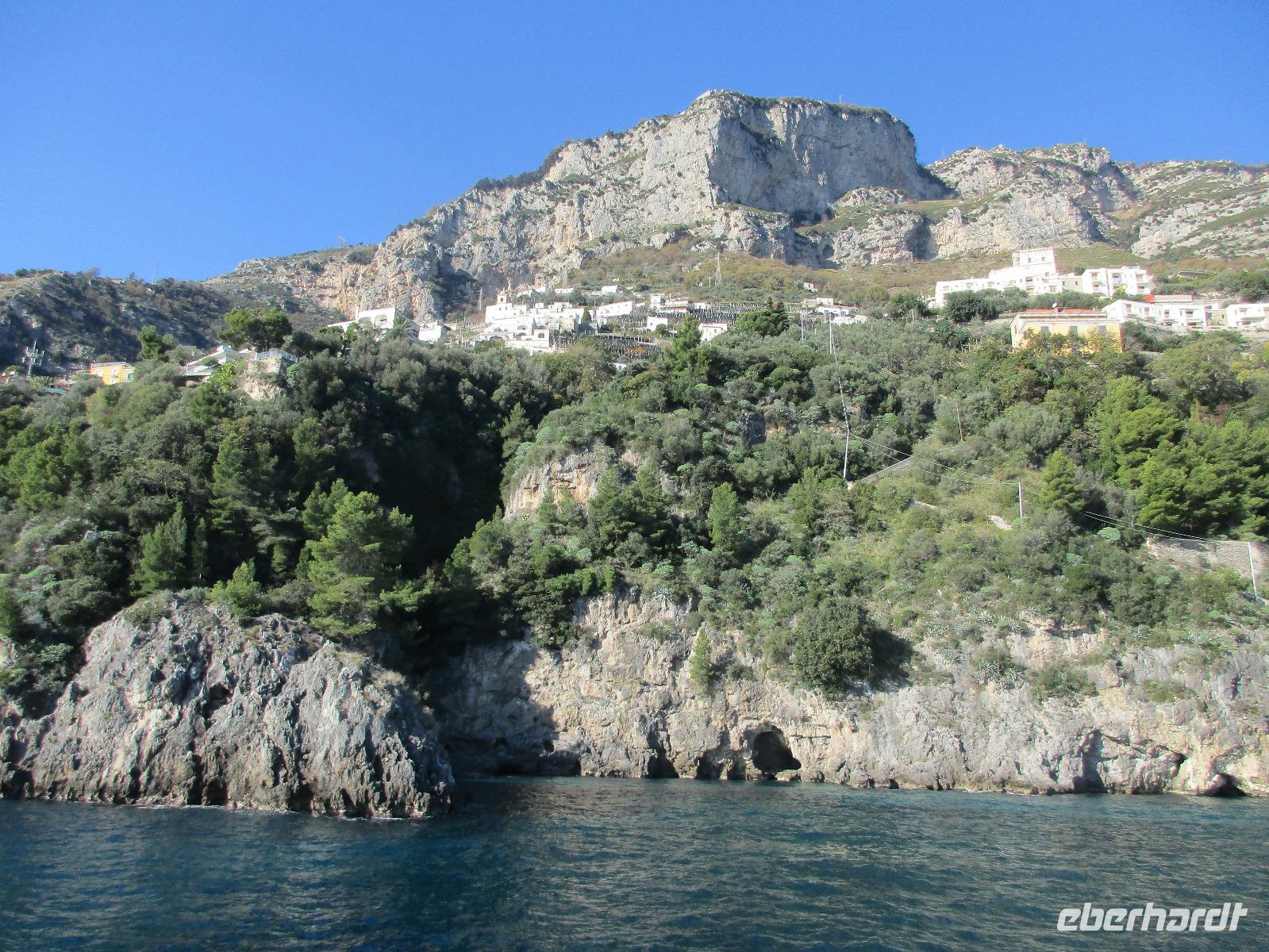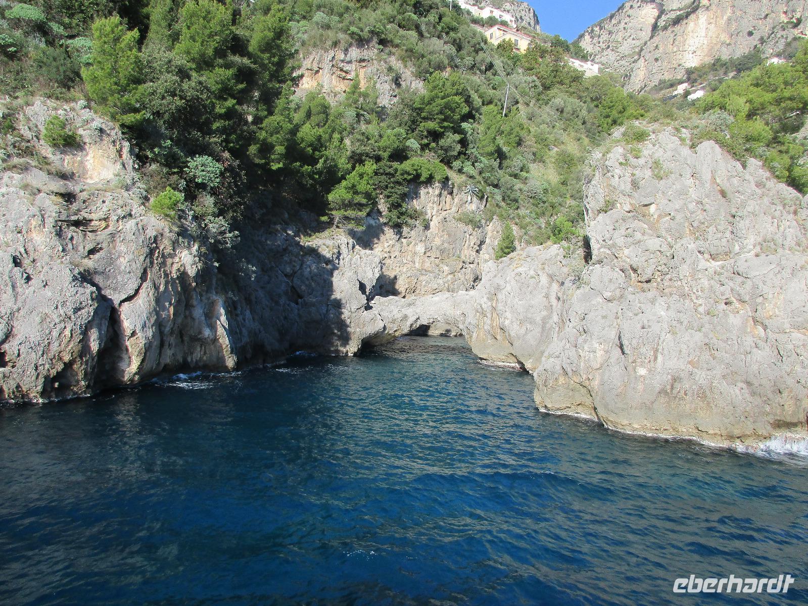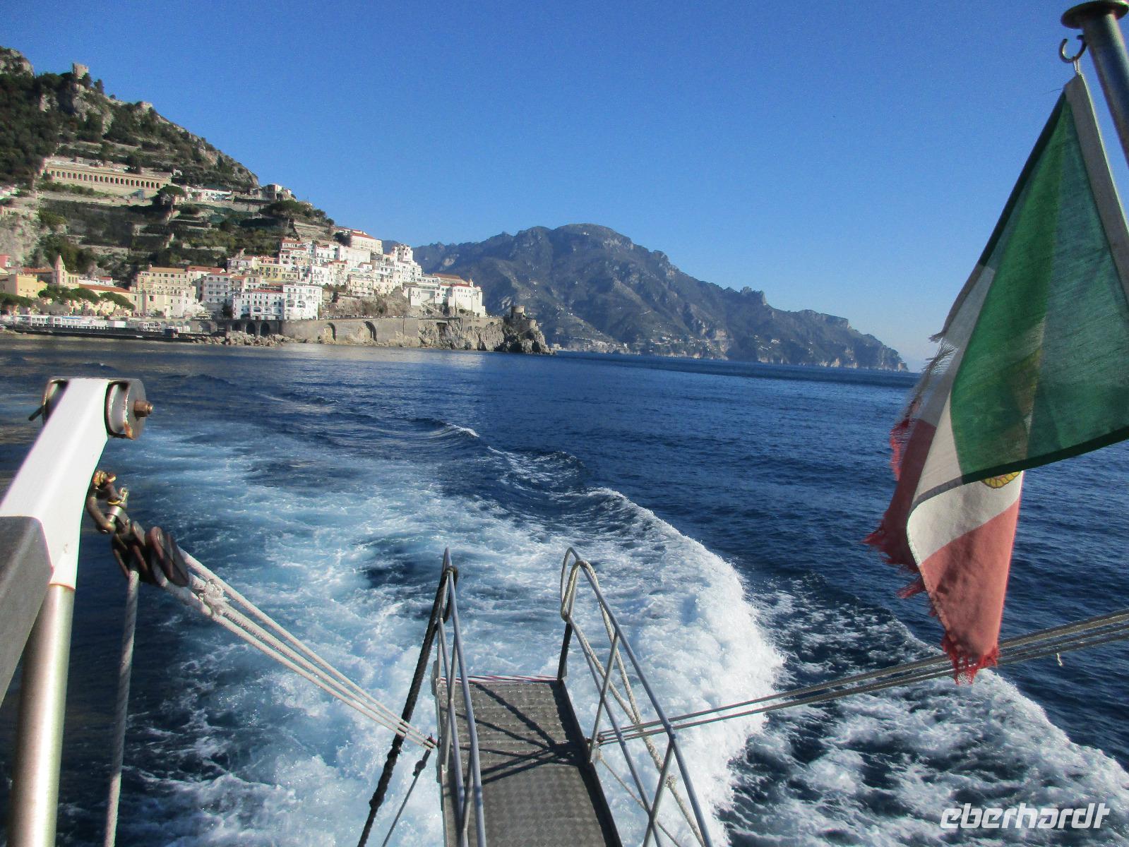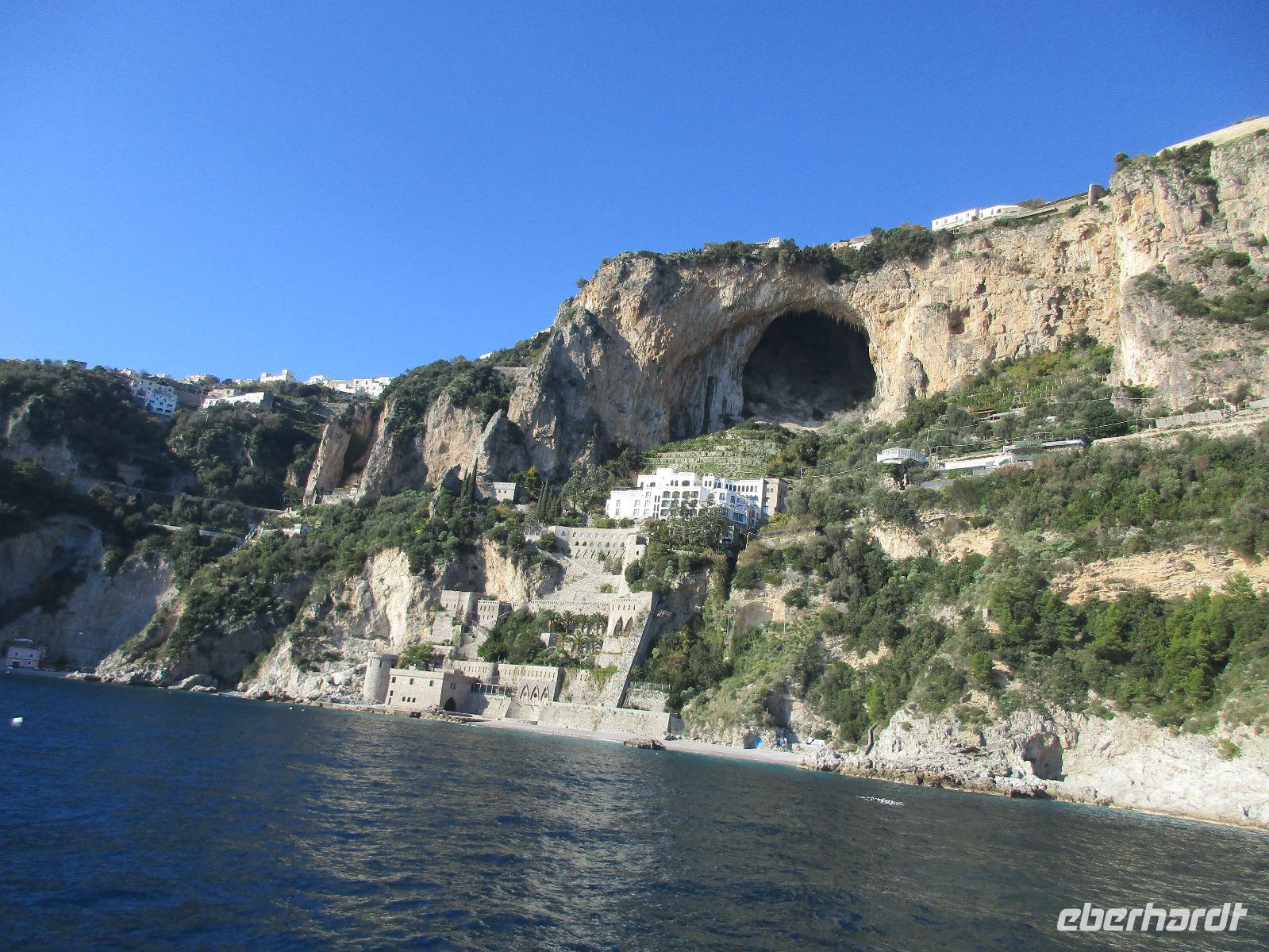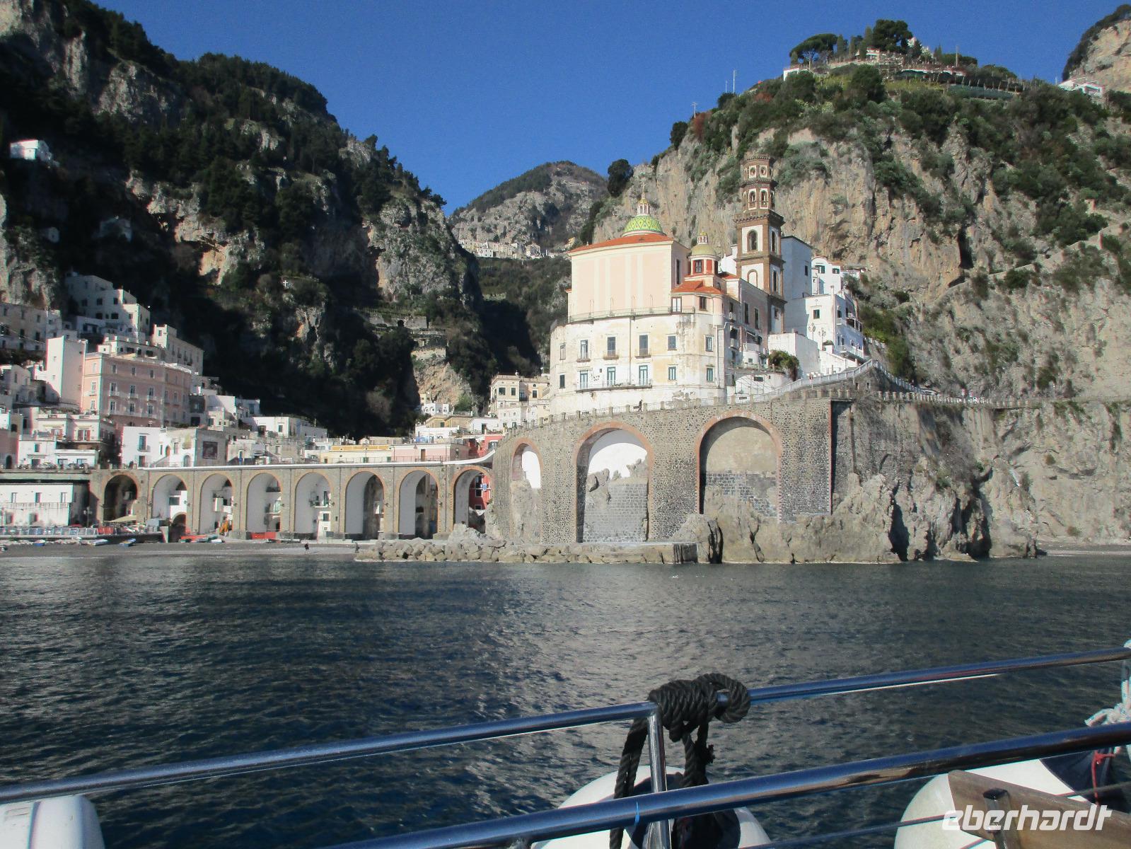 Nach dem morgendlichen Frühstück treffen wir uns 08.45 am Hotel mit Mathias und beginnen unsere Panoramatour an der Amalfiküste entlang. Zuerst passieren wir den kleinen Pass, der die sorrentinische Küste von der Amalfiküste trennt. Vorbei an steilen Felswänden und Zitronenhainen schlängelt sich die Straße an der Küste entlang. An kurzen Panoramastopps bekommen wir schon einen kleinen Vorgeschmack auf die Landschaft und die Umgebung. Während der Fahrt erzählt Mathias wieder jede Menge über Land und Leute und organisiert nebenbei auch noch eine kleine Küstenfahrt mit dem Boot. Gesagt, getan: Als wir in Amalfi ankommen, gehen wir direkt zum Pier, an dem wir nach italienischen 10 Minuten des Wartens auch von unserem Boot abgeholt werden und die Küstenpanoramafahrt beginnen. Vorbei an steinigen Küstenfelsen, vergessenen Fischerbuchten und versteinerten Elefanten können wir die Schönheit der Amalfiküste und ihrer kleinen Ortschaften bestaunen.