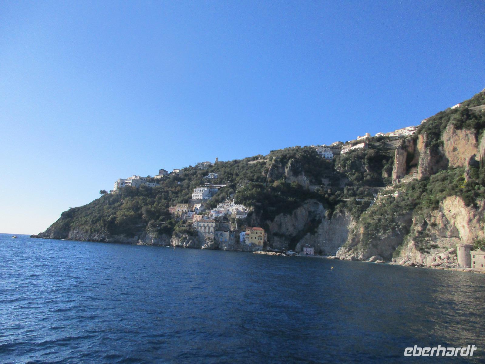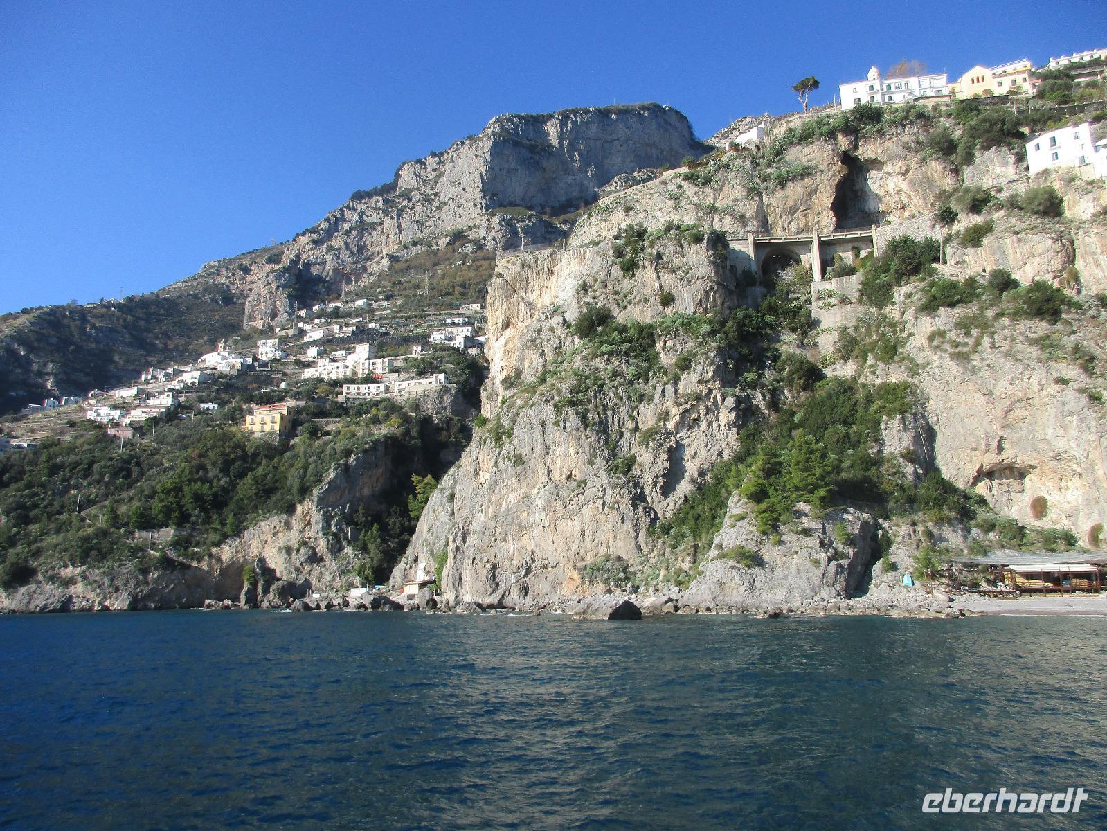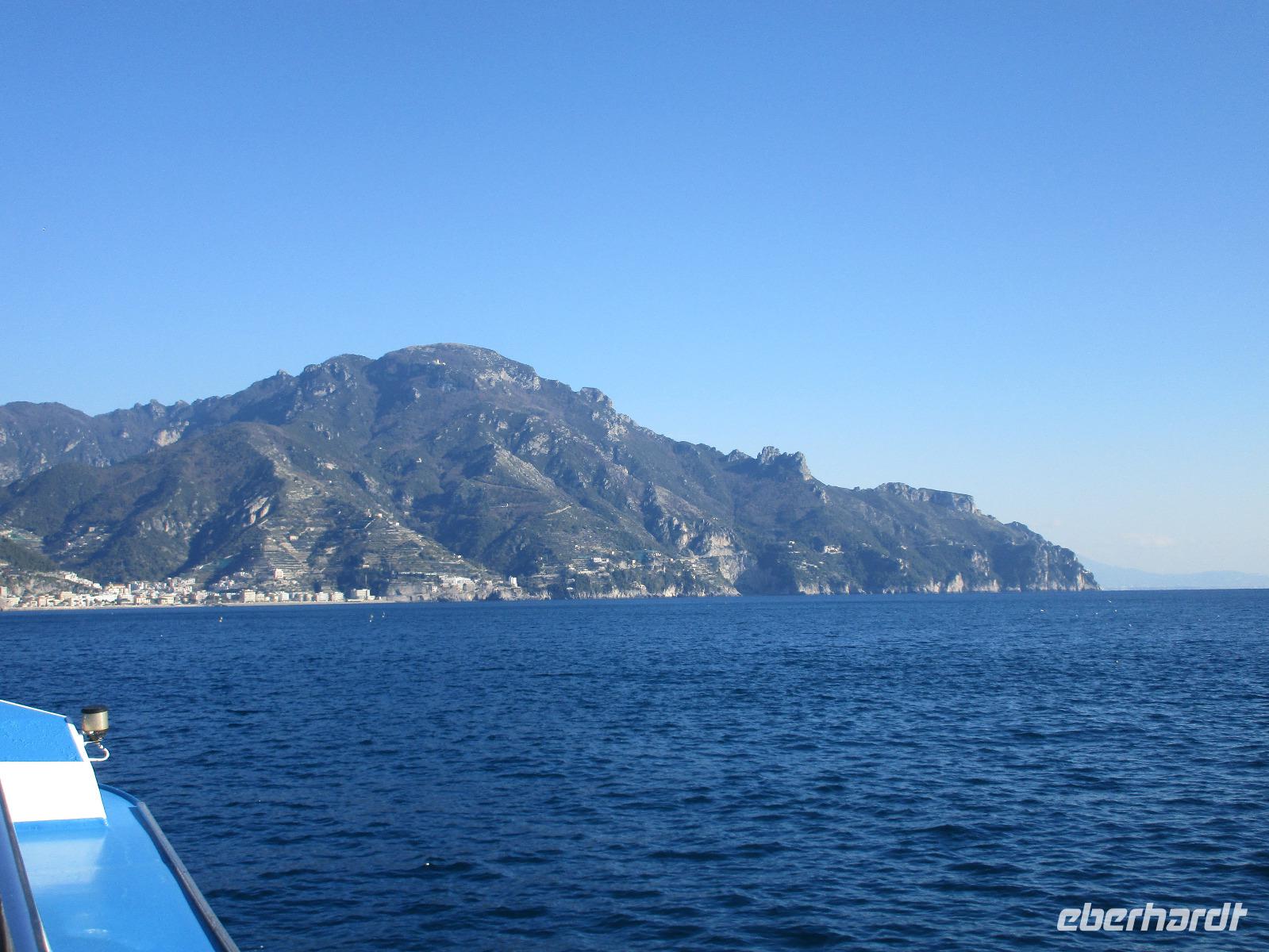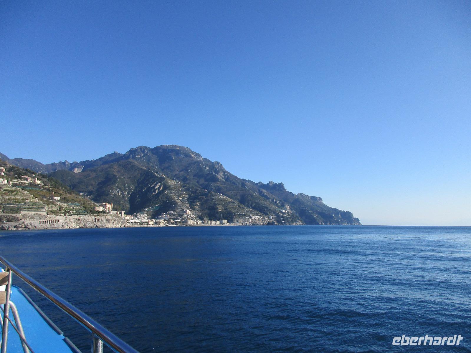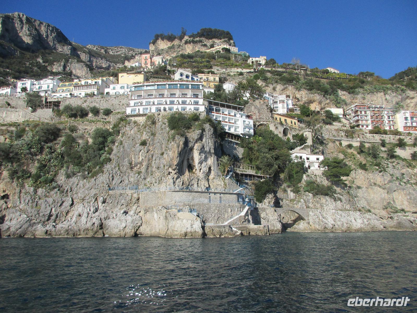 Nach dem morgendlichen Frühstück treffen wir uns 08.45 am Hotel mit Mathias und beginnen unsere Panoramatour an der Amalfiküste entlang. Zuerst passieren wir den kleinen Pass, der die sorrentinische Küste von der Amalfiküste trennt. Vorbei an steilen Felswänden und Zitronenhainen schlängelt sich die Straße an der Küste entlang. An kurzen Panoramastopps bekommen wir schon einen kleinen Vorgeschmack auf die Landschaft und die Umgebung. Während der Fahrt erzählt Mathias wieder jede Menge über Land und Leute und organisiert nebenbei auch noch eine kleine Küstenfahrt mit dem Boot. Gesagt, getan: Als wir in Amalfi ankommen, gehen wir direkt zum Pier, an dem wir nach italienischen 10 Minuten des Wartens auch von unserem Boot abgeholt werden und die Küstenpanoramafahrt beginnen. Vorbei an steinigen Küstenfelsen, vergessenen Fischerbuchten und versteinerten Elefanten können wir die Schönheit der Amalfiküste und ihrer kleinen Ortschaften bestaunen.