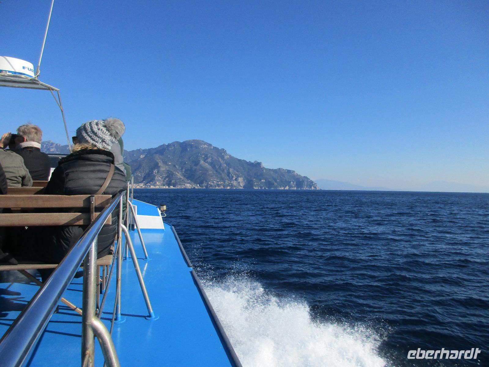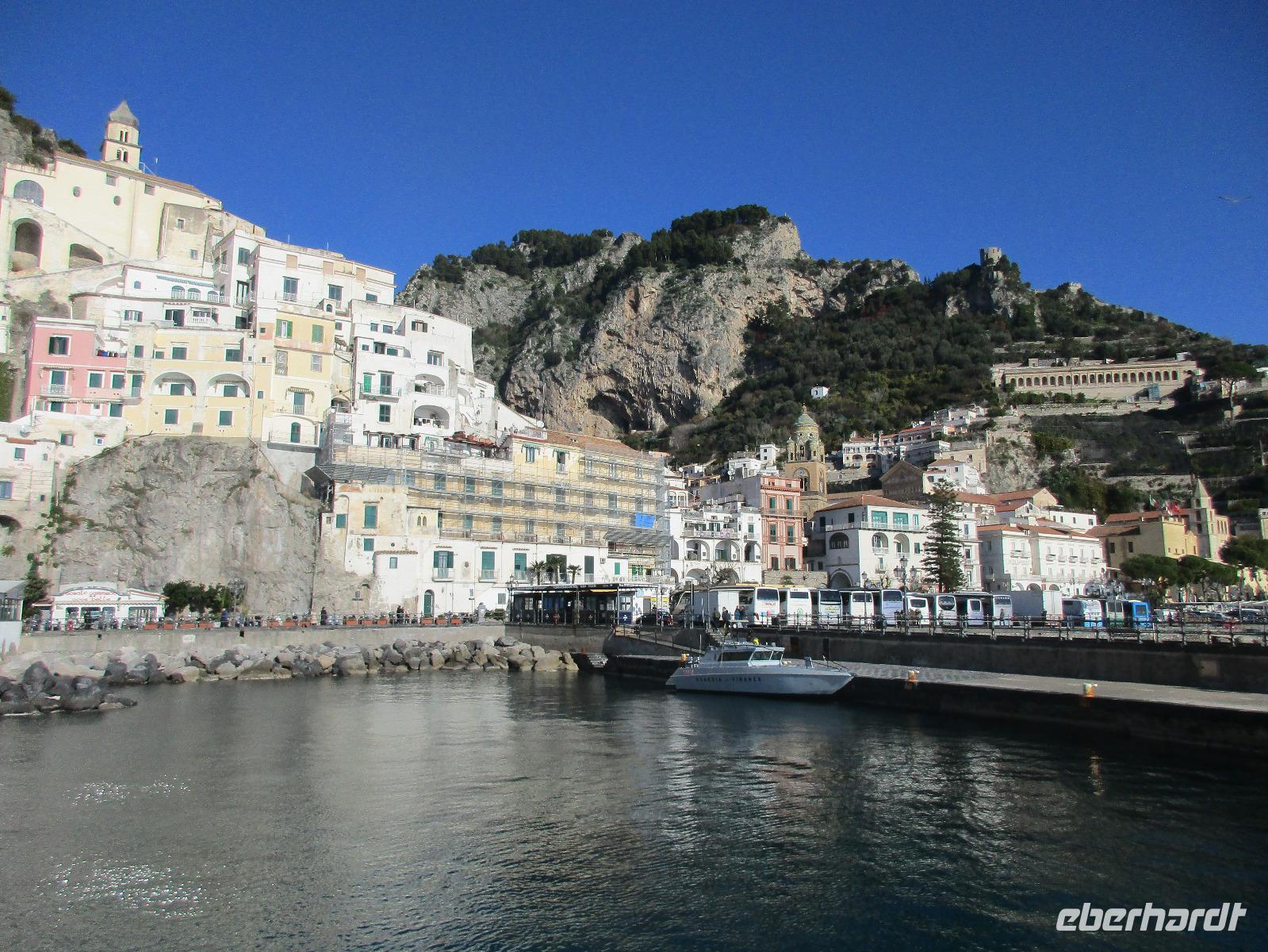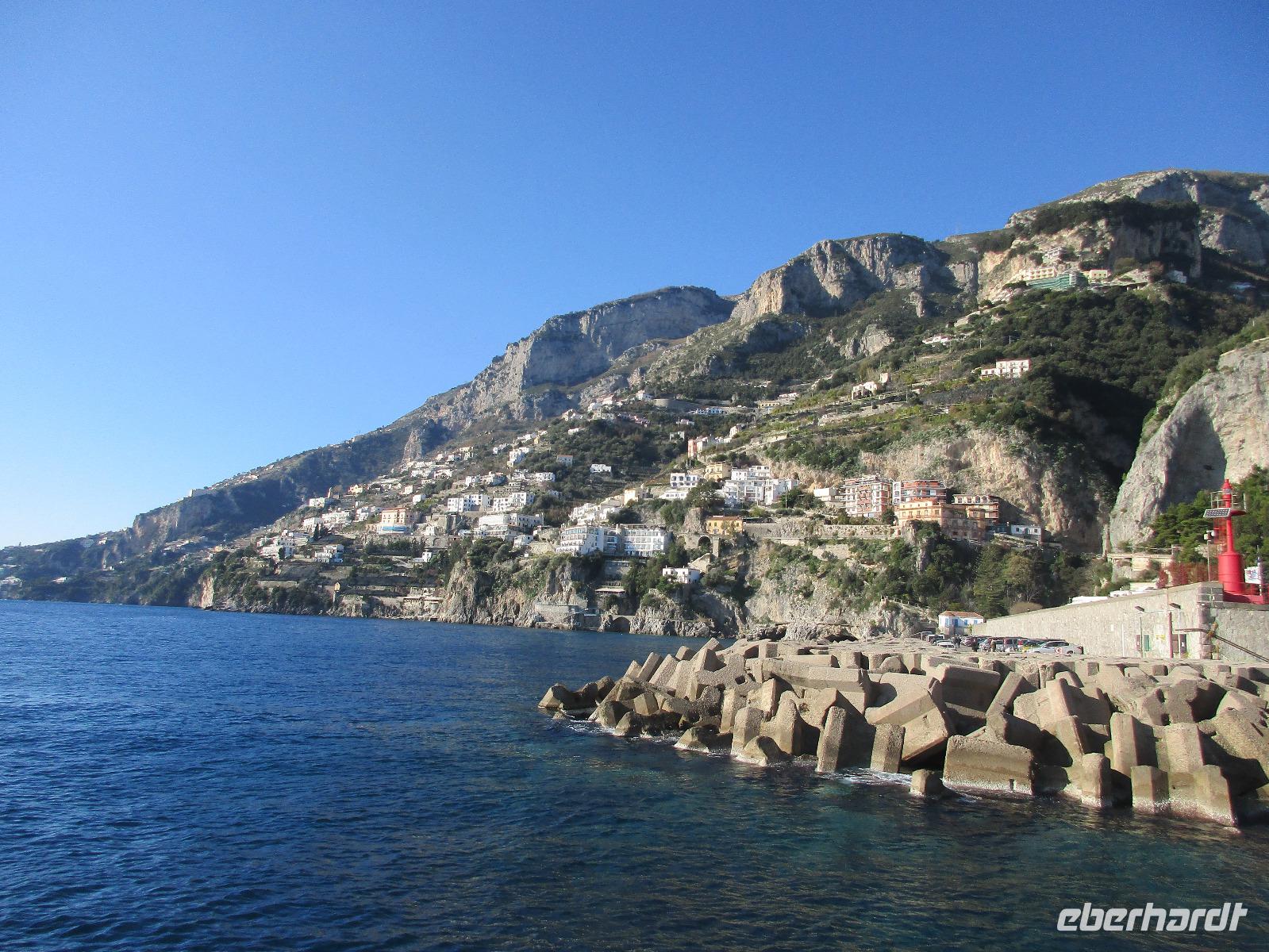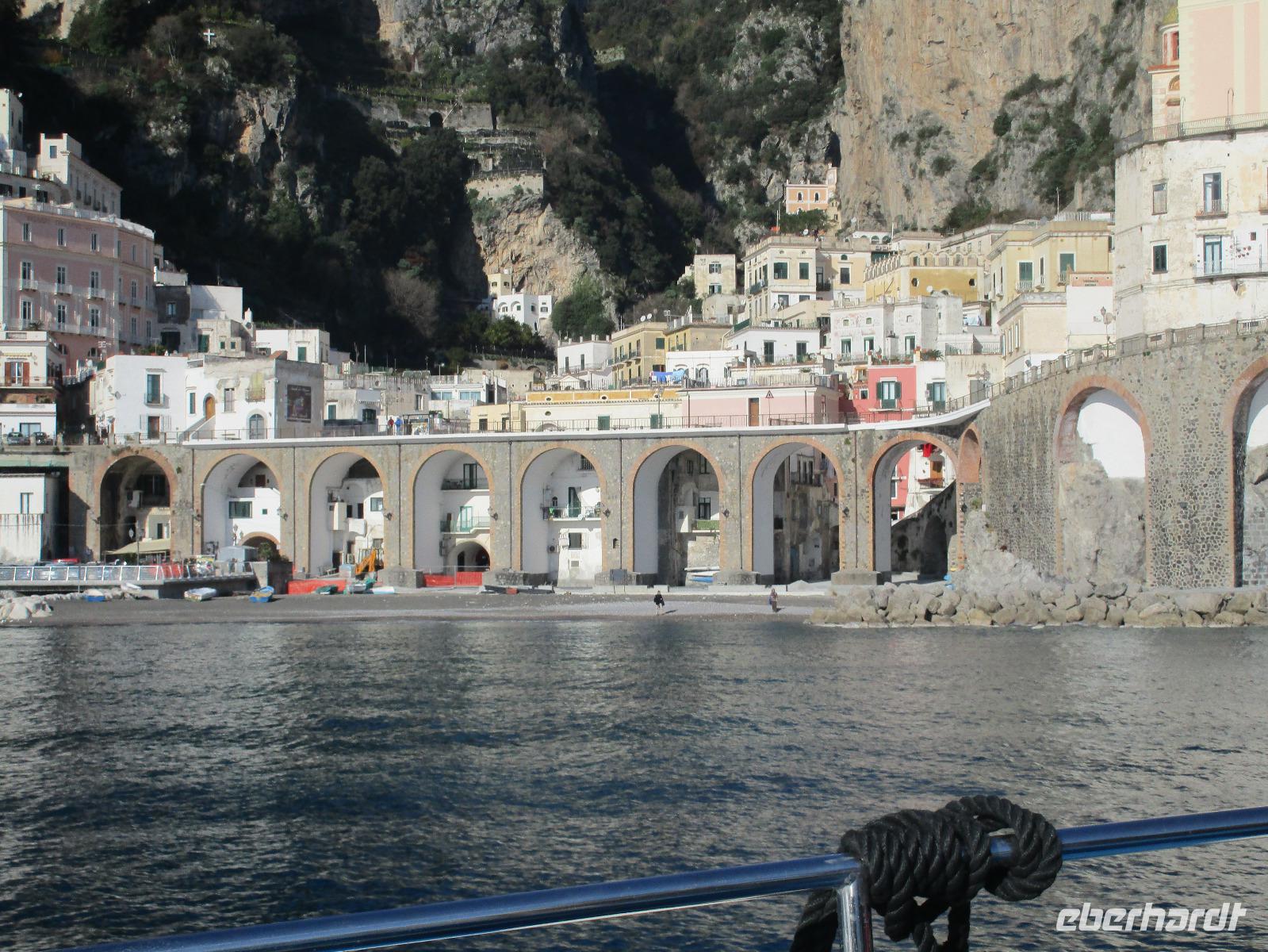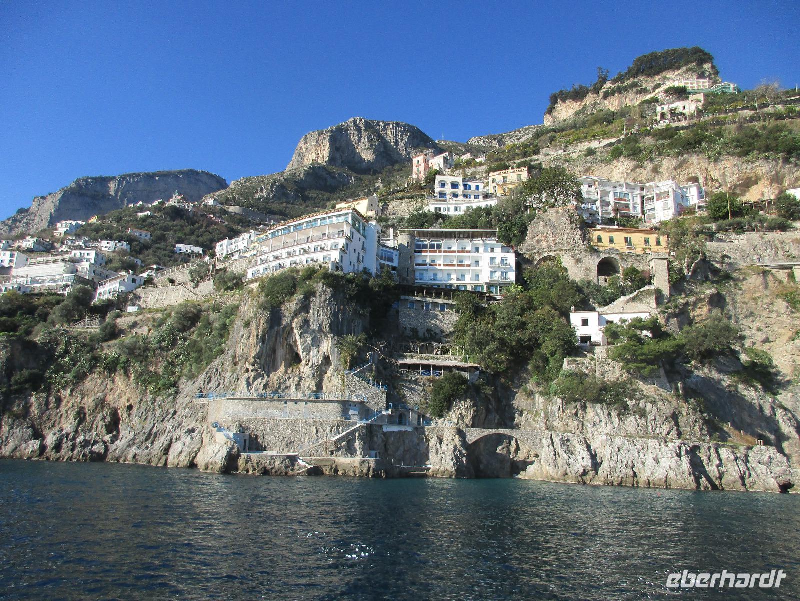 Nach dem morgendlichen Frühstück treffen wir uns 08.45 am Hotel mit Mathias und beginnen unsere Panoramatour an der Amalfiküste entlang. Zuerst passieren wir den kleinen Pass, der die sorrentinische Küste von der Amalfiküste trennt. Vorbei an steilen Felswänden und Zitronenhainen schlängelt sich die Straße an der Küste entlang. An kurzen Panoramastopps bekommen wir schon einen kleinen Vorgeschmack auf die Landschaft und die Umgebung. Während der Fahrt erzählt Mathias wieder jede Menge über Land und Leute und organisiert nebenbei auch noch eine kleine Küstenfahrt mit dem Boot. Gesagt, getan: Als wir in Amalfi ankommen, gehen wir direkt zum Pier, an dem wir nach italienischen 10 Minuten des Wartens auch von unserem Boot abgeholt werden und die Küstenpanoramafahrt beginnen. Vorbei an steinigen Küstenfelsen, vergessenen Fischerbuchten und versteinerten Elefanten können wir die Schönheit der Amalfiküste und ihrer kleinen Ortschaften bestaunen.