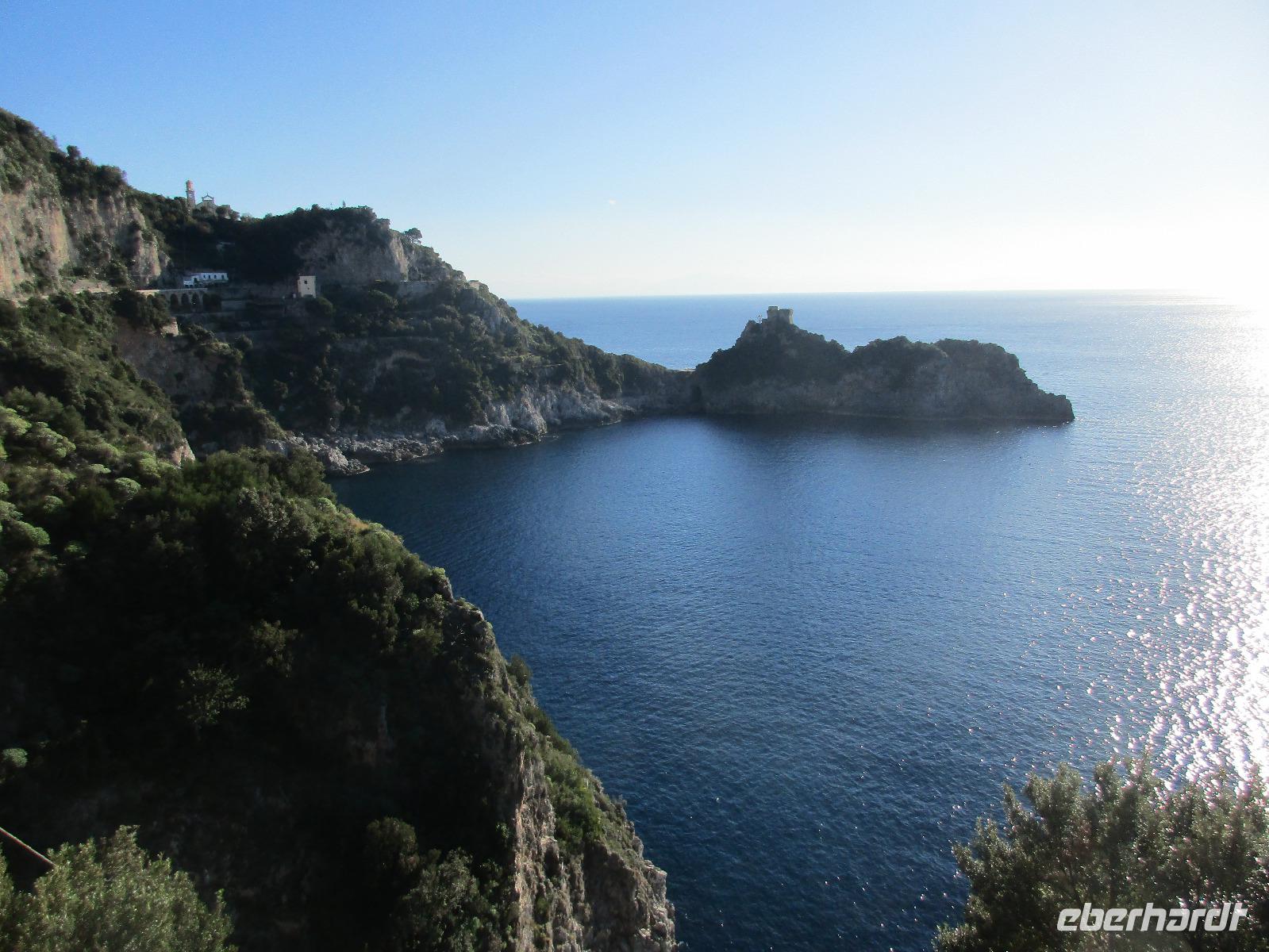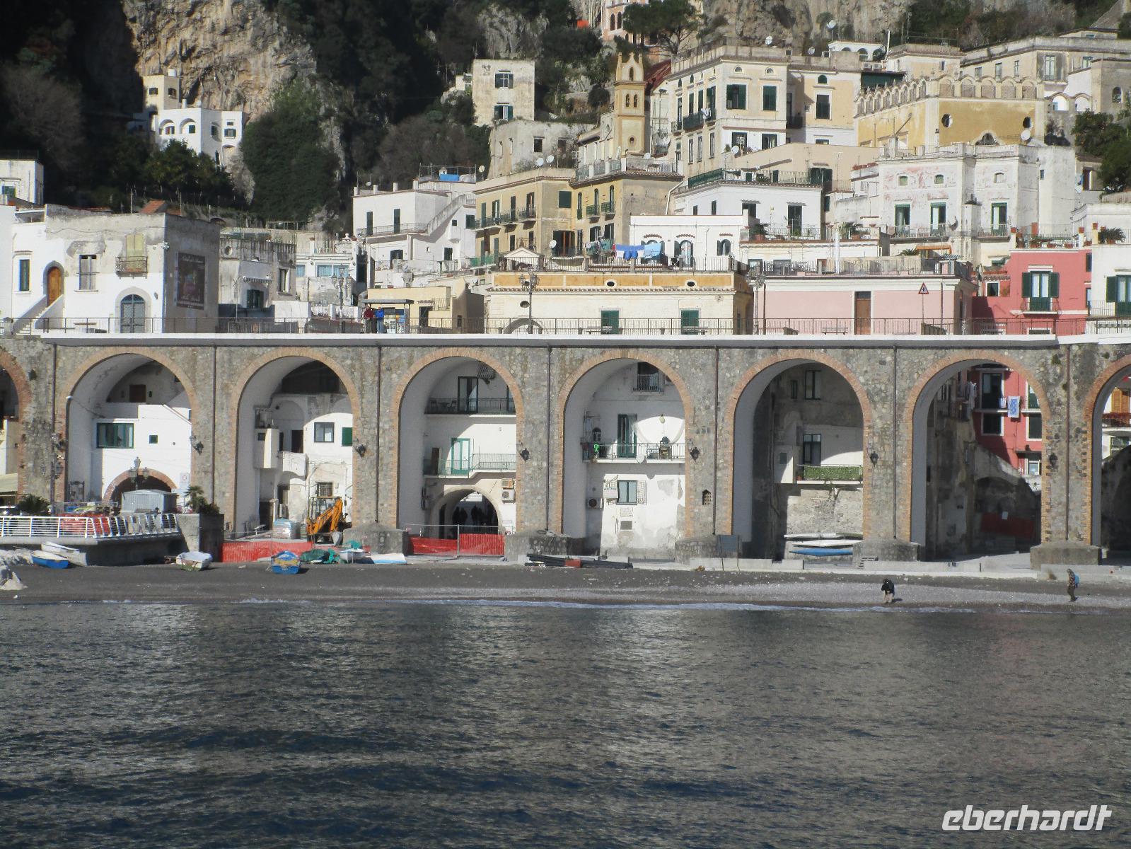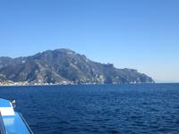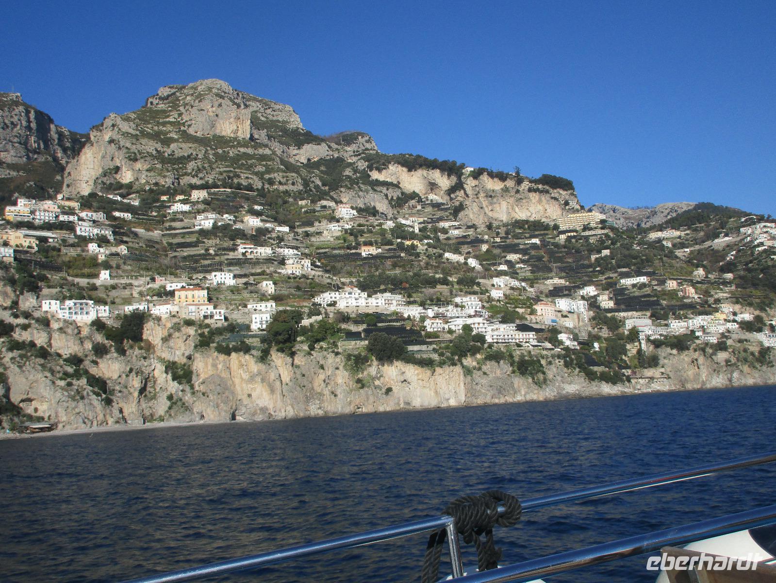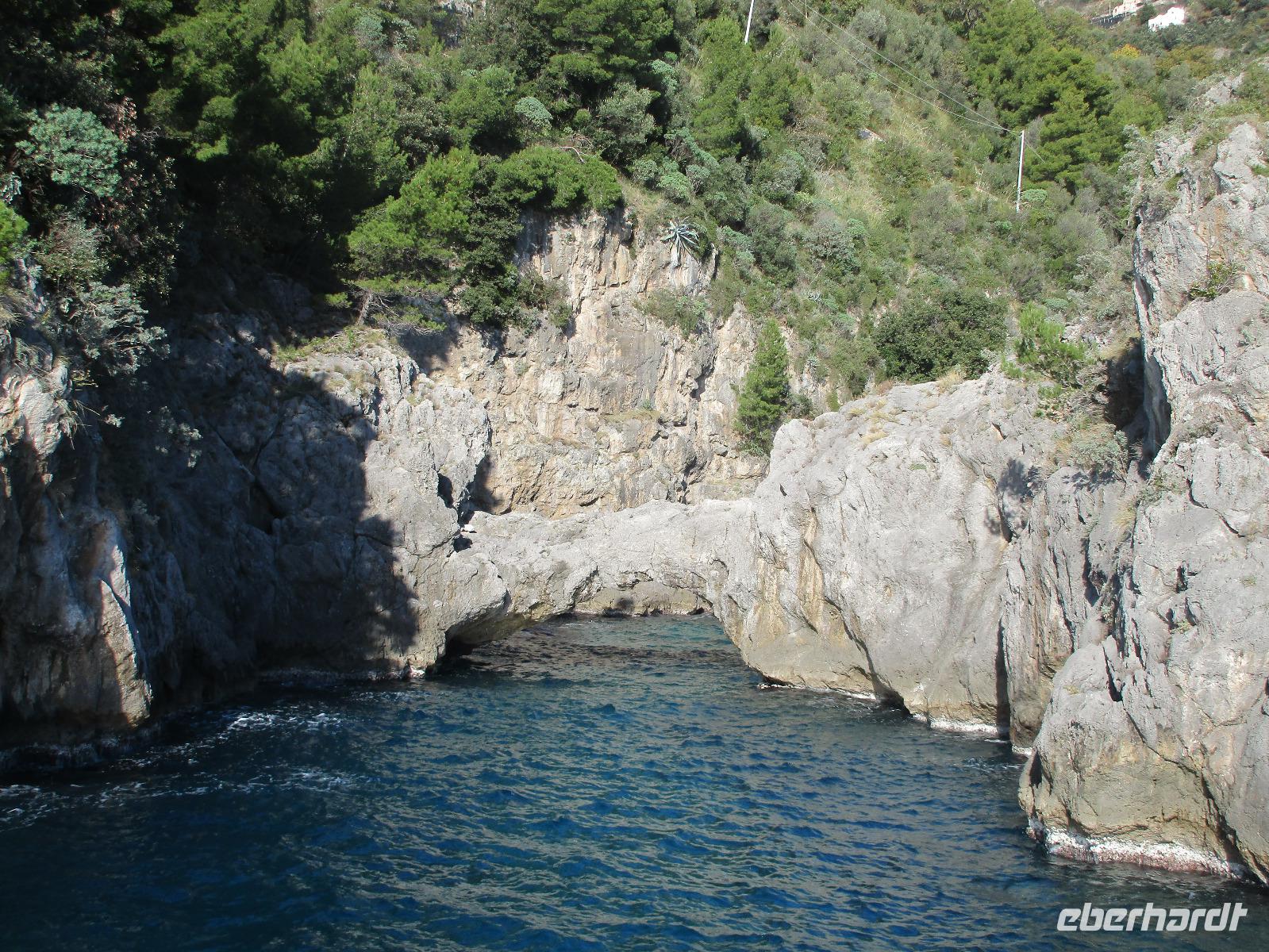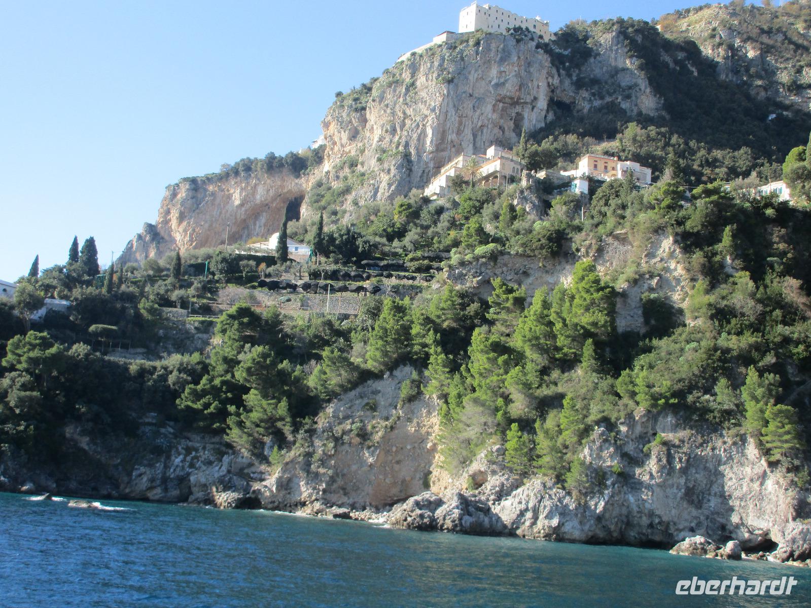 Nach dem morgendlichen Frühstück treffen wir uns 08.45 am Hotel mit Mathias und beginnen unsere Panoramatour an der Amalfiküste entlang. Zuerst passieren wir den kleinen Pass, der die sorrentinische Küste von der Amalfiküste trennt. Vorbei an steilen Felswänden und Zitronenhainen schlängelt sich die Straße an der Küste entlang. An kurzen Panoramastopps bekommen wir schon einen kleinen Vorgeschmack auf die Landschaft und die Umgebung. Während der Fahrt erzählt Mathias wieder jede Menge über Land und Leute und organisiert nebenbei auch noch eine kleine Küstenfahrt mit dem Boot. Gesagt, getan: Als wir in Amalfi ankommen, gehen wir direkt zum Pier, an dem wir nach italienischen 10 Minuten des Wartens auch von unserem Boot abgeholt werden und die Küstenpanoramafahrt beginnen. Vorbei an steinigen Küstenfelsen, vergessenen Fischerbuchten und versteinerten Elefanten können wir die Schönheit der Amalfiküste und ihrer kleinen Ortschaften bestaunen.