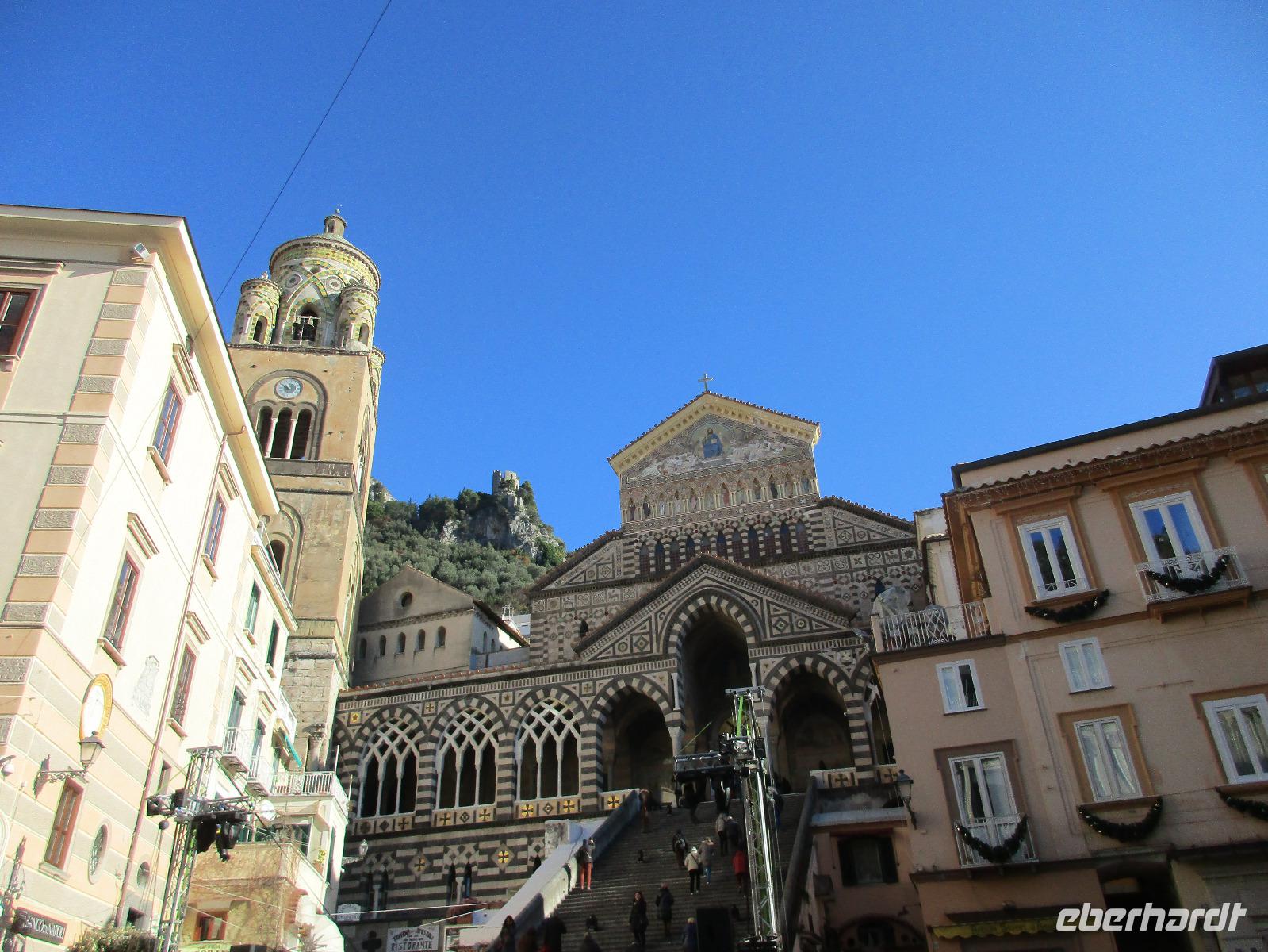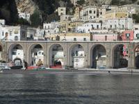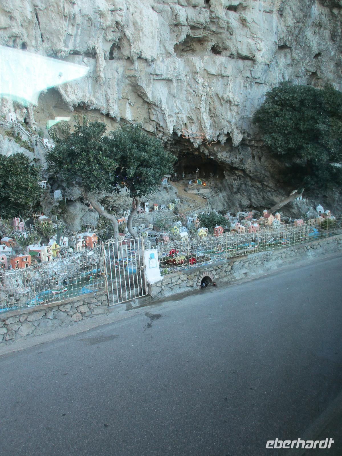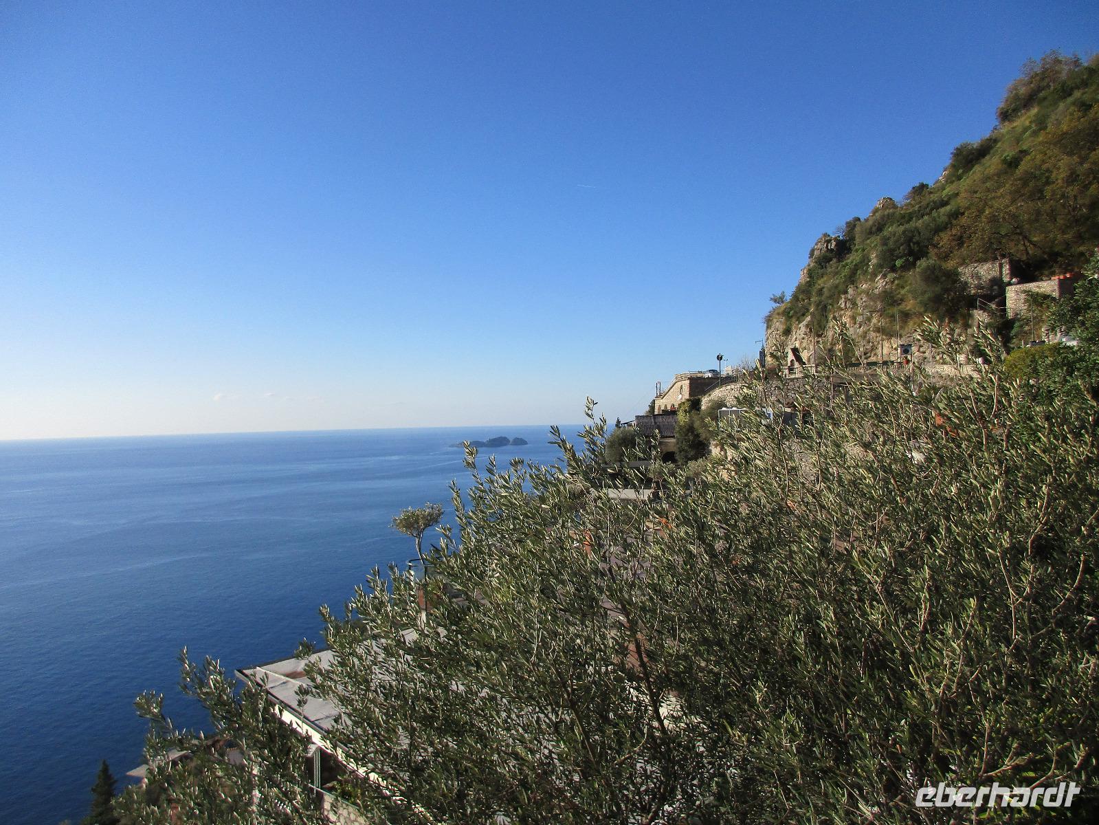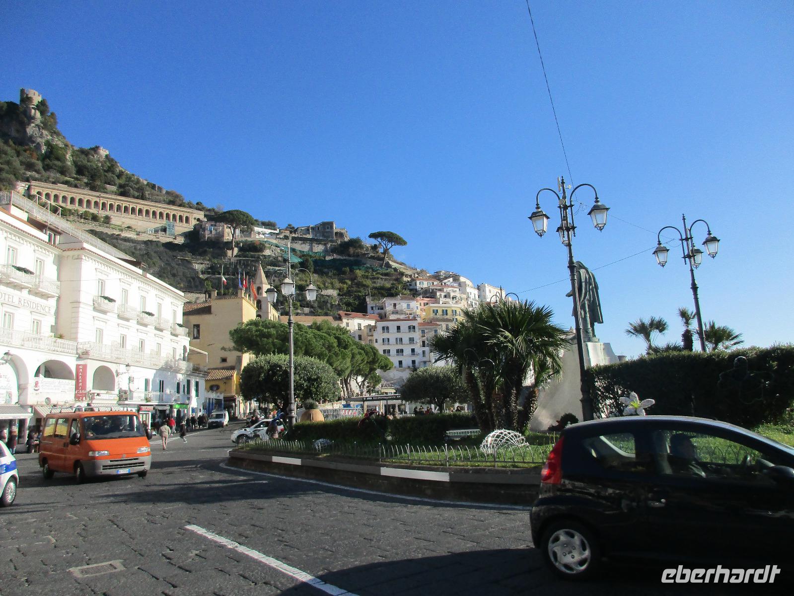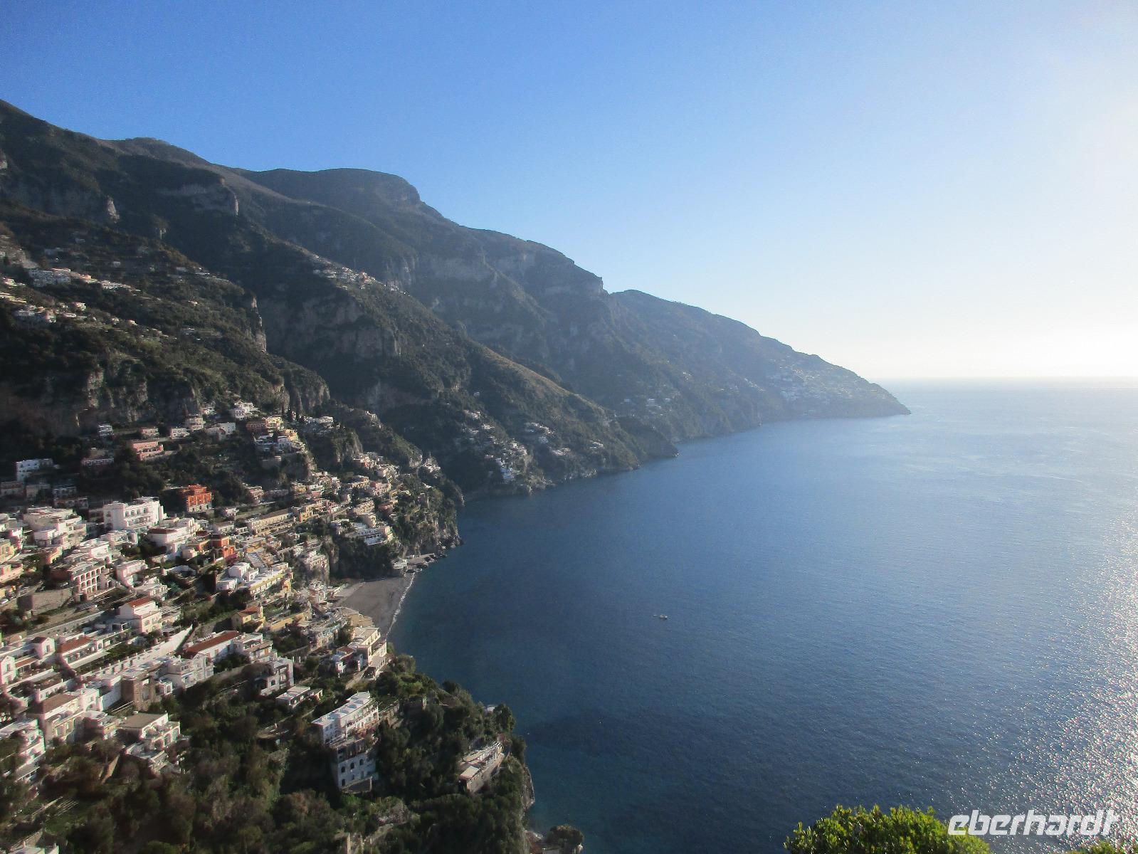 Nach dem morgendlichen Frühstück treffen wir uns 08.45 am Hotel mit Mathias und beginnen unsere Panoramatour an der Amalfiküste entlang. Zuerst passieren wir den kleinen Pass, der die sorrentinische Küste von der Amalfiküste trennt. Vorbei an steilen Felswänden und Zitronenhainen schlängelt sich die Straße an der Küste entlang. An kurzen Panoramastopps bekommen wir schon einen kleinen Vorgeschmack auf die Landschaft und die Umgebung. Während der Fahrt erzählt Mathias wieder jede Menge über Land und Leute und organisiert nebenbei auch noch eine kleine Küstenfahrt mit dem Boot. Gesagt, getan: Als wir in Amalfi ankommen, gehen wir direkt zum Pier, an dem wir nach italienischen 10 Minuten des Wartens auch von unserem Boot abgeholt werden und die Küstenpanoramafahrt beginnen. Vorbei an steinigen Küstenfelsen, vergessenen Fischerbuchten und versteinerten Elefanten können wir die Schönheit der Amalfiküste und ihrer kleinen Ortschaften bestaunen.