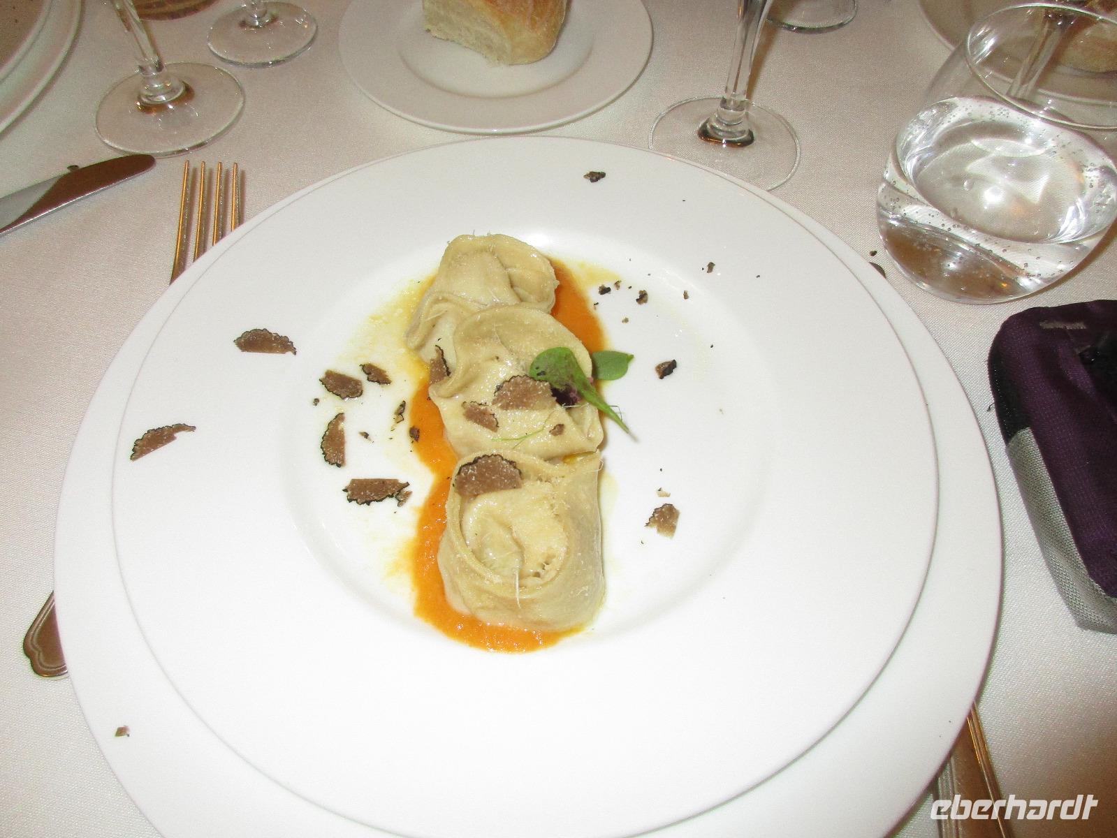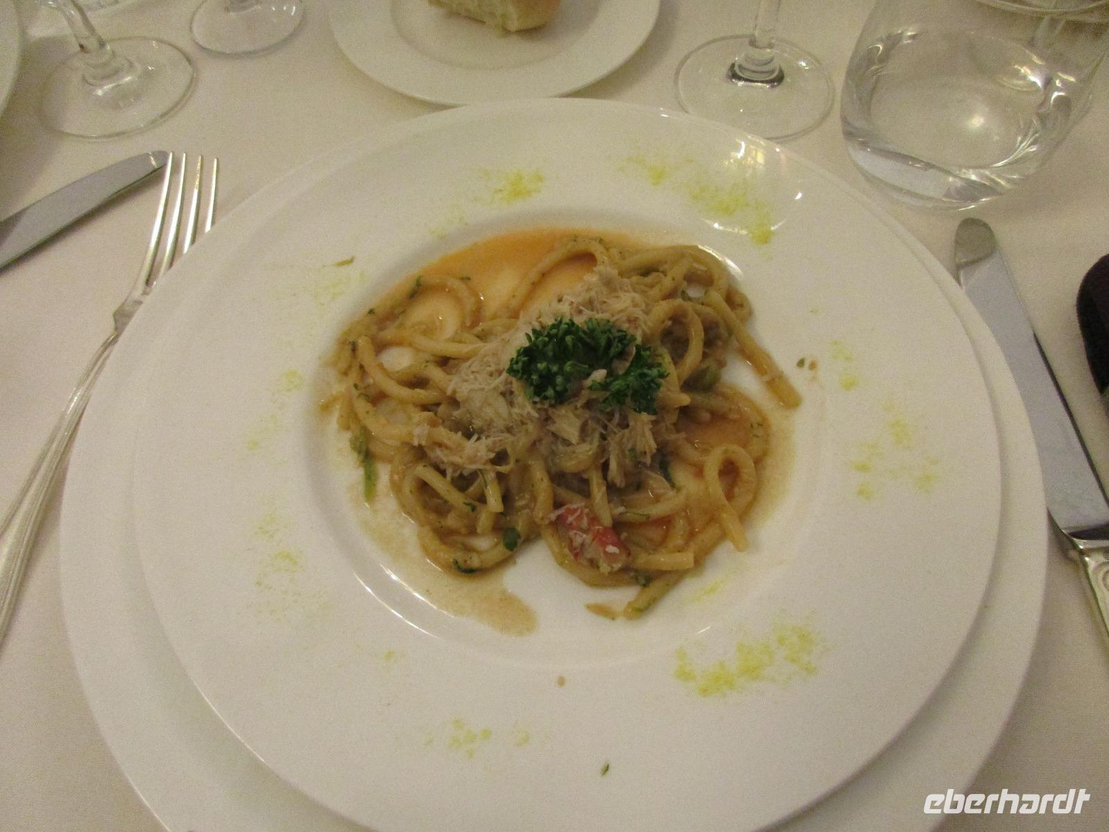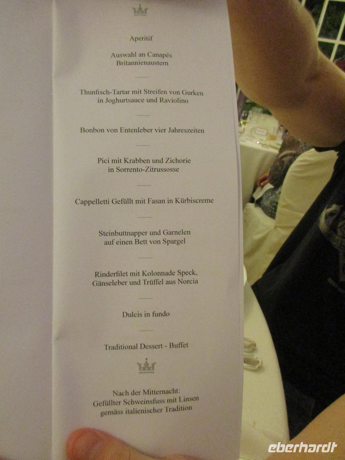 Begrüßt werden wir mit Champagner oder einem anderen Cocktail nach Wahl und kleinen Häppchen, sowie Austern. Nach dem Durst und Appetit angeregt wurden beginnt das Galadinner und das Programm. Zu italienischen Opern, vorgetragen von zwei Opernsängern aus Neapel, begleitet von Klaviermusik, beginnen wir unser Festmahl - ein Sieben-Gänge-Menü vom Feinsten. Vom Thunfischtartar über kleine Leberhäppchen, Krabben, Fasan und Rindslende bis hin zu einem spektakulär angerichteten Dessert mit Eis und Schnaps ist bei diesem Abendessen für jeden Geschmack etwas dabei.