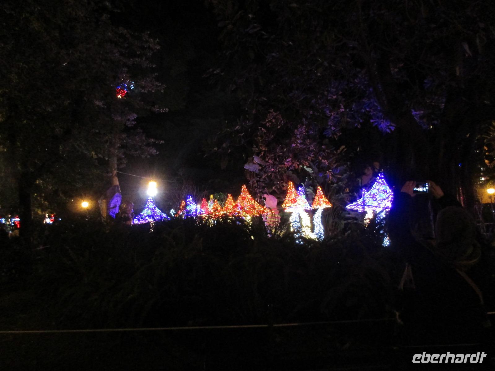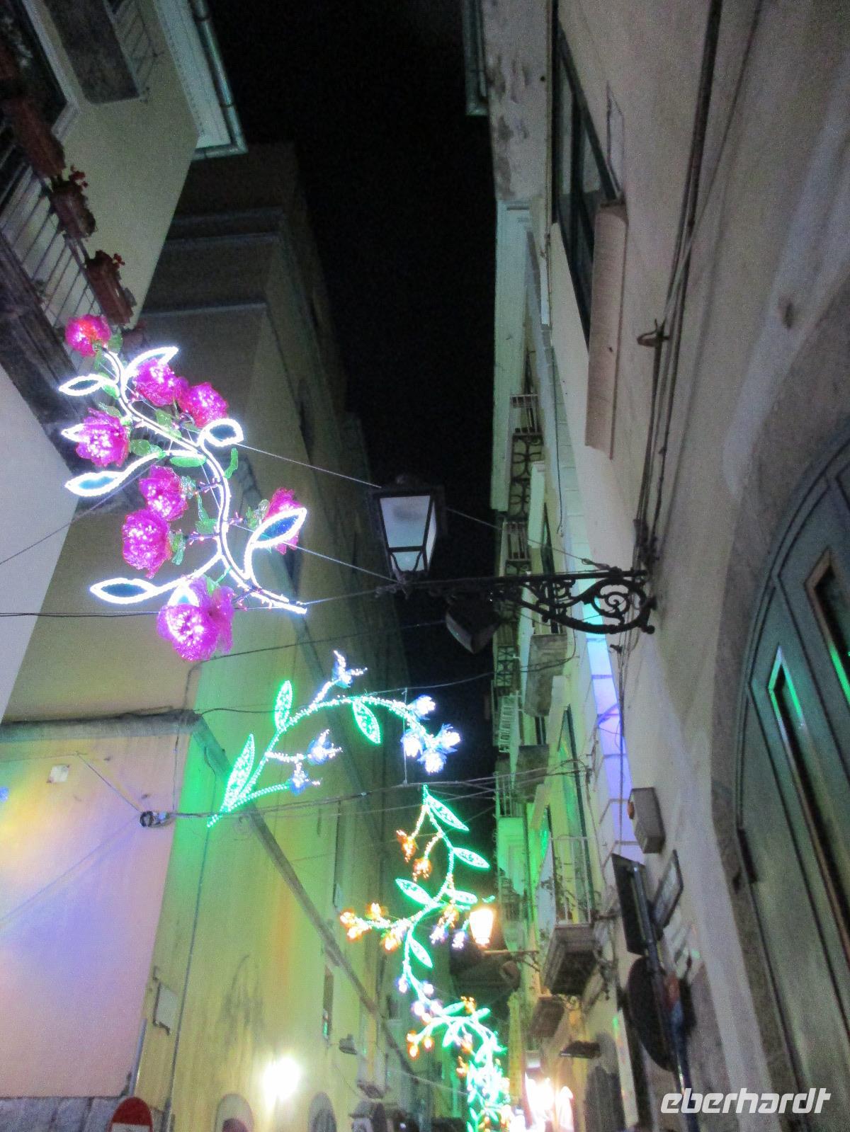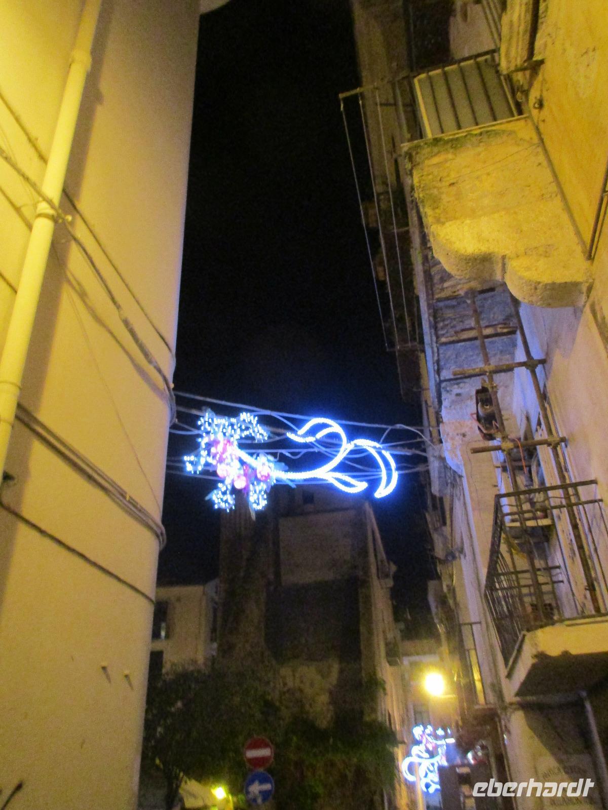 Danach machen wir in einem kleinen Café noch eine kleine Pause, in der Mathias und ich noch eine Abschiedsüberraschung überreichen wollen und nach einer weiteren kurzen Besichtigung des Doms schlendern wir die Straßen Salernos entlang und bestaunen die farben - und motivreichen Weihnachtsbeleuchtungen, die nicht nur in jeder Straße hoch über den Köpfen der Besucher schweben, sondern auch einen ganzen Park hell in allen Farben erleuchten.