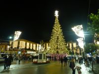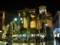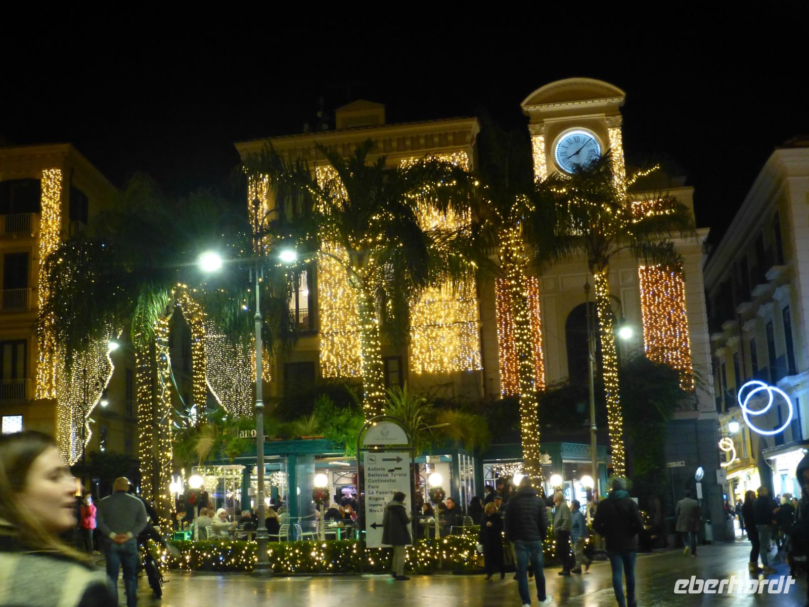 Das ist der Gewinn des frühen Aufstehens: um 16 Uhr strebt ein munteres Häuflein in die Stadt. Und Ciro hat recht: Der Marktplatz mit seiner Beleuchtung ist einer der schönsten, den wir gesehen haben. Ein riesengroßer Baum mit unzähligen Lichtern beherrscht die Mitte, rundherum umstanden von Häusern, deren Fassaden mit Lichterketten geschmückt sind. Die hohen Palmenstämme sind mit Lichtergirlanden umwickelt und strahlen mit den zyklamfarbenen Alpenveilchen in großen Blumentrögen und in den zahlreichen Blumenbeeten um die Wette.
