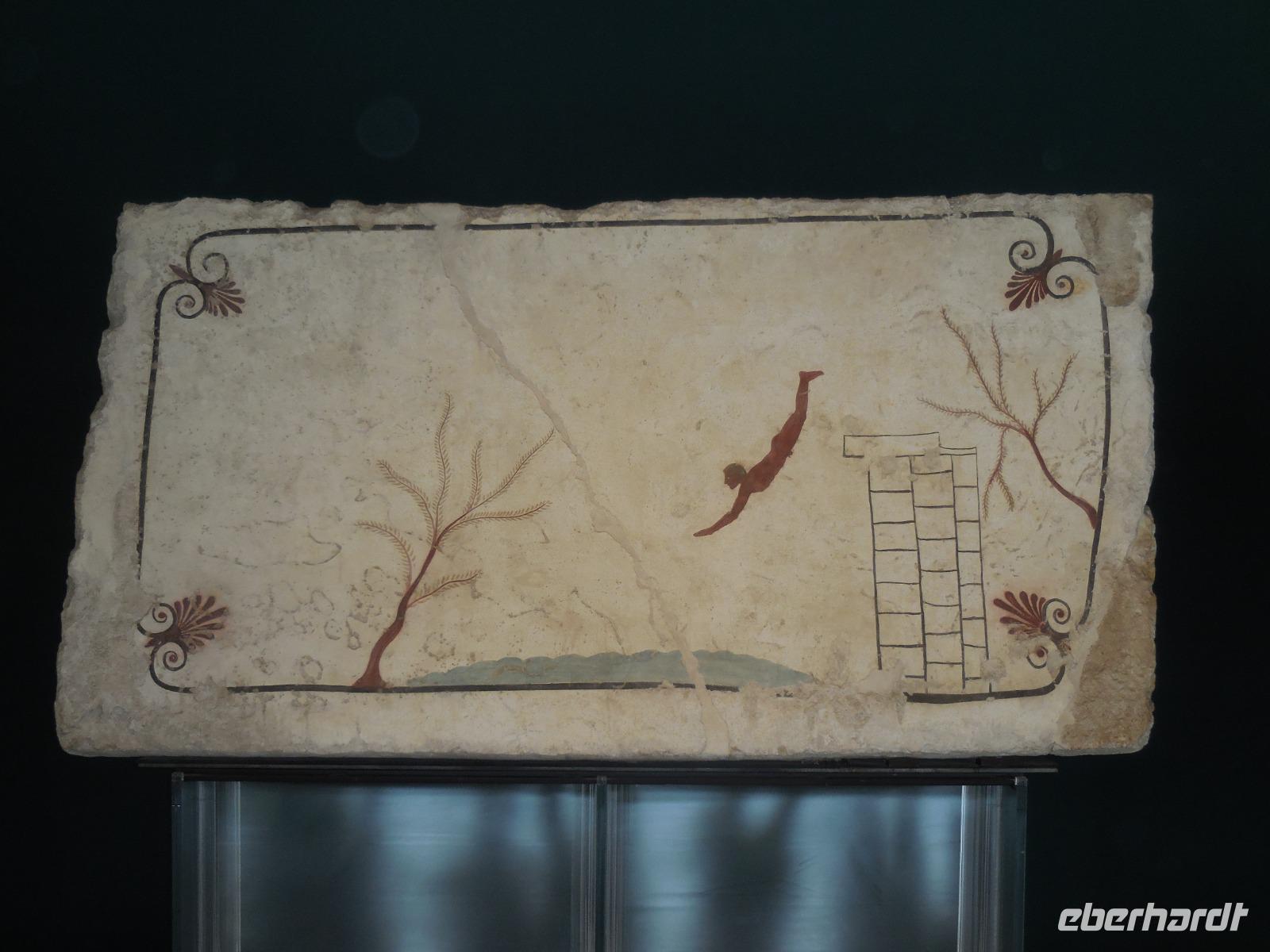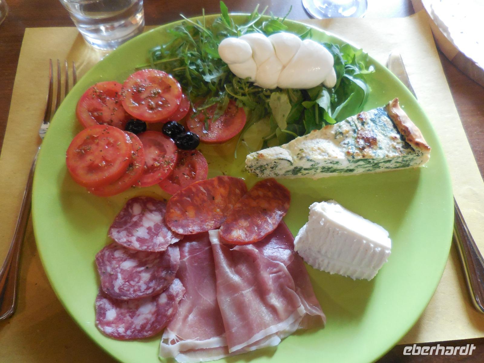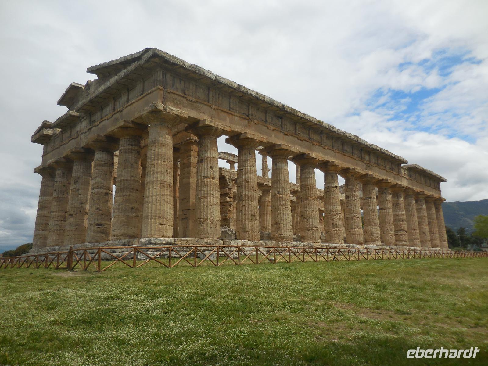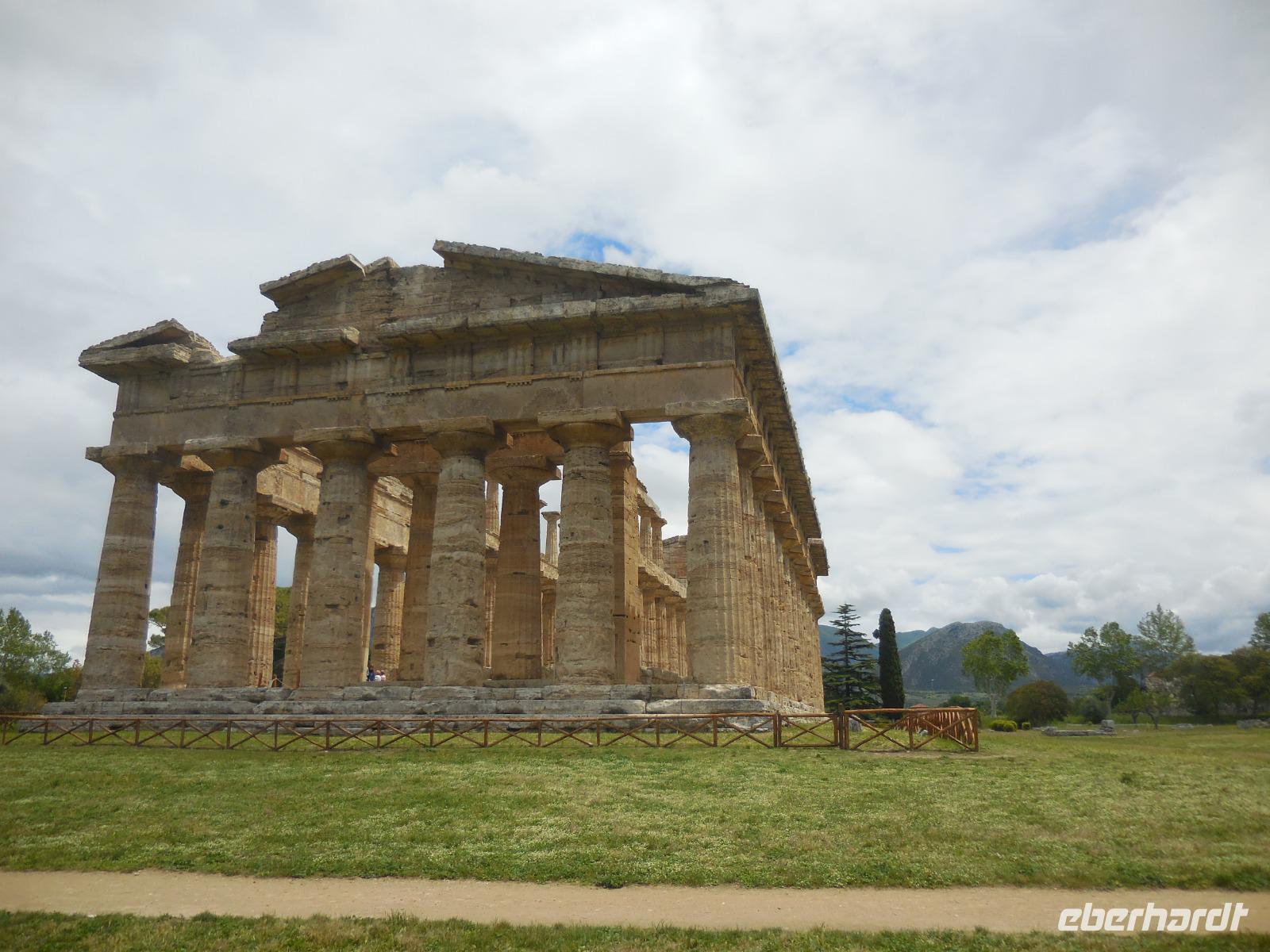 Ein wenig früher starten wir heute in Richtung Norden und nehmen Angelo, unseren örtlichen Reiseleiter, unterwegs von der "Sansibar" mit auf. Da die Büffel Frühaufsteher sind, müssen wir auch zeitig da sein. Der frische Mozzarella wird früh ab 4 Uhr morgens zubereitet und steht um 9 Uhr zum Verkauf bereit. Pünktlich sind wir da und unternehmen mit einer Schweizerin einen Rundgang über diese biologische Farm der Büffel, die hier in Scharen vorkommen. In der Firma, wo wir die Besichtigung haben, werden etwa 200 Tiere gehalten und wir schauen uns auch die Relaxzone dieser Tiere an. Wer kann als Tier schon behaupten, dass es ein eigenes Massagestudio hat? Nach unserem Rundgang probieren wir natürlich den frischen Büffelmozzarella und auch die gute Schokolade, die sie hier machen. Wirklich köstlich können wir da nur feststellen. Zum Abschluss probieren wir noch einen Caffé oder einen Cappuccino. Weiter bringt uns der Bus von der Büffelfarm zu den nahe gelegenen Tempeln von Paestum. Wir besichtigen zuerst das interessante Museum gegenüber der Tempelanlagen und bestaunen die vielen riesigen Grabkammern und auch das Bild der Taucher ist sehr beeindruckend. Anschließend laufen wir mit etlichen italienischen Schülern und bei Nieselregen durch die Anlage mit den einzigartigen Tempeln von Paestum. Wir bestaunen alle drei großen Tempel und Angelo erzählt uns Wissenswertes und Interessantes dazu. Der Regen lässt nun auch nach und wir fahren mit dem Bus zu einer Azienda in die Nähe, um hier unser heutiges Mittagessen bei Assunta einzunehmen. Hier probieren wir köstlichen Rot-, Weiß- und Roséwein und genießen dazu ein fantastisches Mittagessen. Das allerbeste hier ist das Dessert: ein Ricotta-Schokoladen-Streuselkuchen - ein Gedicht!!! Als wir alle satt sind, unternehmen wir noch einen kleinen Rundgang über den 14 Hektar großen Hof mit Weinfeldern und Olivenbaumfeldern. Gegen 16:30 Uhr fahren wir in einer guten Stunden zurück zum Hotel und freuen uns auf das umfangreiche Abendessen mit dem köstlichen Vorspeisenbuffet.