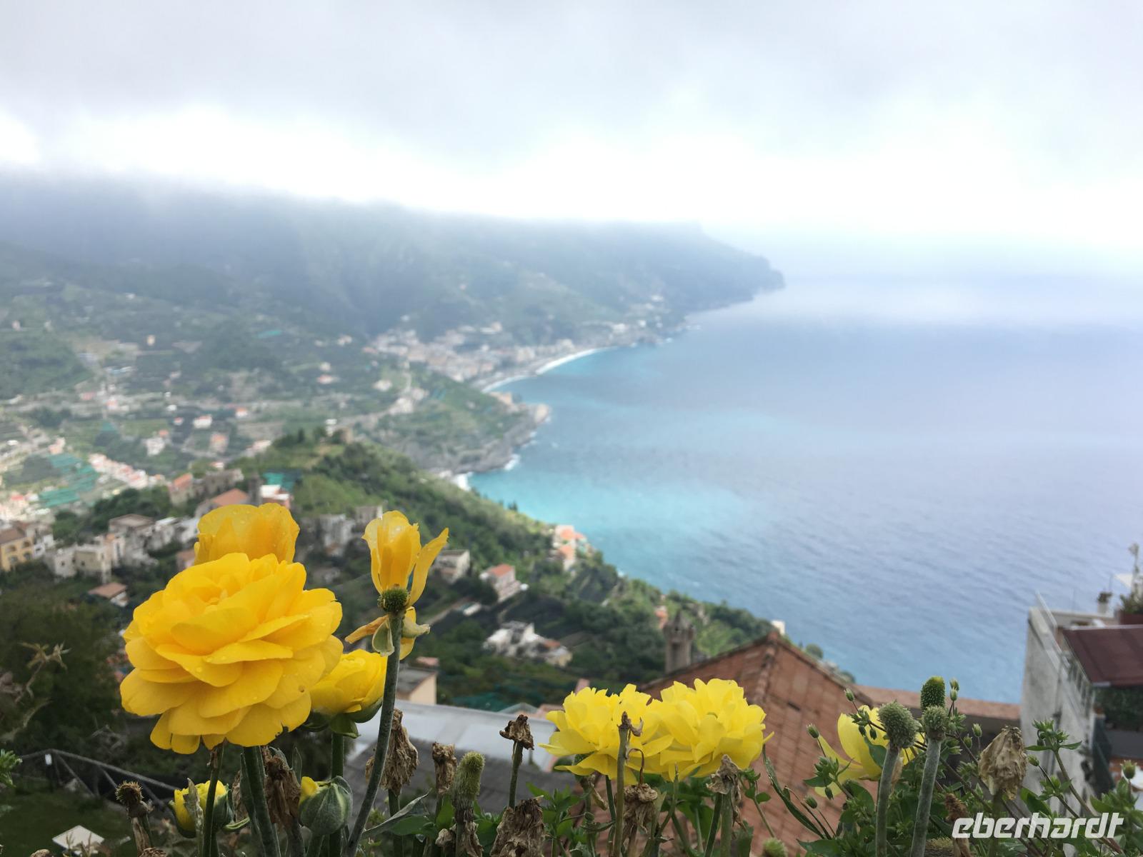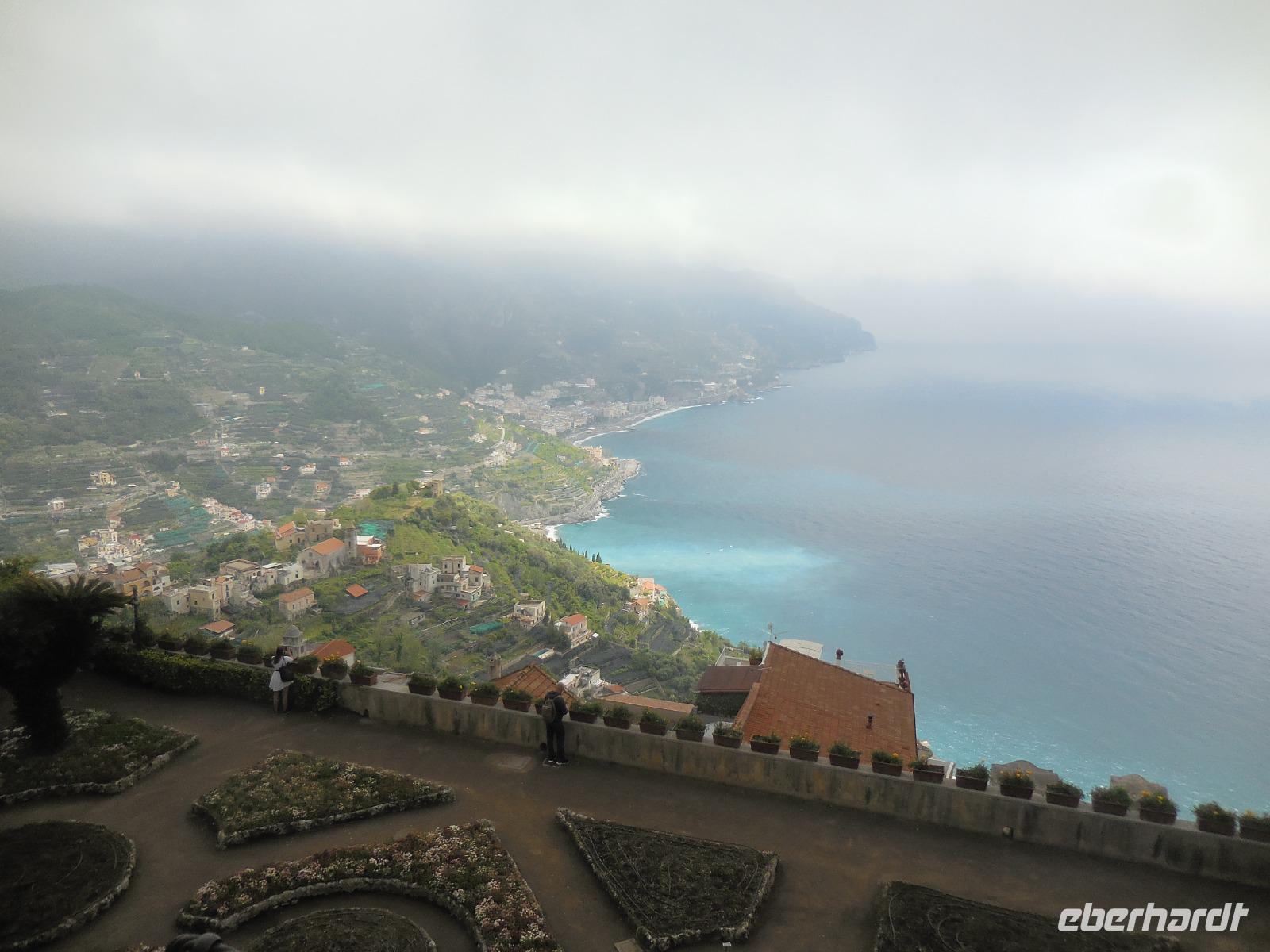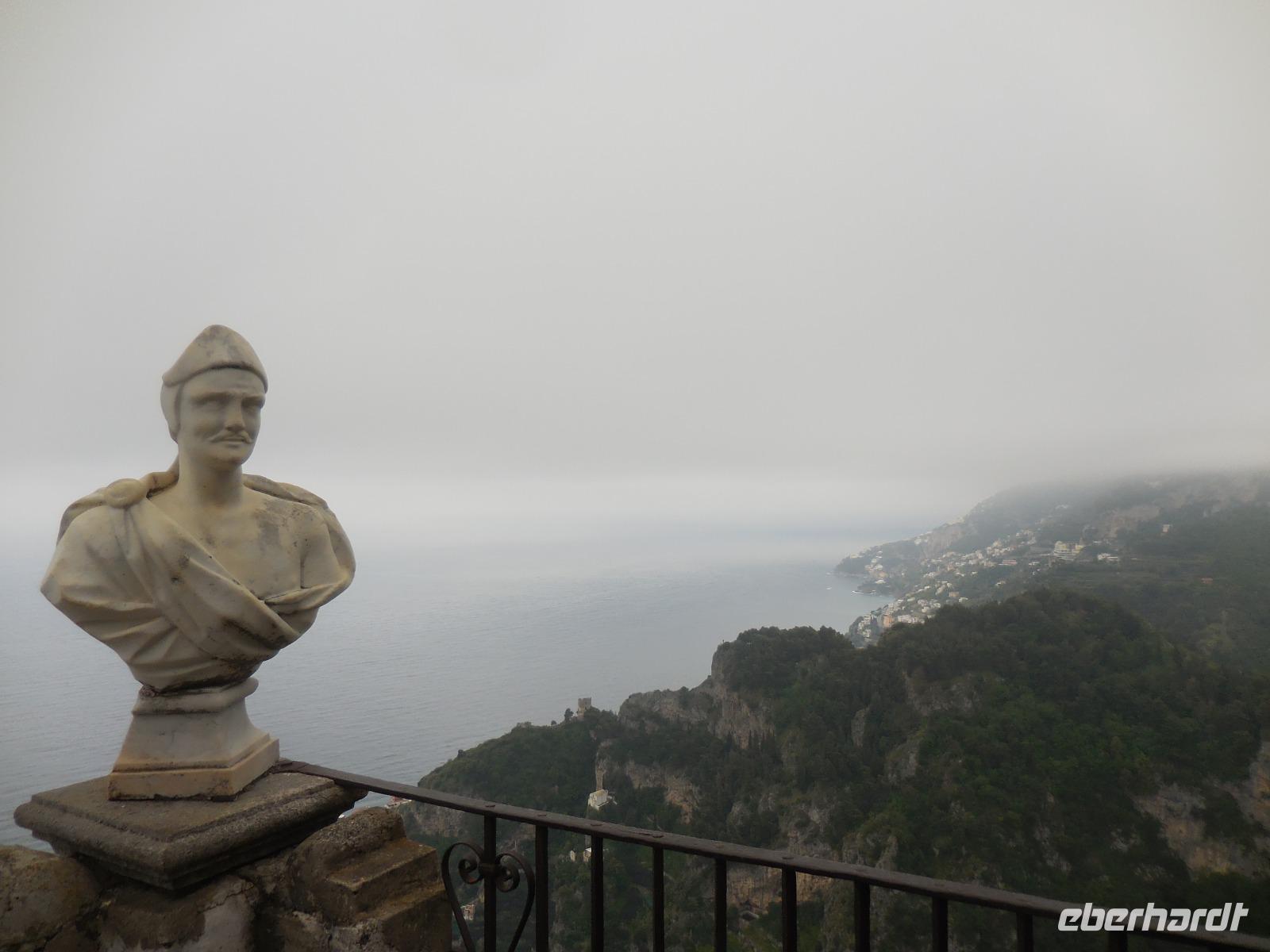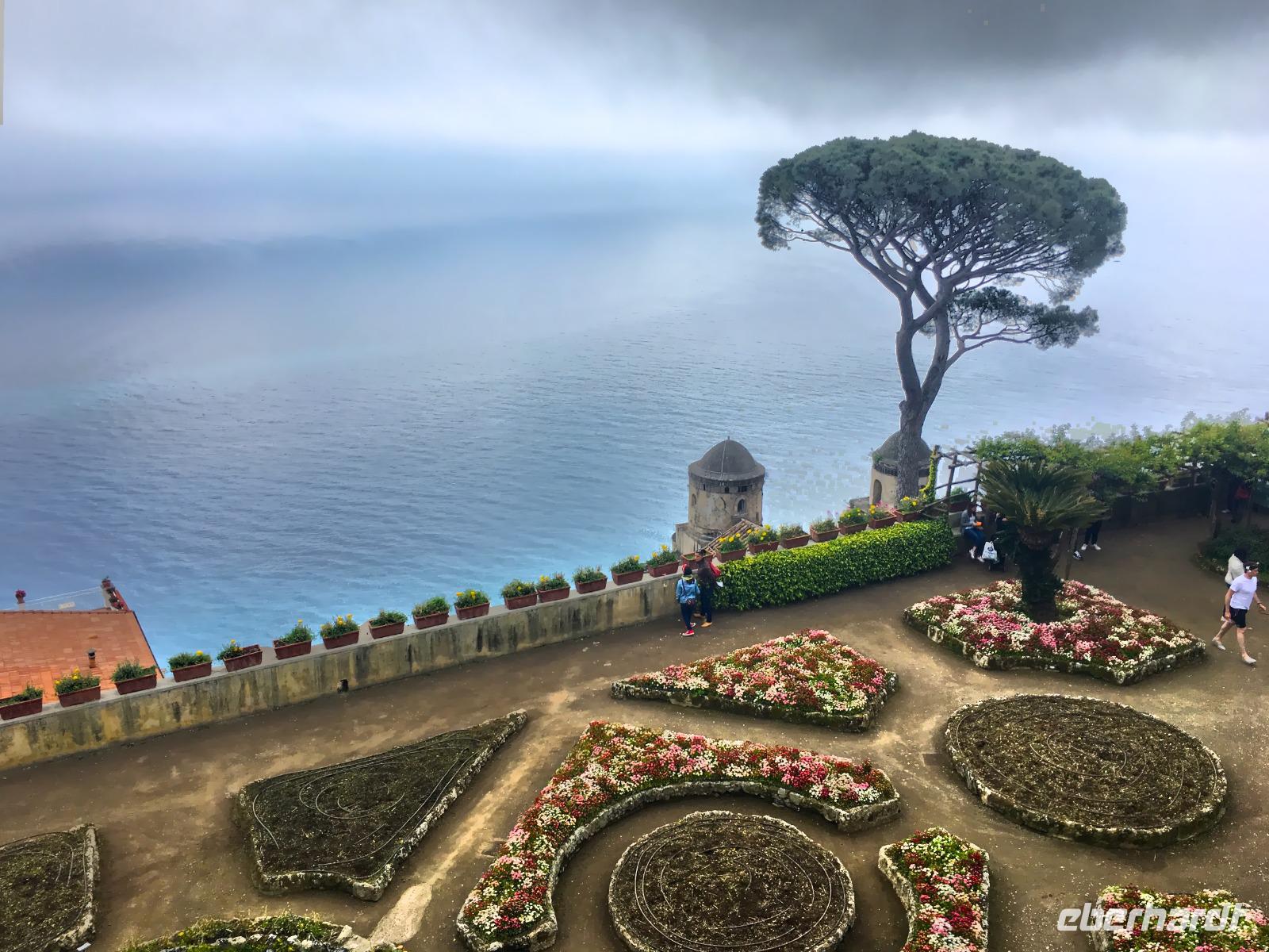 6:30 Uhr müssen wir heute schon unser Frühstück einnehmen, denn ein langer Ausflugstag steht uns bevor. Pünktlich um 7 Uhr fahren wir ab und nehmen Angelo mit an Bord. Leider erfahren wir kurz vor Salerno, dass der Bootsbetrieb auf der ganzen Küste der Amalfiküste heute eingestellt bleibt und das Meer zu unruhig ist. Wir sehen auch den ganzen Tag über kein einziges Schiff auf dem Meer - nur hohe Wellen, die am Strand ankommen. Demzufolge gestalten wir den Tag sehr flexibel und kaufen kurzerhand zwei Genehmigungen für unseren Bus in Ravello und in Amalfi, damit wir den heutigen Ausflug in abgewandelter Form per Bus absolvieren können. Wir bereisen die berühmte Amalfitana vom Süden aus mit dem Bus und beginnen mit dem kleinen Örtchen Vietri sul Mare. Das ist der erste oder der letzte Ort der Amalfiküstenstraße (je nachdem, wie rum man diese bereist) und kaum ein Tourist nimmt sich die Zeit, dieses kleine Städtchen anzusehen. Wir nehmen uns diese Zeit und bewundern die vielen schönen Majolika-Fliesen an den Hauswänden. Diese farbig bemalten zinnglasierten italienischen Keramikfliesen sind aus dem 15. und 16. Jahrhundert und es gibt so viele wunderschöne Farben und Motive zu sehen. Ein wirklich schöner Anblick! Kurze Zeit später sitzen wir wieder im Bus und fahren hinauf nach Ravello, was eigentlich gar nicht auf unserem heutigen Plan steht. Ravello ist bekannt für die seit 1953 jährlich stattfindenden Richard-Wagner-Festspiele im Sommer. Wir werden später den Schauplatz dieses Festivals bewundern. Das Wetter ist leider nicht das allerbeste und es tröpfelt hier und da mal wieder, aber das tut unserer Stimmung keinen Abbruch. Wir erreichen den Hauptplatz von Ravello mit der Kathedrale San Pantaleone und laufen zunächst zur Villa Cimbrone. Der wunderschön angelegte Garten ist einmalig anzuschauen und hat viele Dichter, Künstler und Musiker schon inspiriert. Ebenso die byzantinisch geprägte Villa Rufolo aus dem 13. Jahrhundert wo die Musikfestspiele stattfinden und wo sich im Jahr 1880 Richard Wagner inspirieren lassen hat und Klingsors Garten sah.
