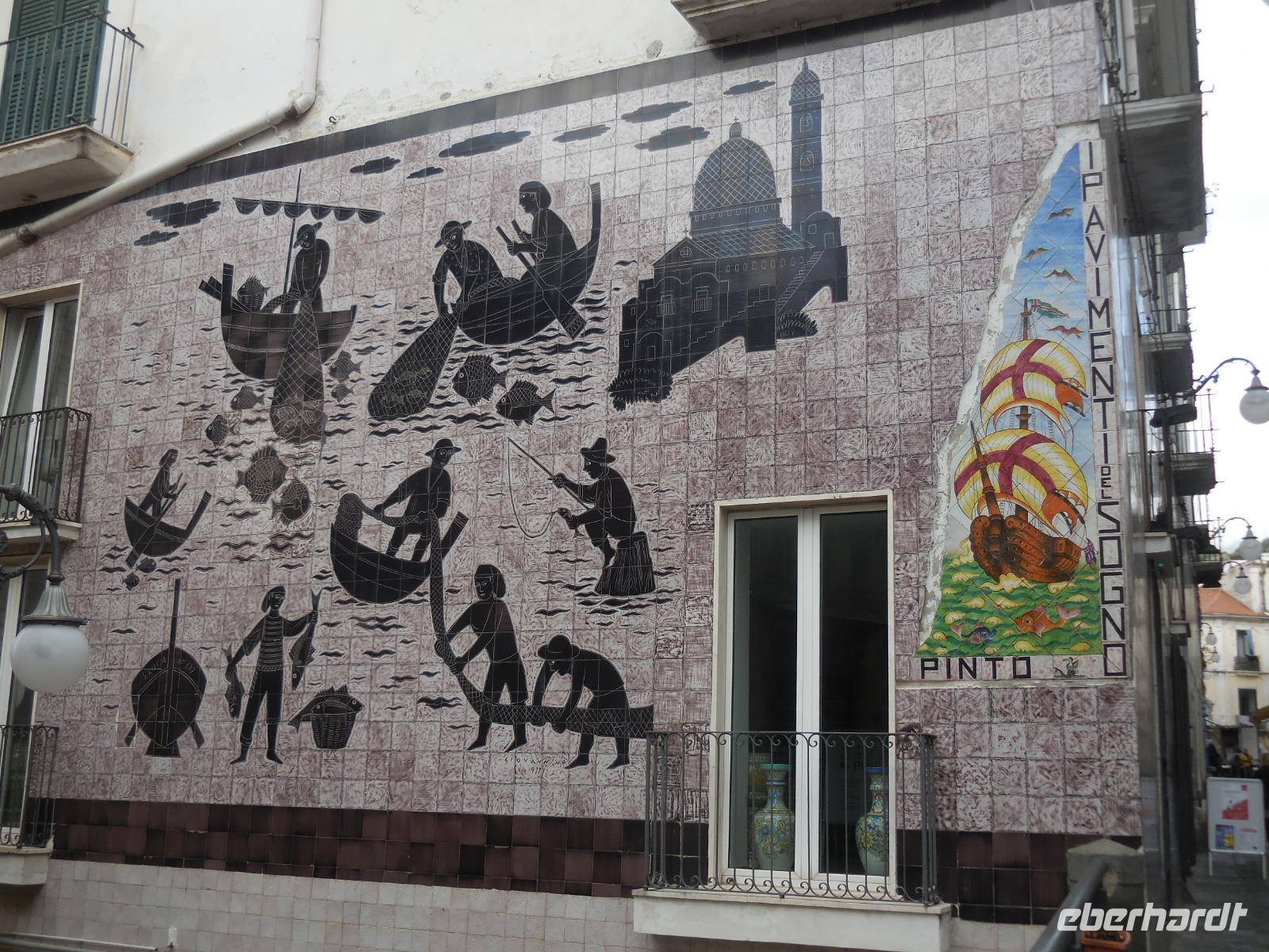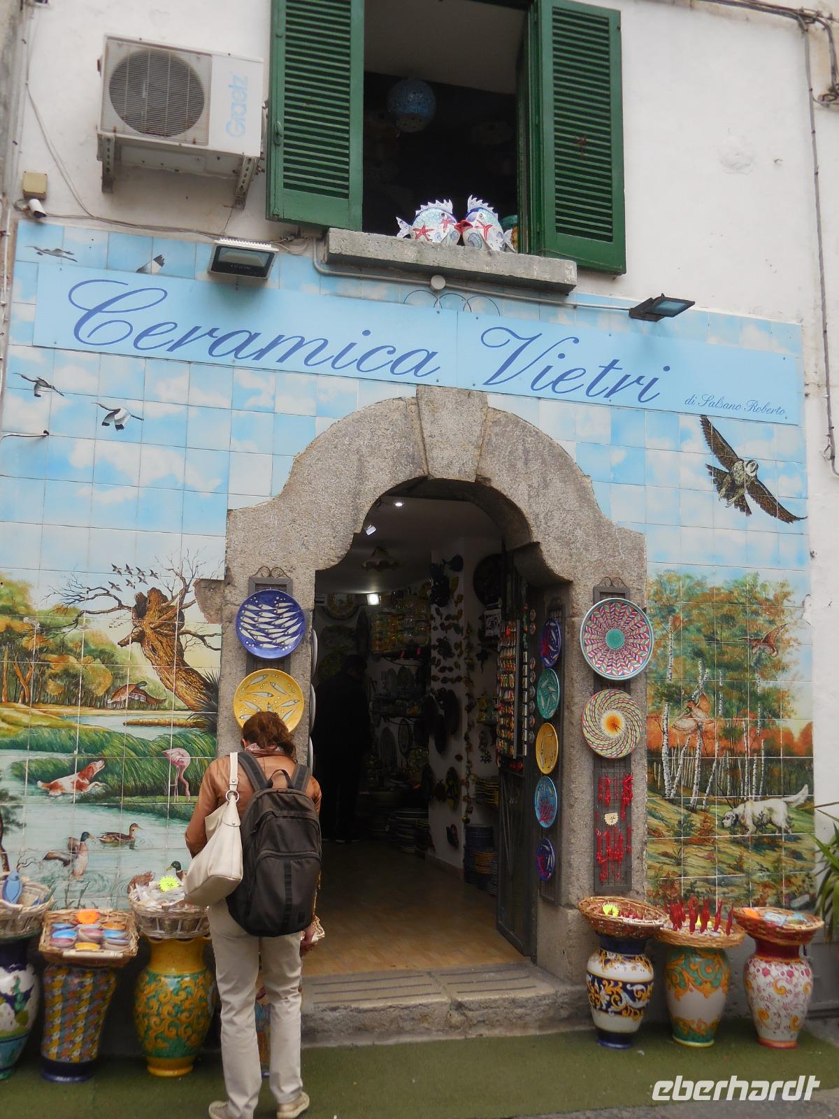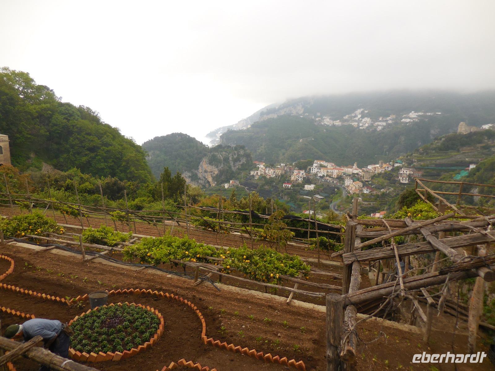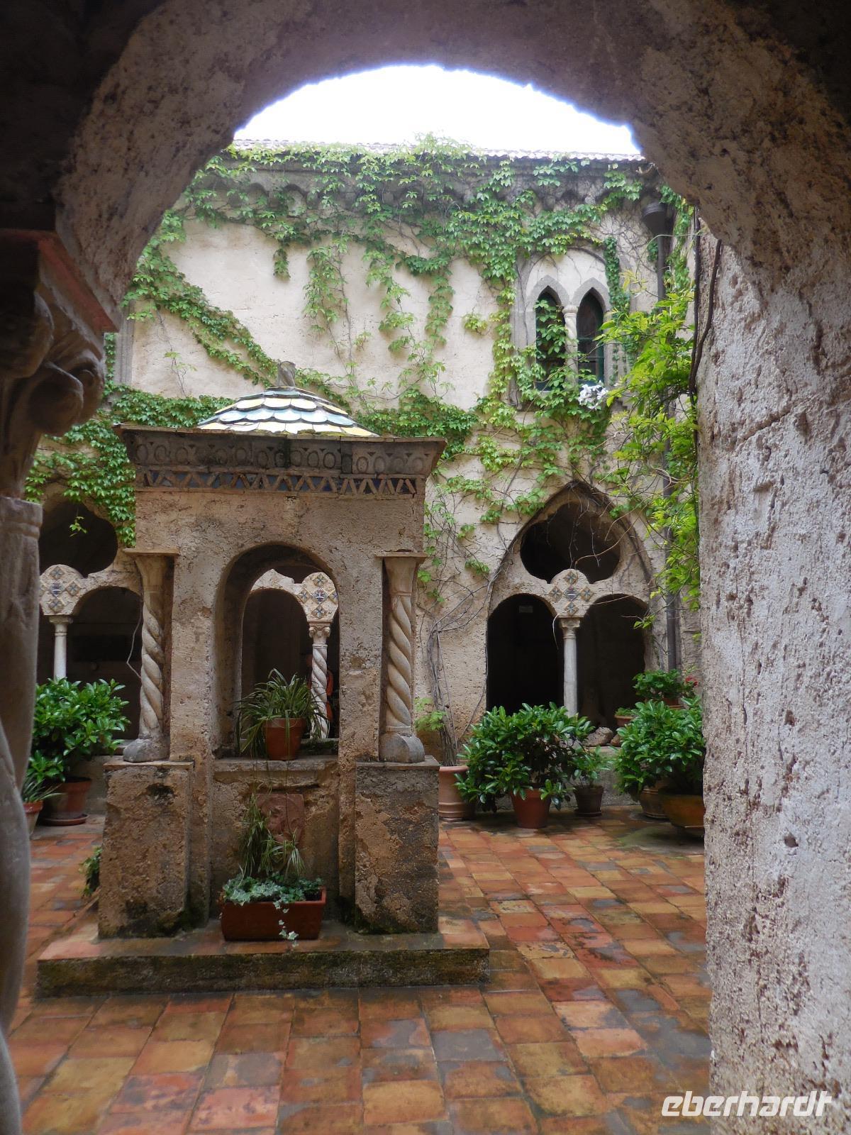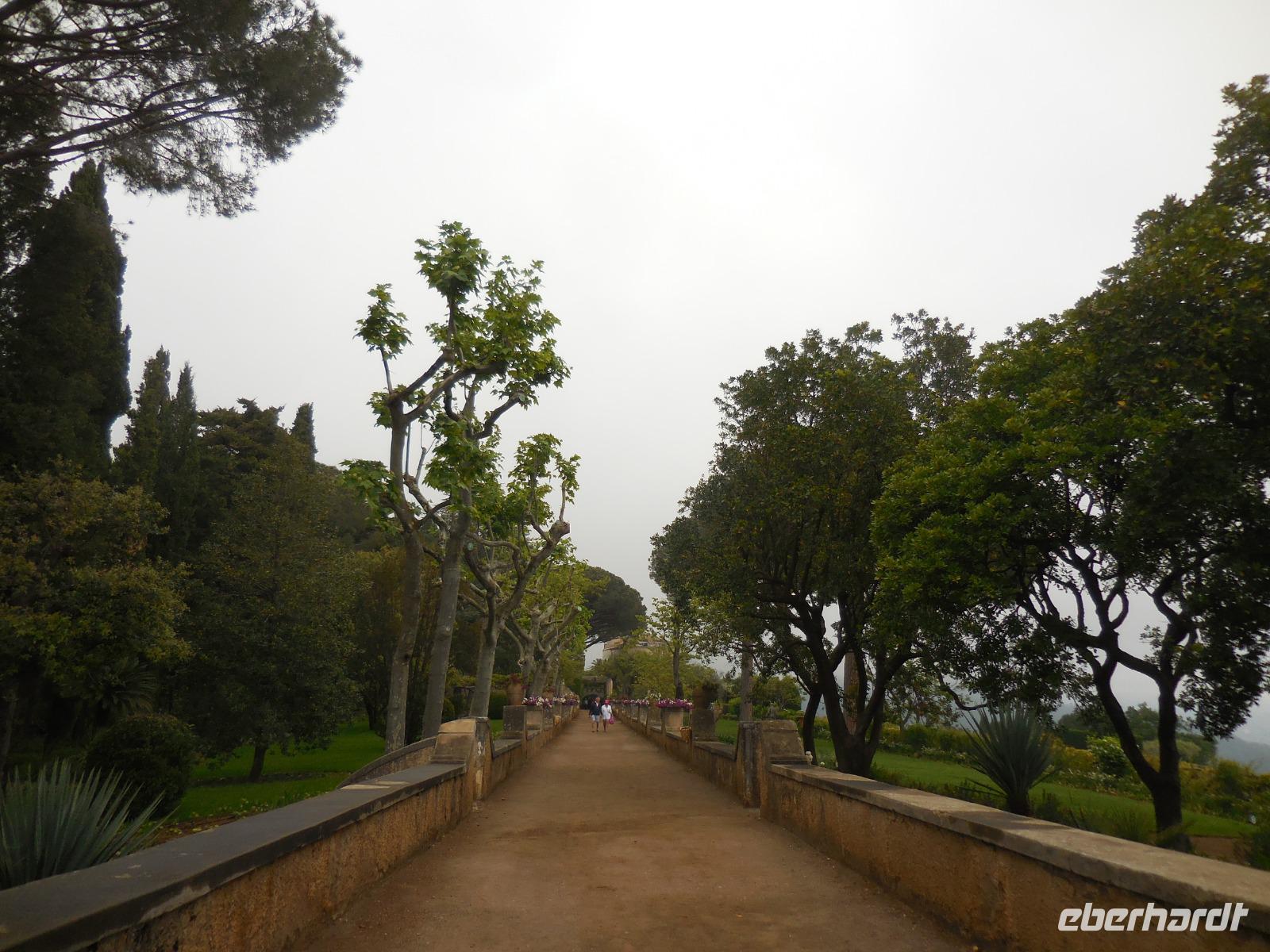 6:30 Uhr müssen wir heute schon unser Frühstück einnehmen, denn ein langer Ausflugstag steht uns bevor. Pünktlich um 7 Uhr fahren wir ab und nehmen Angelo mit an Bord. Leider erfahren wir kurz vor Salerno, dass der Bootsbetrieb auf der ganzen Küste der Amalfiküste heute eingestellt bleibt und das Meer zu unruhig ist. Wir sehen auch den ganzen Tag über kein einziges Schiff auf dem Meer - nur hohe Wellen, die am Strand ankommen. Demzufolge gestalten wir den Tag sehr flexibel und kaufen kurzerhand zwei Genehmigungen für unseren Bus in Ravello und in Amalfi, damit wir den heutigen Ausflug in abgewandelter Form per Bus absolvieren können. Wir bereisen die berühmte Amalfitana vom Süden aus mit dem Bus und beginnen mit dem kleinen Örtchen Vietri sul Mare. Das ist der erste oder der letzte Ort der Amalfiküstenstraße (je nachdem, wie rum man diese bereist) und kaum ein Tourist nimmt sich die Zeit, dieses kleine Städtchen anzusehen. Wir nehmen uns diese Zeit und bewundern die vielen schönen Majolika-Fliesen an den Hauswänden. Diese farbig bemalten zinnglasierten italienischen Keramikfliesen sind aus dem 15. und 16. Jahrhundert und es gibt so viele wunderschöne Farben und Motive zu sehen. Ein wirklich schöner Anblick! Kurze Zeit später sitzen wir wieder im Bus und fahren hinauf nach Ravello, was eigentlich gar nicht auf unserem heutigen Plan steht. Ravello ist bekannt für die seit 1953 jährlich stattfindenden Richard-Wagner-Festspiele im Sommer. Wir werden später den Schauplatz dieses Festivals bewundern. Das Wetter ist leider nicht das allerbeste und es tröpfelt hier und da mal wieder, aber das tut unserer Stimmung keinen Abbruch. Wir erreichen den Hauptplatz von Ravello mit der Kathedrale San Pantaleone und laufen zunächst zur Villa Cimbrone. Der wunderschön angelegte Garten ist einmalig anzuschauen und hat viele Dichter, Künstler und Musiker schon inspiriert. Ebenso die byzantinisch geprägte Villa Rufolo aus dem 13. Jahrhundert wo die Musikfestspiele stattfinden und wo sich im Jahr 1880 Richard Wagner inspirieren lassen hat und Klingsors Garten sah.