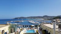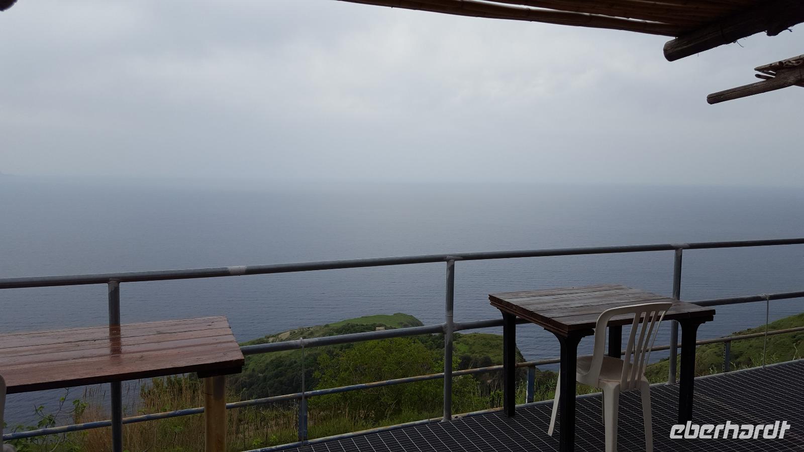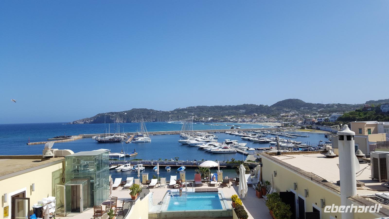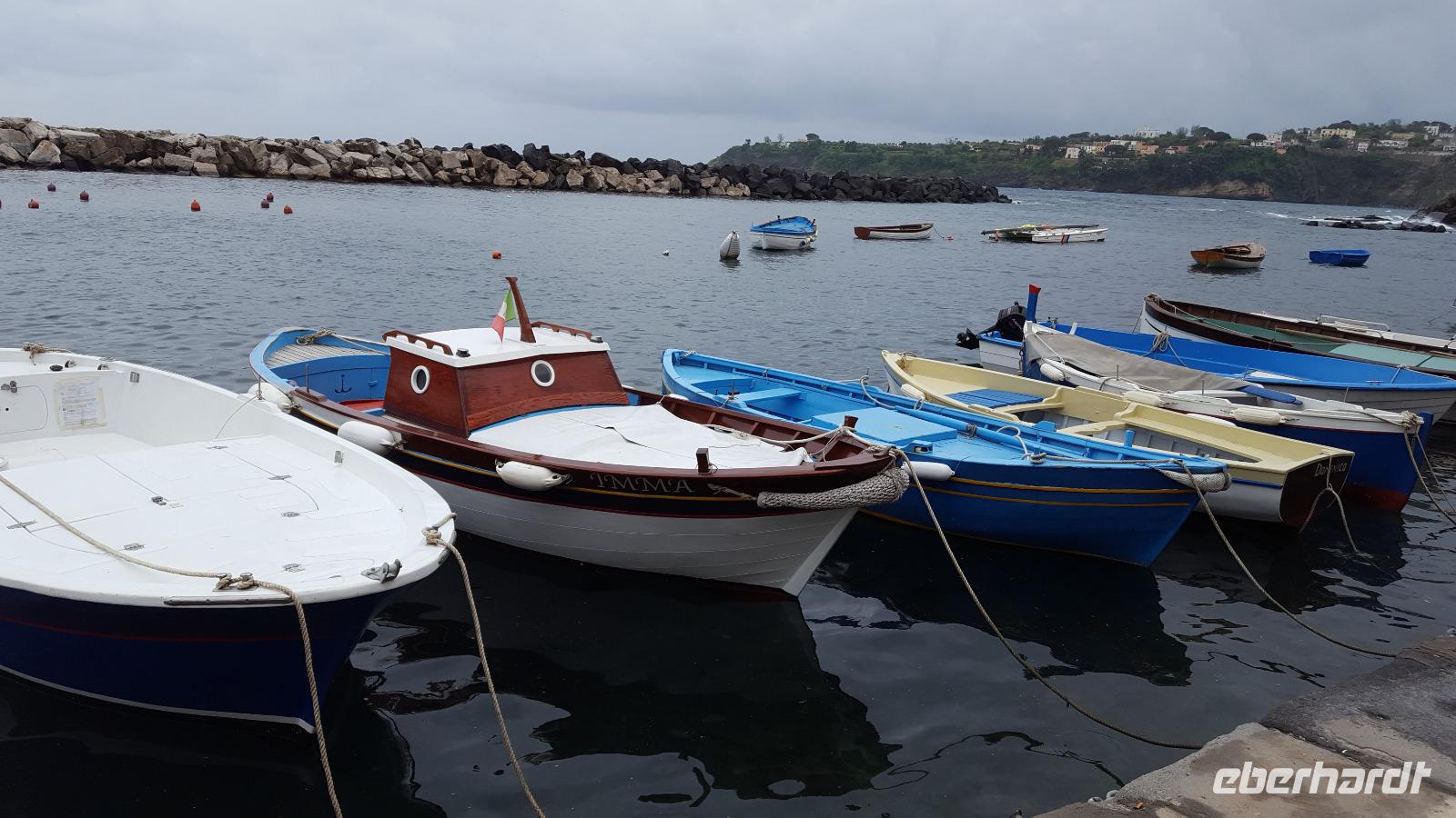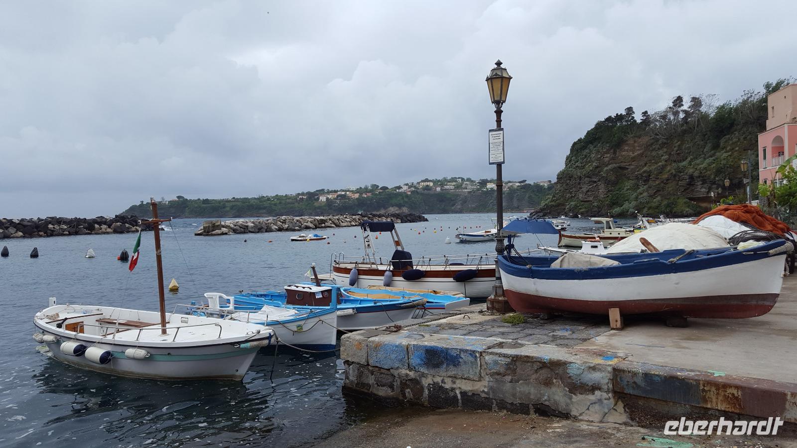Hier durfte auch die Cappuccino Pause nicht fehlen vor dem Hintergrund des grün leuchtenden Epomeo-Gipfels. Am Nachmittag war die Inselrundfahrt per Boot geplant, leider musste sie wegen zu hohem Wellengang abgesagt werden.
