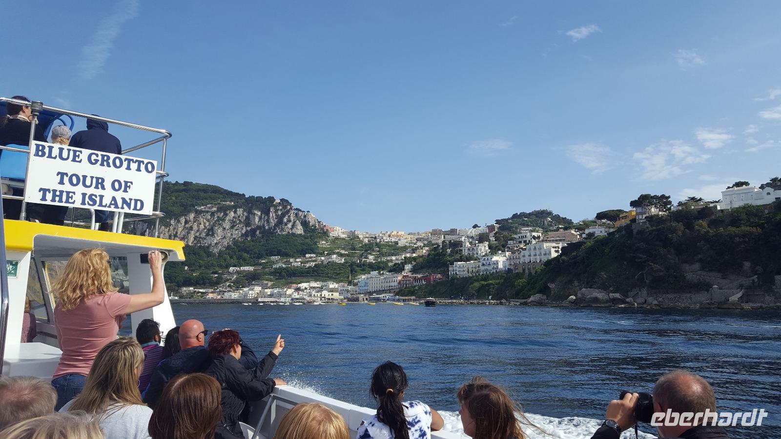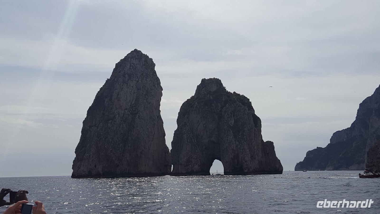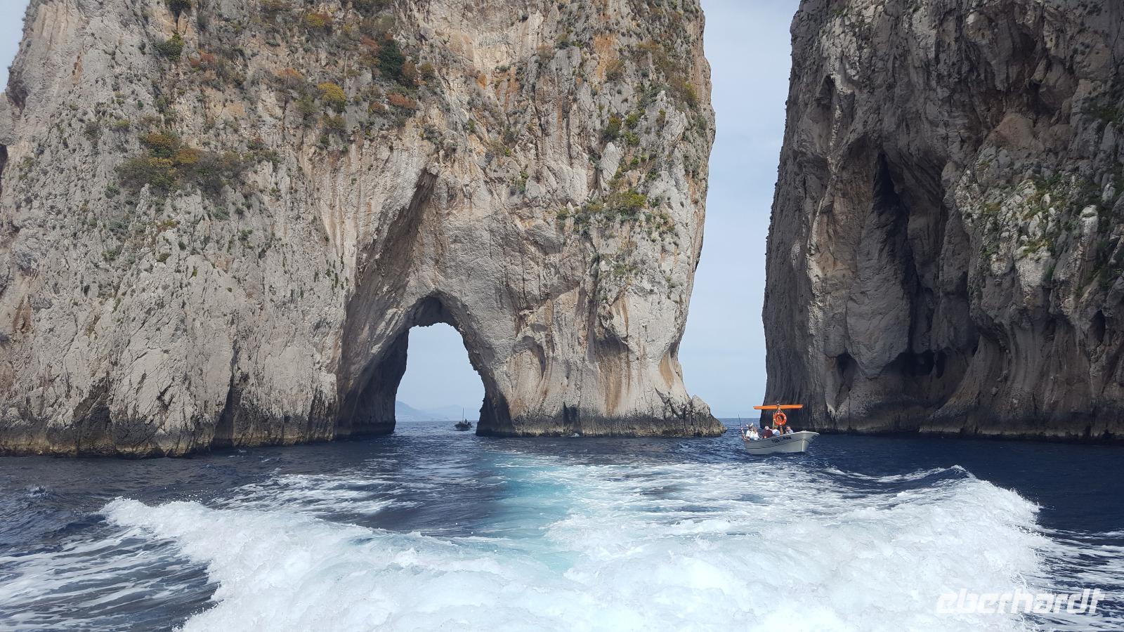 Eine Inselrundfahrt um Capri war der Höhepunkt der Tour, da sich auch die Sonne von ihrer schönsten Seite zeigt. Wir sahen mehrere Höhlen und durchfuhren einen Felsenbogen.