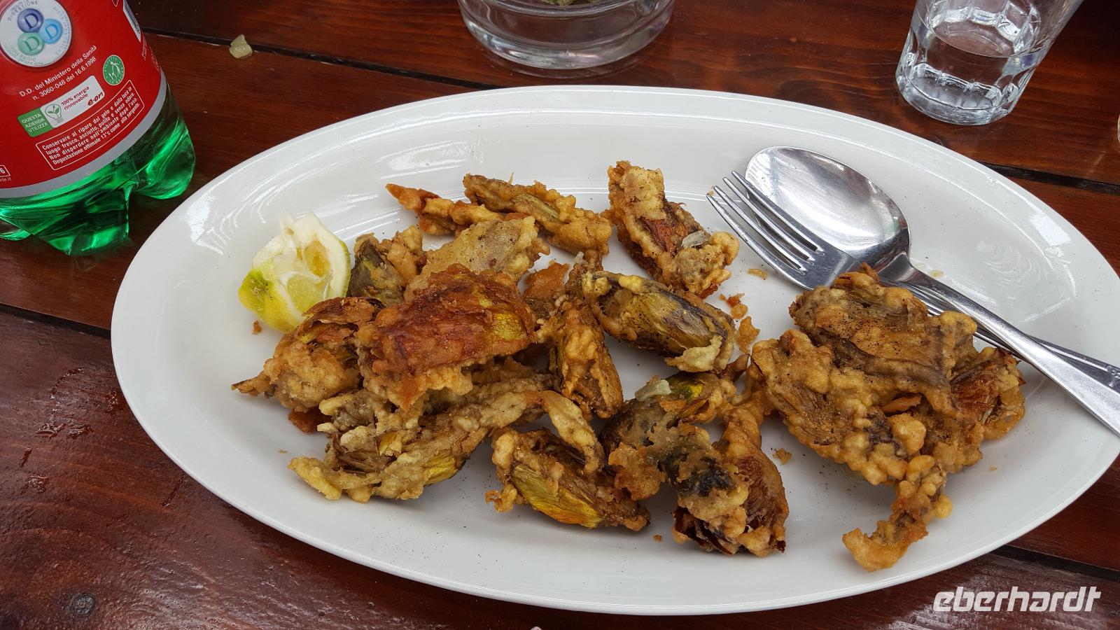 Mit dem Bus fuhren wir die kurze Strecke bis Campagnano. Von dort schlängelte sich der Weg von einem Landwirt zum nächsten. Angebaut wurde z.B. Artischocken, Bohnen, Fenchel, Salat und natürlich Weintrauben. Nach ca. 1 ½ Stunden erreichten wir ein typisches Restaurant und wurden verwöhnt mit Bruschetta, Spagetti, Bohnensuppe und frittierte Artischocken. Ein Gedicht! Als Dessert mundeten uns warme Kreppelchen, von Maria liebevoll zubereitet. Ein Espresso zum Schluss rundete das leckere Essen ab. Ein Abstecher in den privaten Weinkeller verführte uns zu einem letzten Schlückchen Wein.