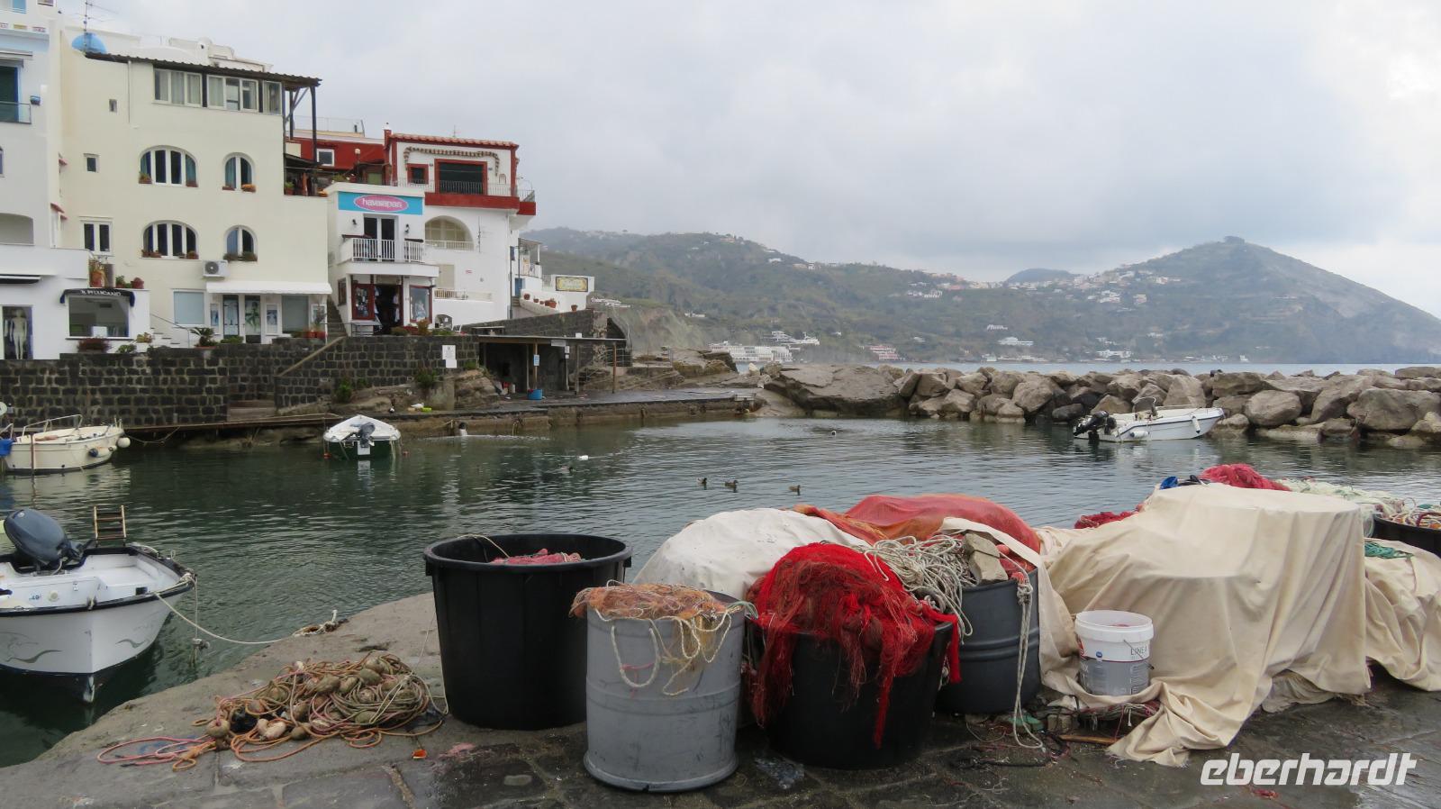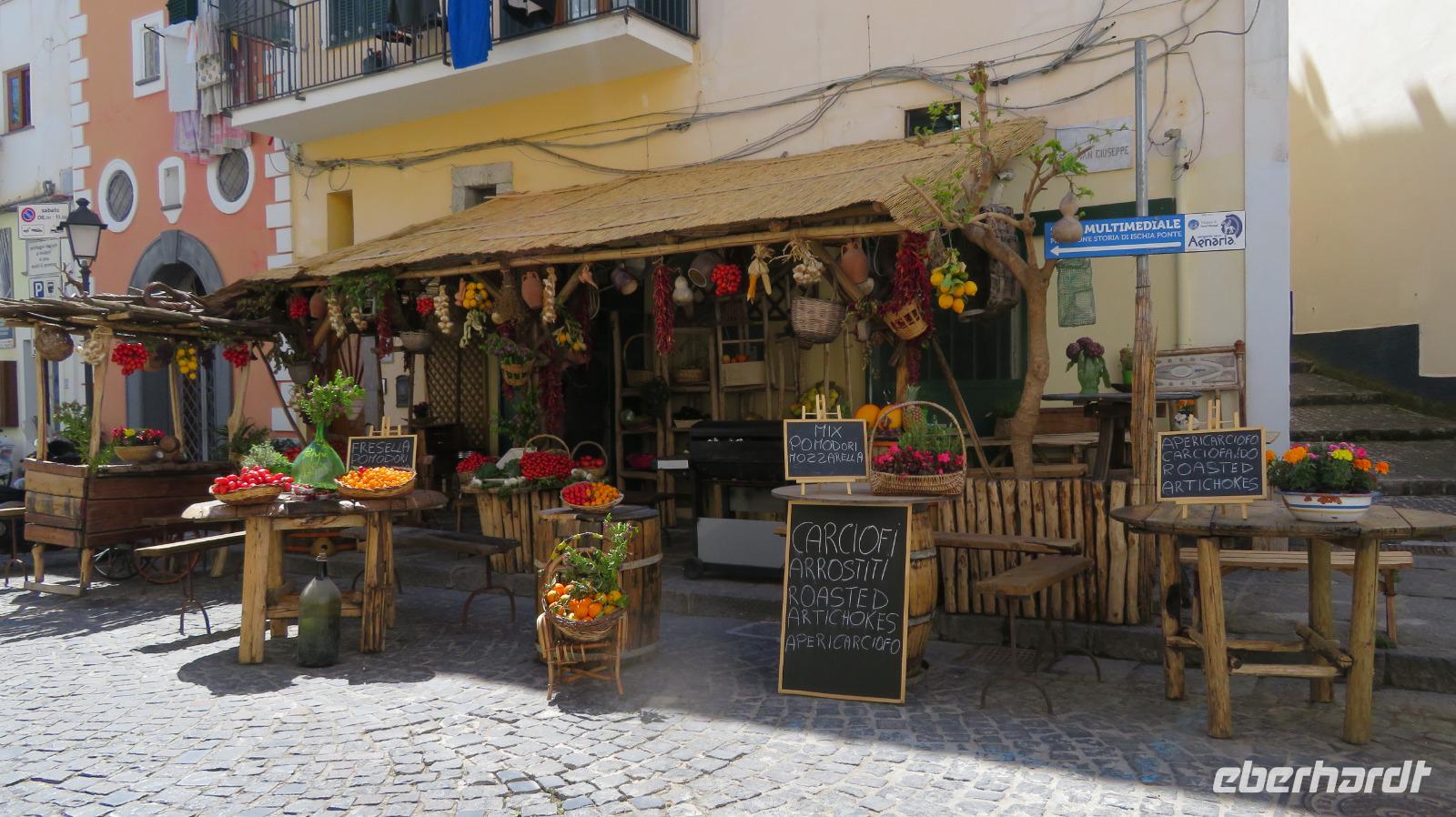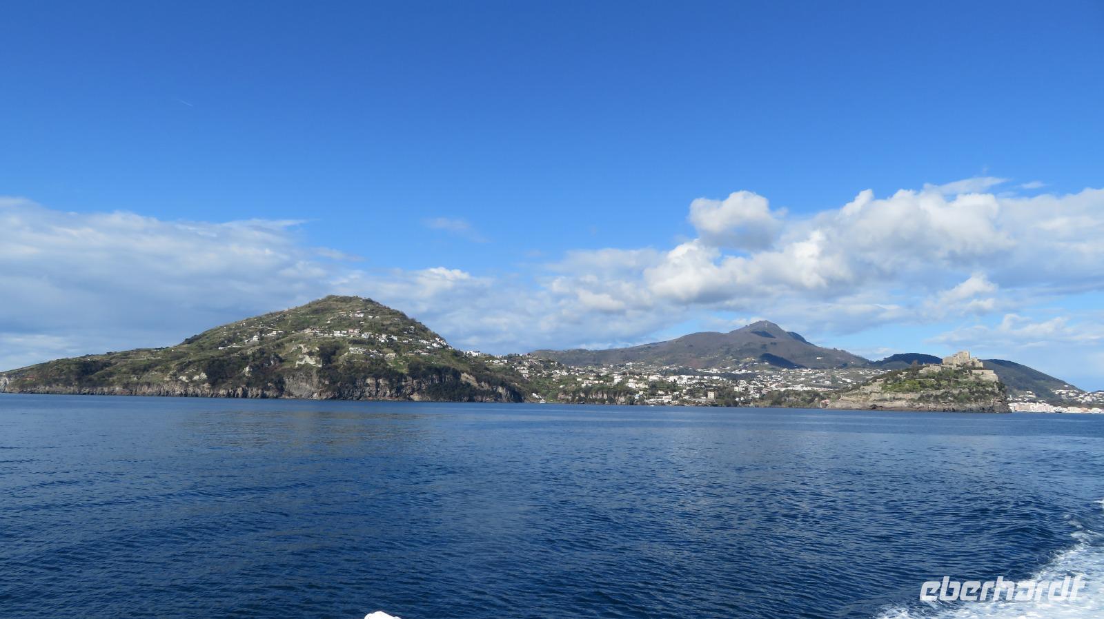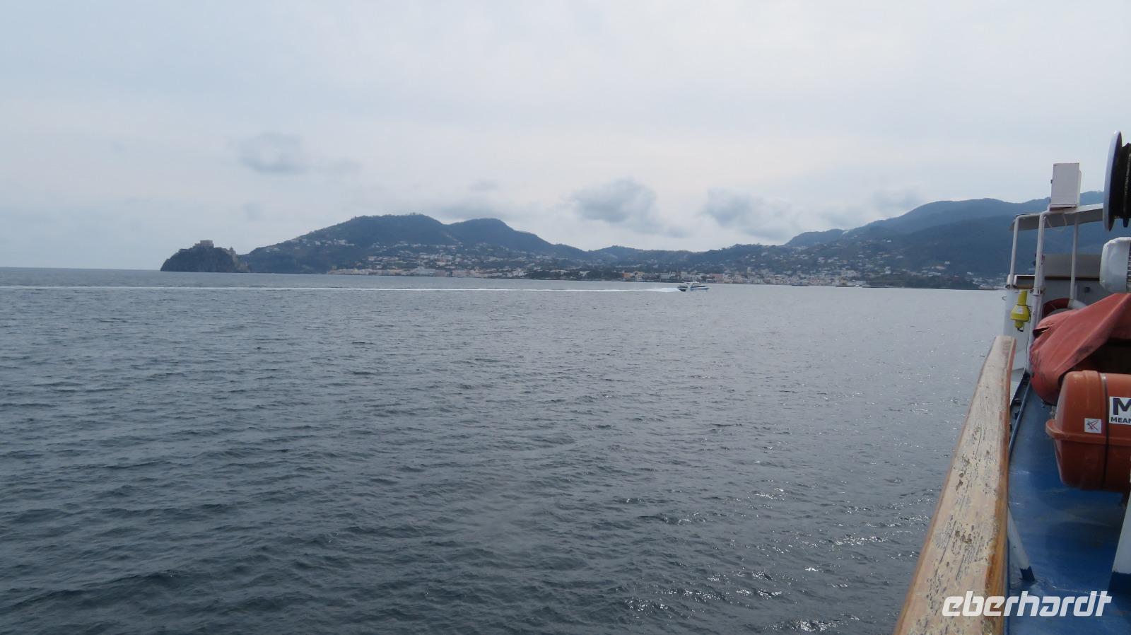 Wir lassen uns einen leckeren Mittagsimbiss mit inseltypischen Antipasti und Wasser und Wein schmecken. In fünf Minuten sind wir zu Fuß am Hafen, und die Fähre und Heike bringen uns zum Hafen von Ischia Porto zurück.