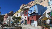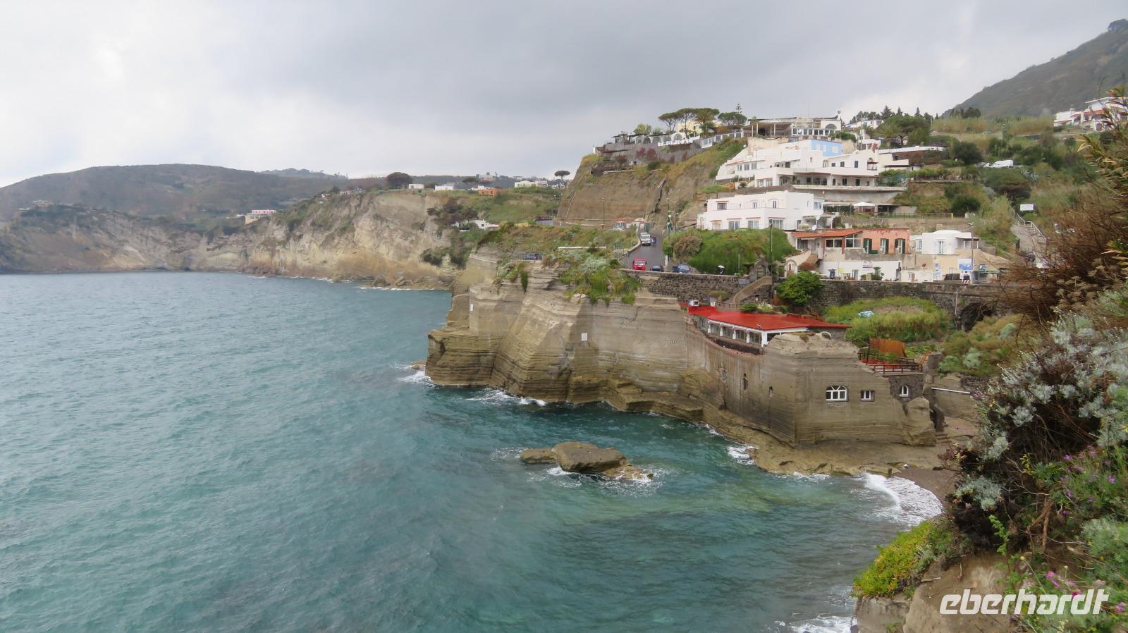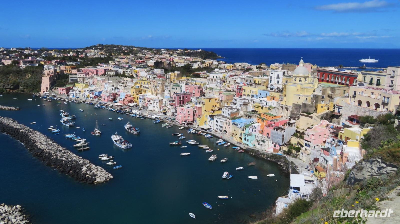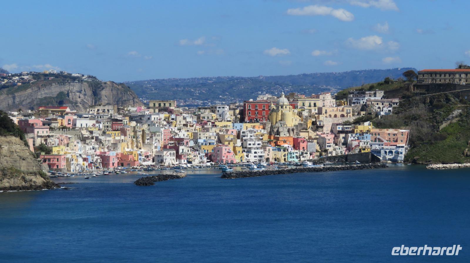 Wir genießen die Atmosphäre, denn endlich scheint die Sonne und bringt das Meer zum Strahlen. Wir laufen hinab zum idyllischen Fischerort Corricella. Leider ist die Zeit zu knapp, um noch etwas zu flanieren. Eine Treppe mit 150 Stufen bringt uns wieder hinauf, wo uns schon die Microtaxen erwarten, um uns durch die engen Gassen zum anderen Ende der Insel zu fahren. Oberhalb der Felsküste stoppen wir am einstigen Vulkankrater an einem Aussichtspunkt, wo man einen Traumblick über Insel, Meer und zum bunten Fischerdörfchen Corricella hat.