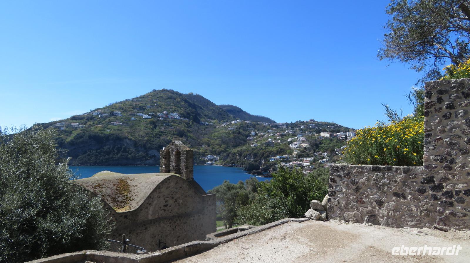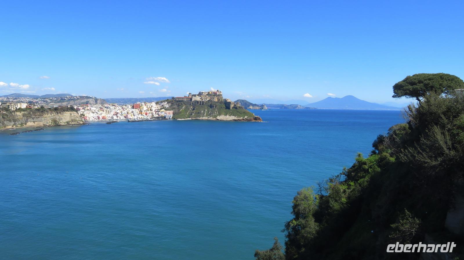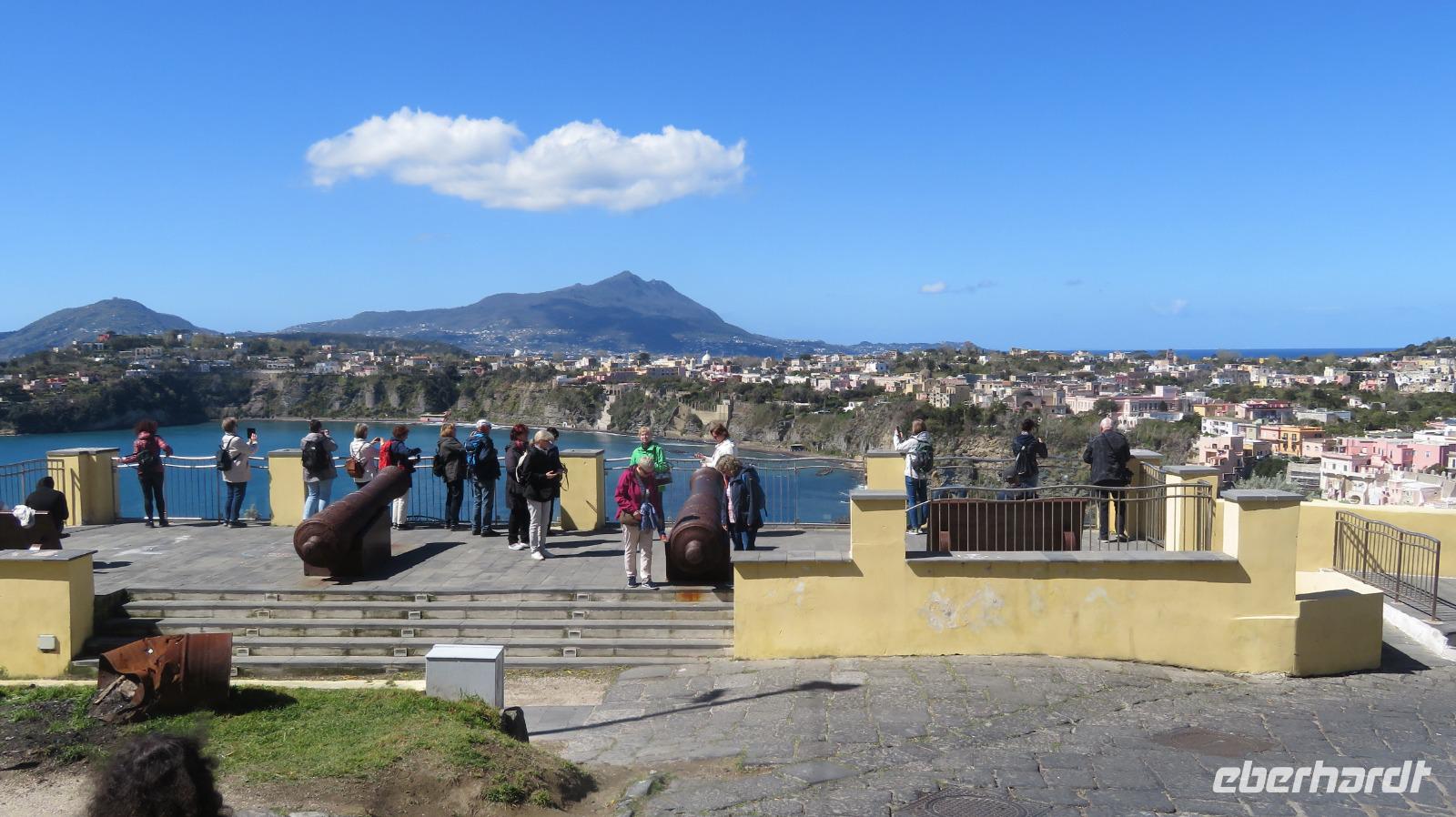 Zwei Minibusse bringen uns in den Süden der Insel nach Campagnano. Wir werfen zuerst einen Blick in die Kirche Santa Maria Annunziata. Dann spazieren wir durch enge Straßen und Gassen in die Weinberge. Wir genießen die traumhafte Aussicht auf den Golf von Neapel. Unter uns das Castello Aragonese, in der Ferne Procida, der Vesuv, die Monte Lattari mit der Sorrentinischen Halbinsel und im Meer die Insel Capri.