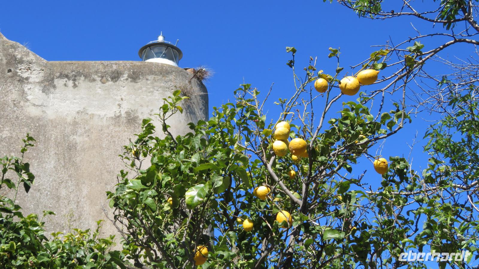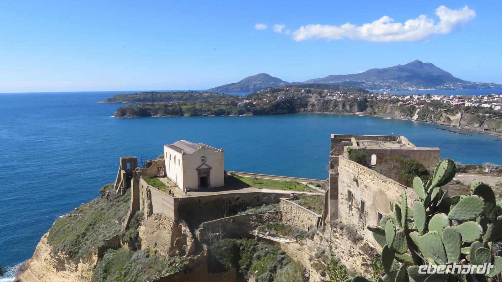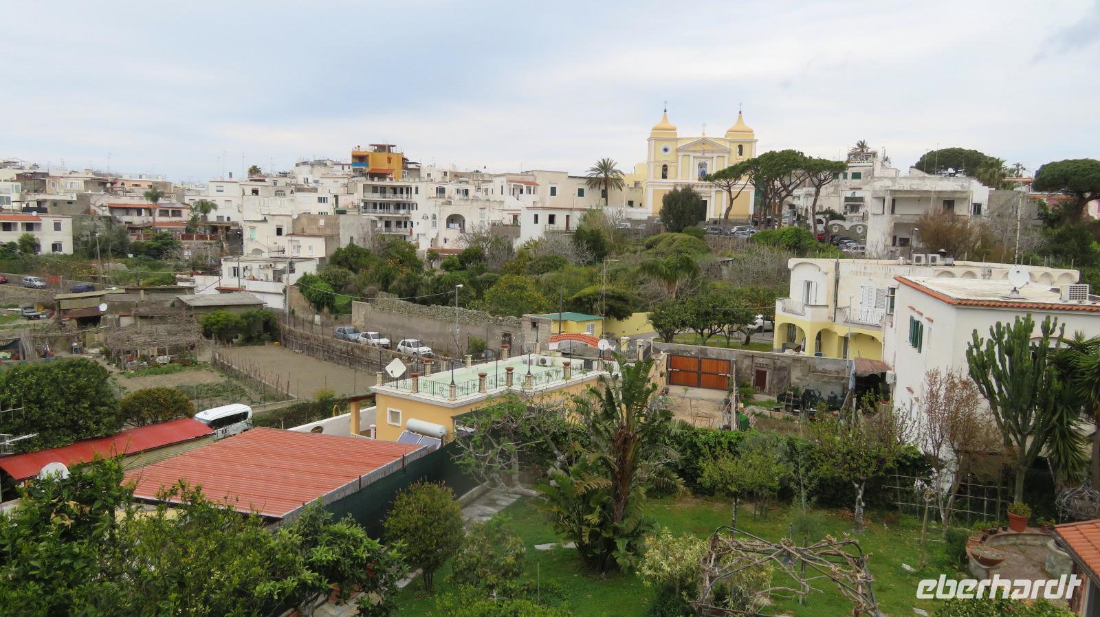 Zwei Minibusse bringen uns in den Süden der Insel nach Campagnano. Wir werfen zuerst einen Blick in die Kirche Santa Maria Annunziata. Dann spazieren wir durch enge Straßen und Gassen in die Weinberge. Wir genießen die traumhafte Aussicht auf den Golf von Neapel. Unter uns das Castello Aragonese, in der Ferne Procida, der Vesuv, die Monte Lattari mit der Sorrentinischen Halbinsel und im Meer die Insel Capri.