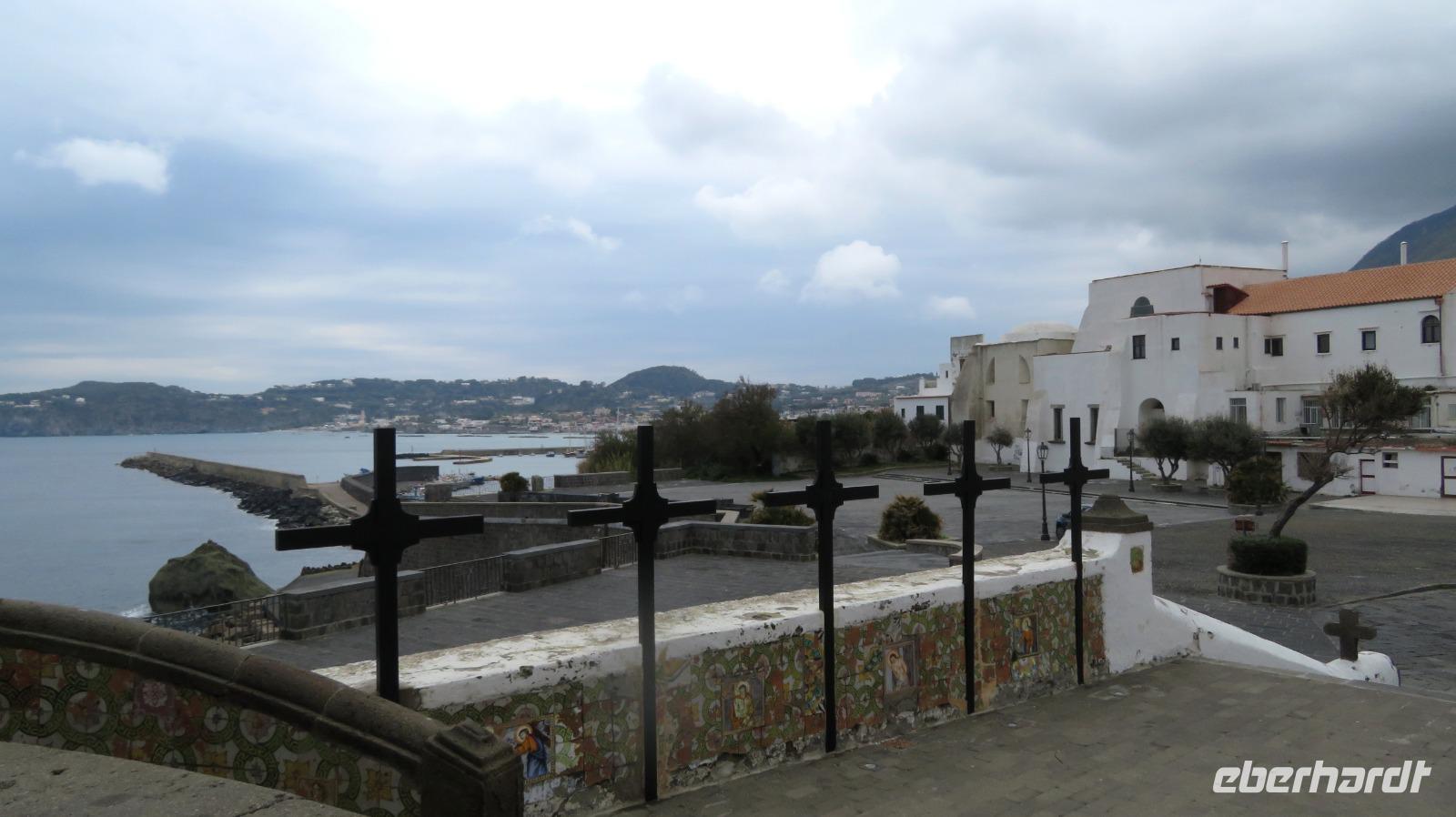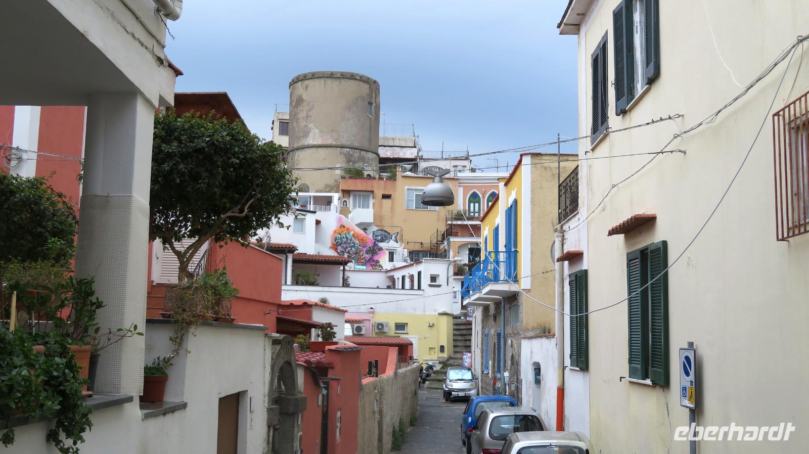 Terra Murata ist das älteste bewohnte Viertel der Insel mit einem berüchtigten Gefängnis. Der Palazzo d'Avalos wurde im 16. Jahrhundert von der regierenden Familie d'Avalos als Residenz errichtet. Im 19.Jahrhundert wurde er zu einem Gefängnis umfunktioniert und wurde erst 1988 endgültig geschlossen. Heike erläutert uns ausgiebig die Geschichte der Insel und der Gebäude auf dem Hügel. Größte Sehenswürdigkeit ist die Abtei San Michele Arcangelo. Ausführlich schauen wir uns die Kirche an, bewundern die wertvollen Altäre, Gemälde und Statuen, besonders natürlich den Inselheiligen San Michele.