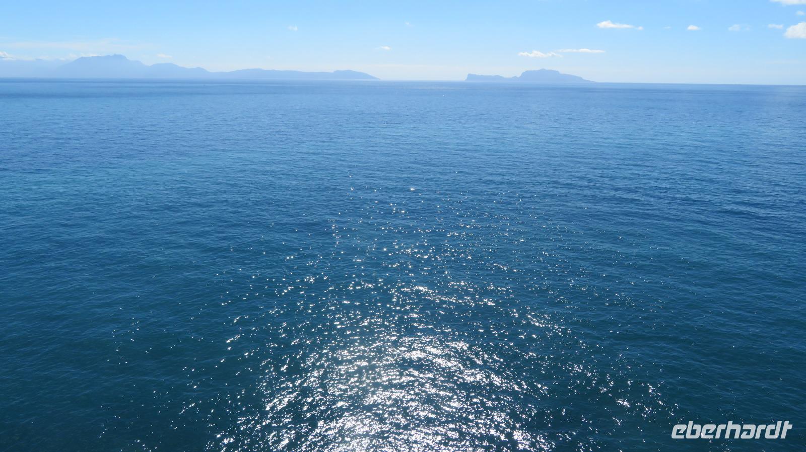 Von der Aussichtsterrasse bewundern wir wieder die Aussicht auf die Insel und aufs Meer.