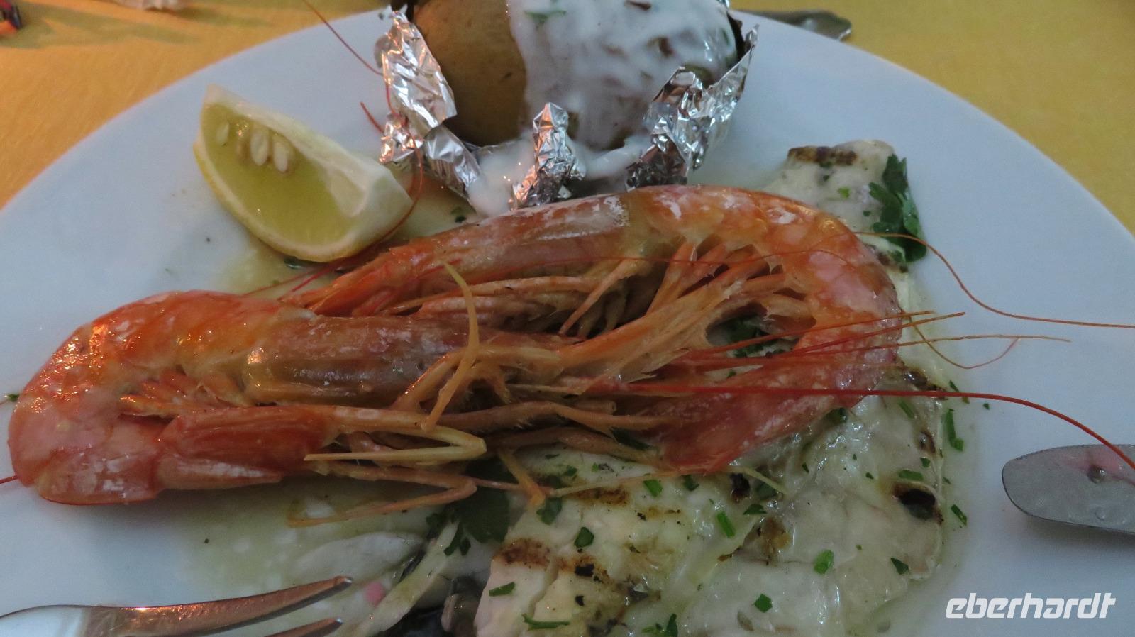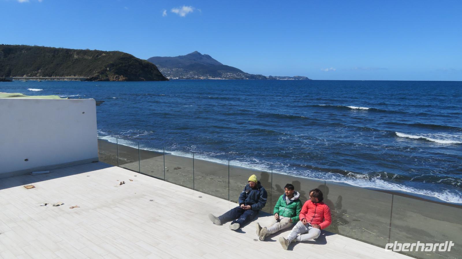 Da die geplante Inselumrundung per Boot wegen Wellengang ausfallen muss, werden wir zu einem fantastischen Mittagessen in eines der besten Restaurants der Insel eingeladen. Wir starten mit Antipasti, einer Bruschetta, und als ersten Gang gibt's die typischen Spaghetti mit Tomate oder Meeresfrüchten, und als Hauptgang Kalbfleisch oder frittierte Meeresfrüchte. Ein leckeres Schoko-Vanille-Eis rundet das Ganze ab, und gesättigt spazieren wir zum Hotel. Inzwischen kommt sogar die Sonne raus, und einige Gäste unternehmen noch eine kleine Wanderung. Die meisten nutzen aber die Vorteile von unserem Hotel, das Thermalwasser. Unser Hotel bietet zwei Thermalpools in der Halle und einen unter freiem Himmel an. Wir genießen die Wärme des Wassers, denn die Temperaturen auf der Insel haben wir uns doch etwas höher vorgestellt.