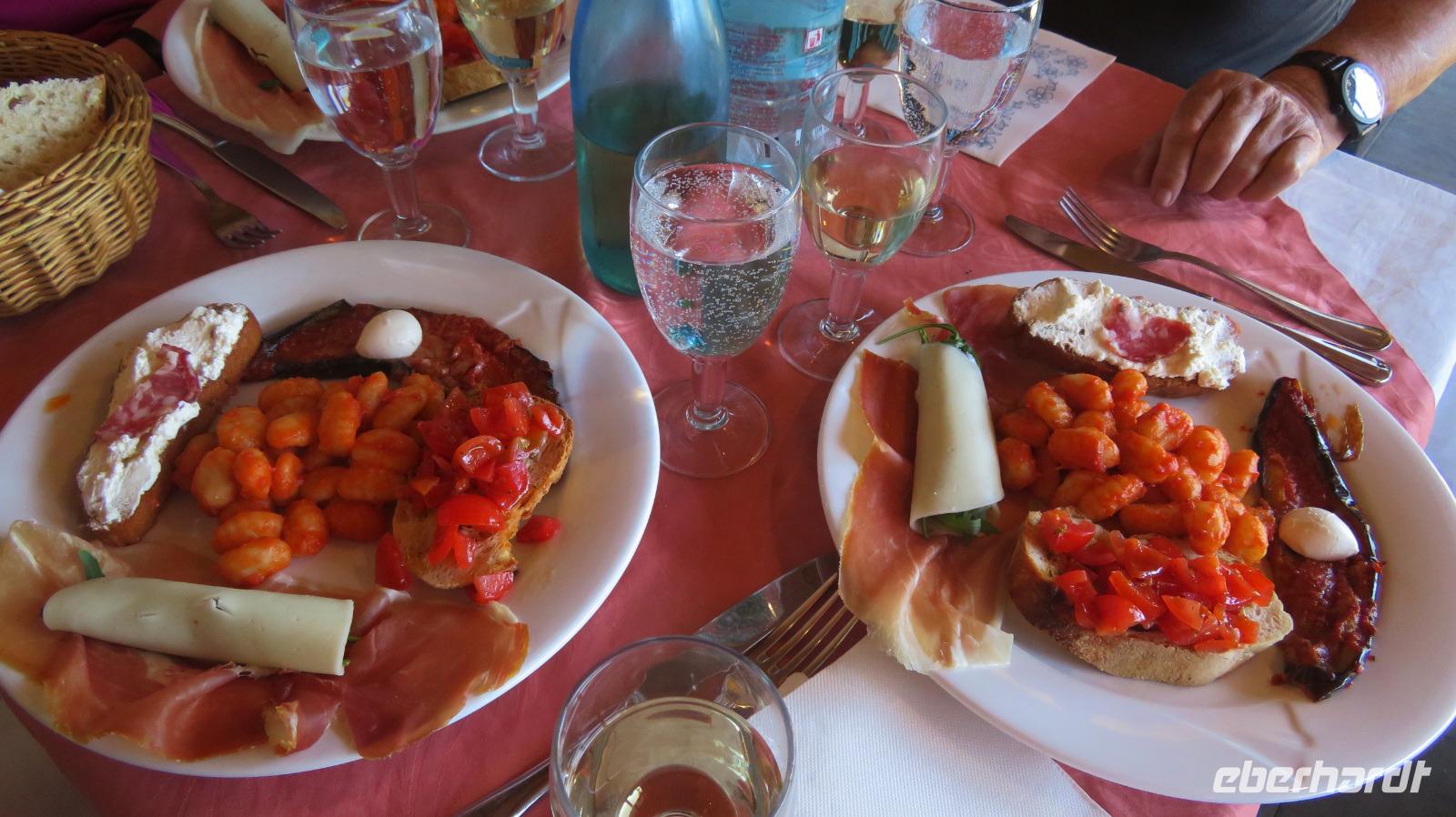 Bei einem Gläschen Prosecco erfahren wir von Giovanni das Programm für die nächsten Tage und freuen uns schon, die Insel zu erkunden. Ein schmackhaftes Abendessen rundet den ereignisreichen Tag ab. Müde fallen wir in die Betten!