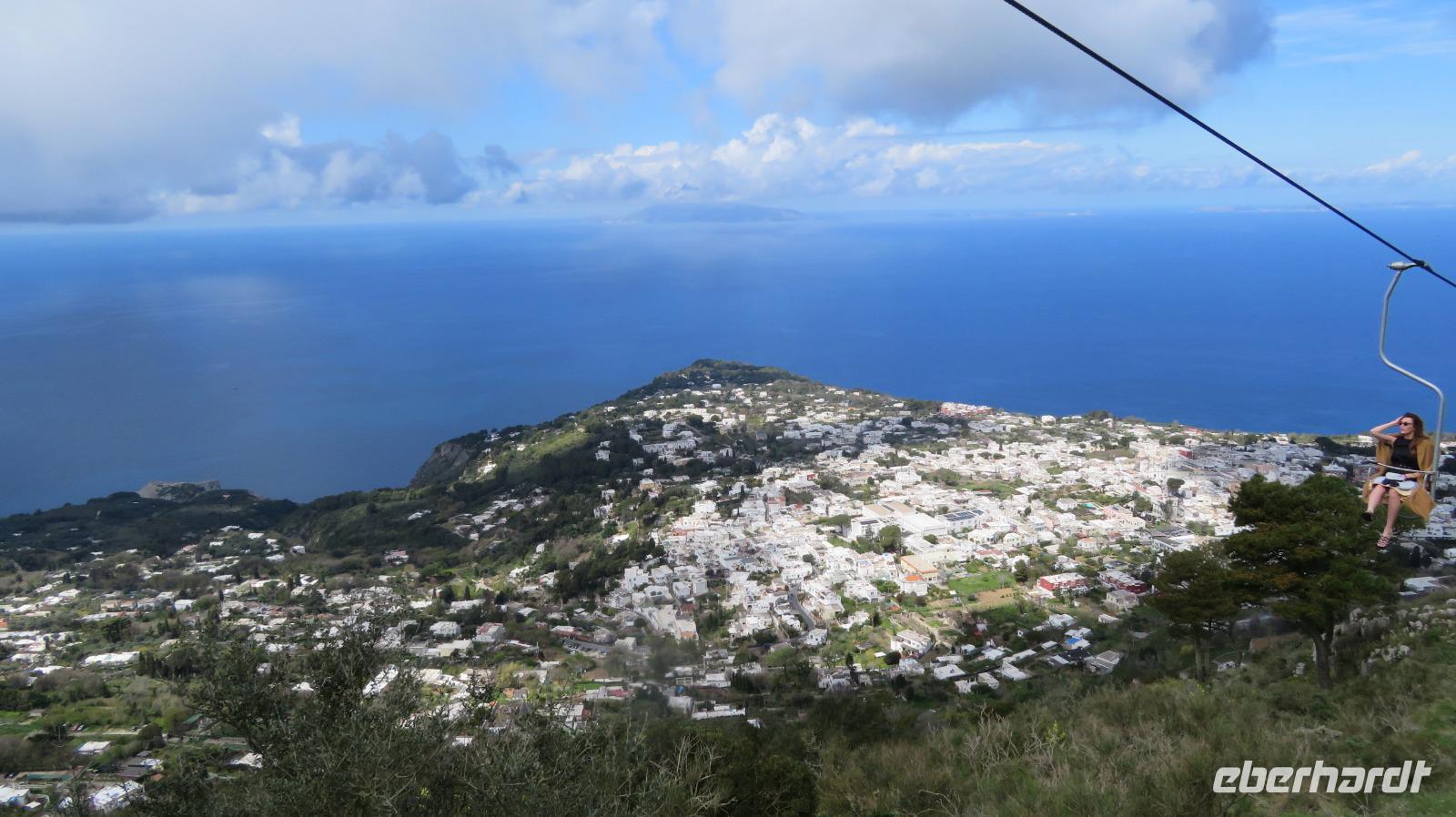 Auf Capri bringt uns zuerst ein Elektrobus nach Anacapri hinauf, und Vincenzo führt uns zum Aussichtspunkt an der Villa Axel Munthe. Dort können wir einen herrlichen Blick über die Insel Capri und den Golf werfen. Einige Gäste besichtigen die Villa, andere nutzen das schöne Wetter, um mit dem Sessellift auf den Monte Solaro zu fahren und die spektakuläre Aussicht von ganz oben zu genießen.