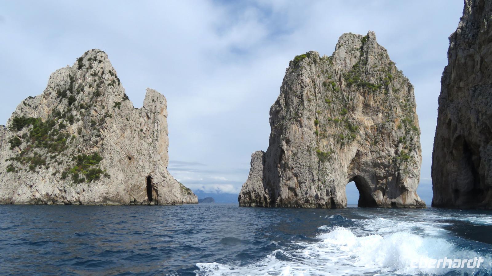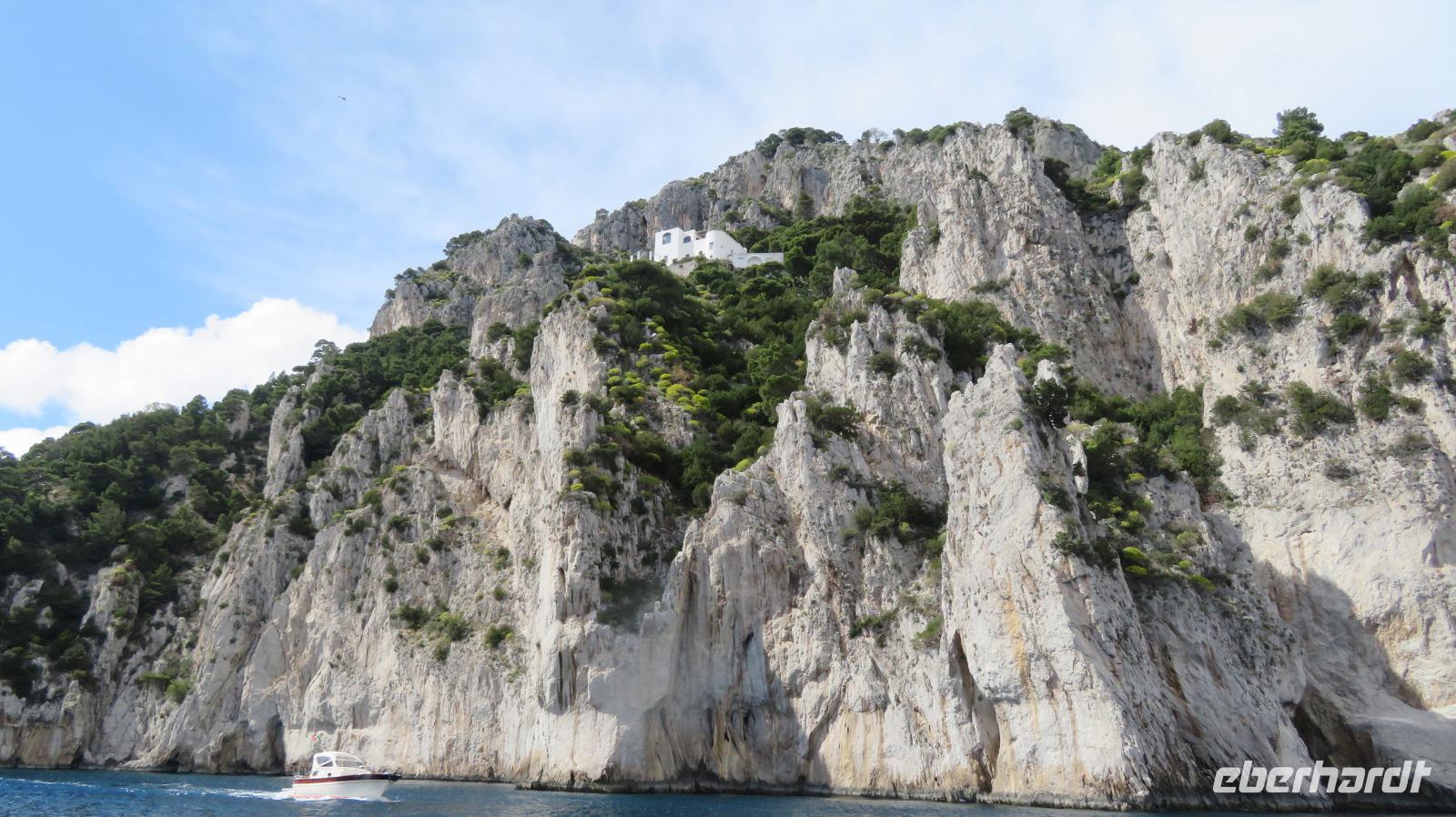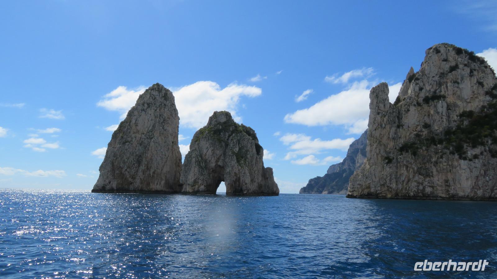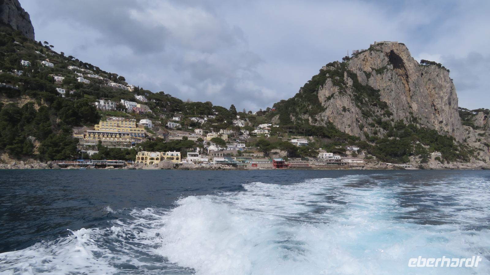 Vincenzo bietet uns als zusätzliches Highlight noch eine Bootsfahrt um die Insel an. Mit dem Funicolare geht es zum Hafen von Marina Grande. Vom Meer aus kann man eigentlich erst so richtig die Schönheit von Capri entdecken, die Kalksteinfelsen, die Grotten mit ihren orangefarbenen „Korallen". Heute ist das Meer sehr ruhig, und wir können die Fahrt entspannt genießen und die verschiedenen Blautöne des Meeres bewundern. Noch etwas Freizeit im Hafen, ehe es wieder zurück nach Ischia geht.