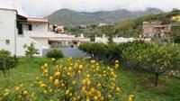 Giovanni erzählt uns immer wieder über das Leben auf Ischia. Wir wandern durch die Felder. Die steilen Anstiege hatten wir allerdings so nicht erwartet, und sie stellen für einige Gäste schon eine kleine Herausforderung dar. Aber unser reichhaltiges Mittagessen auf der Terrasse des Agritourismo Piano Liguri lässt uns die Mühen schnell vergessen. Bei herrlichem Sonnenschein genießen wir die Aussicht übers Meer und stoßen auf den schönen Tag mit selbstgekelterten Weiß- oder Rotwein an. Nach einem leckeren Antipastiteller gibt's als ersten Gang Bohnensuppe oder Spaghetti mit Kaninchensauce. Eigentlich sind wir schon satt, aber als Hauptgericht folgt dann noch das für Ischia typische Kaninchengericht. Zum Nachtisch hat Maria uns einen speziellen Zitronenkuchen gebacken. Ein Kaffee rundet das Ganze ab.