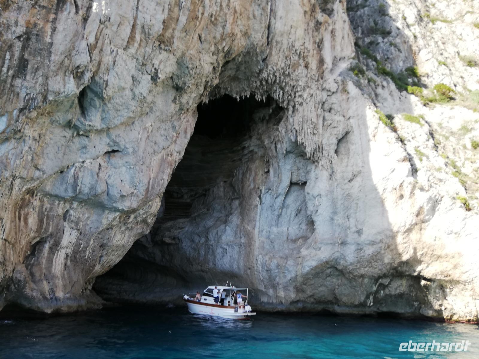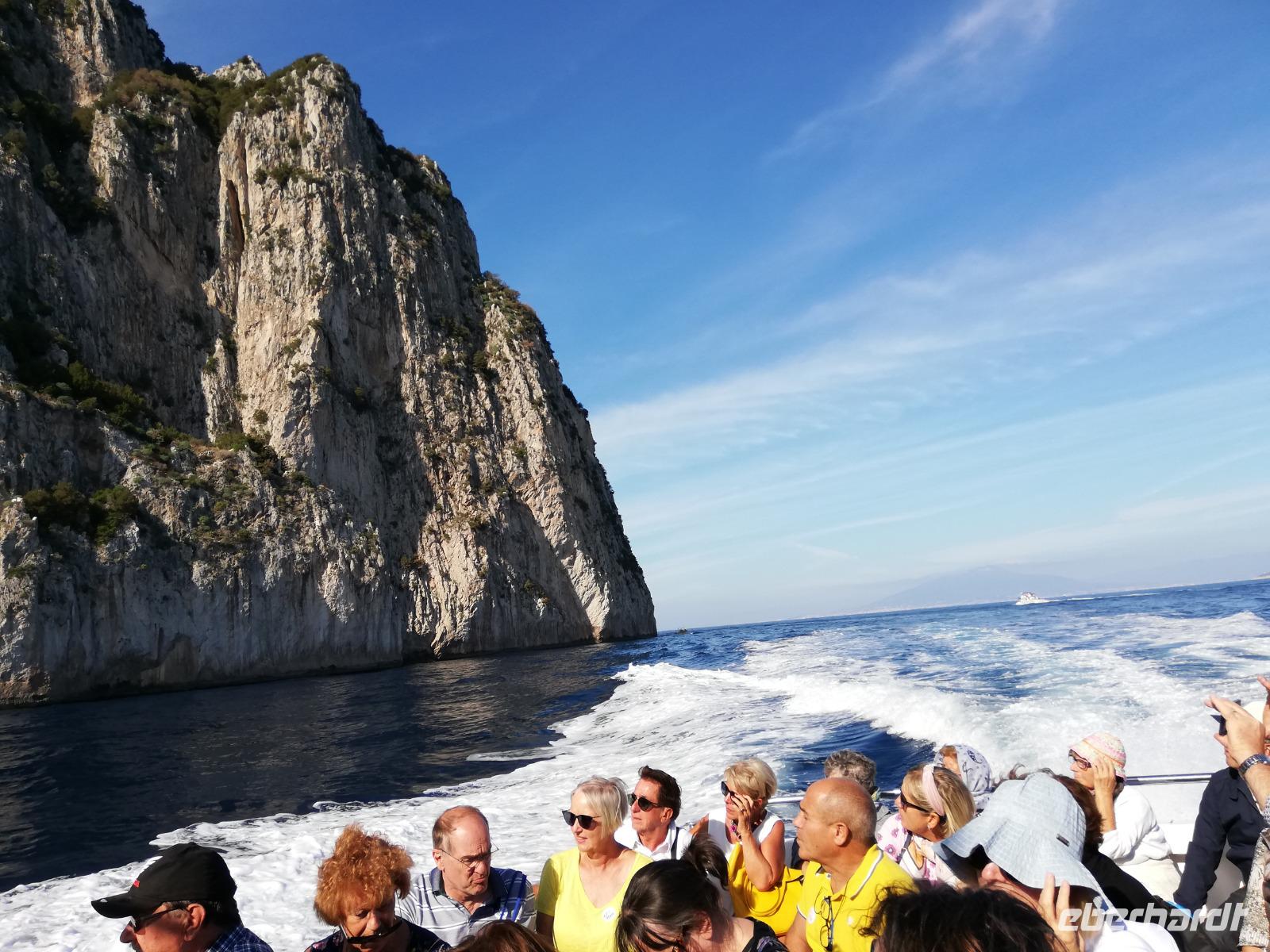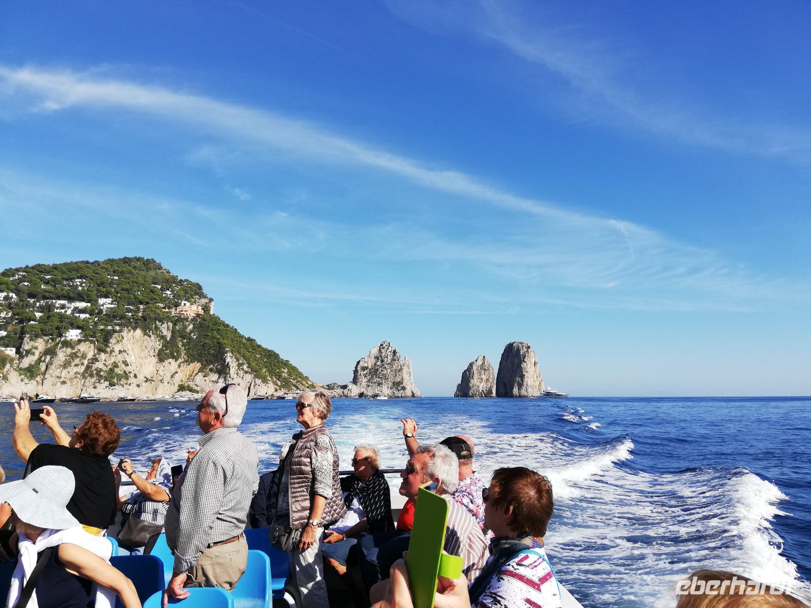 Bevor wir die Insel wieder verlassen, planen wir noch eine Schiffsrundfahrt um die Insel. Dafür haben wir sehr gute Bedingungen. Sonne, ein ruhiges Meer und die Führung in Deutsch. Wir fahren an die unterschiedlichsten Grotten vorbei, wobei die Grotte Azzura die bekannteste Sehenswürdigkeit auf Capri ist.