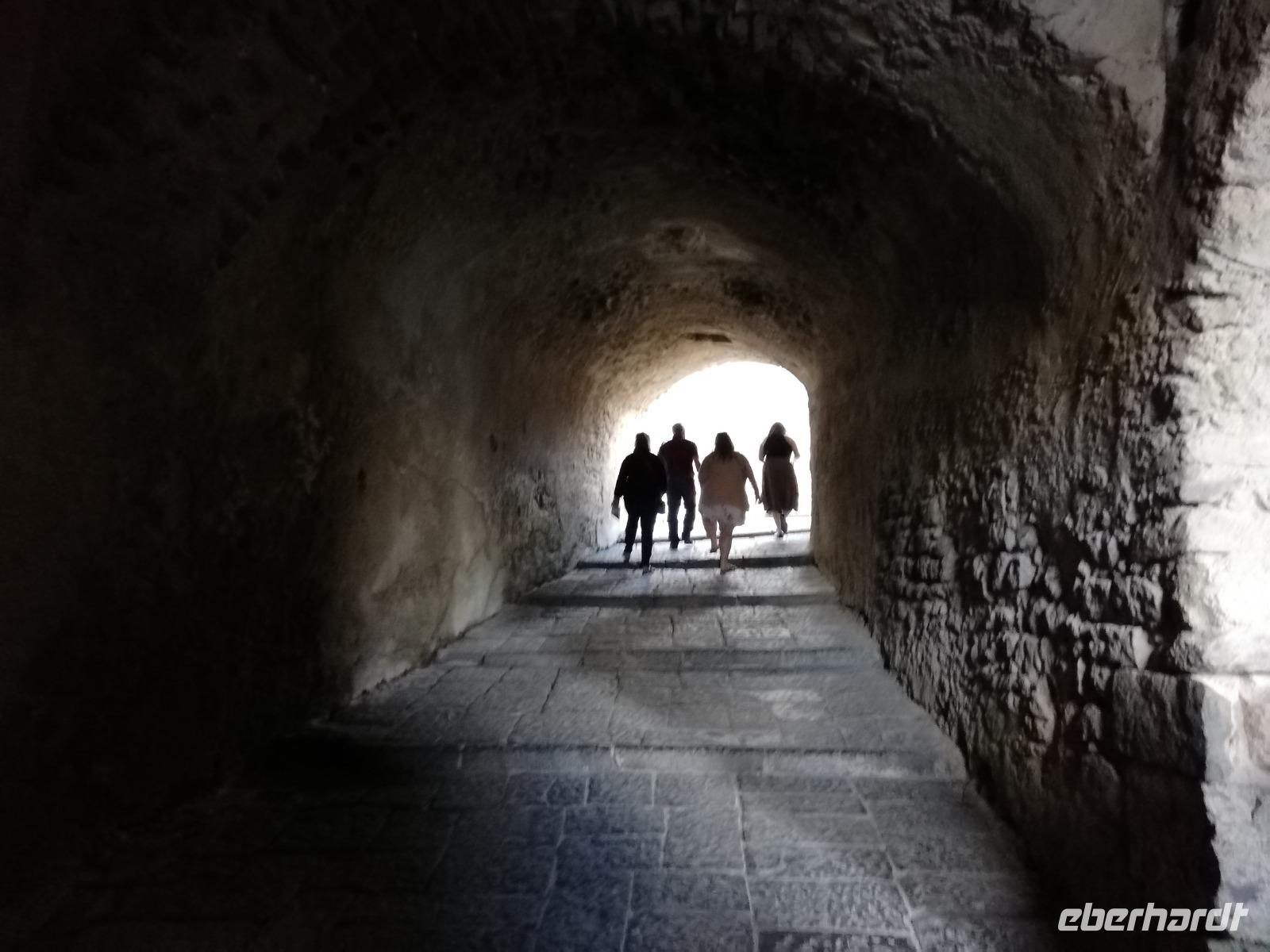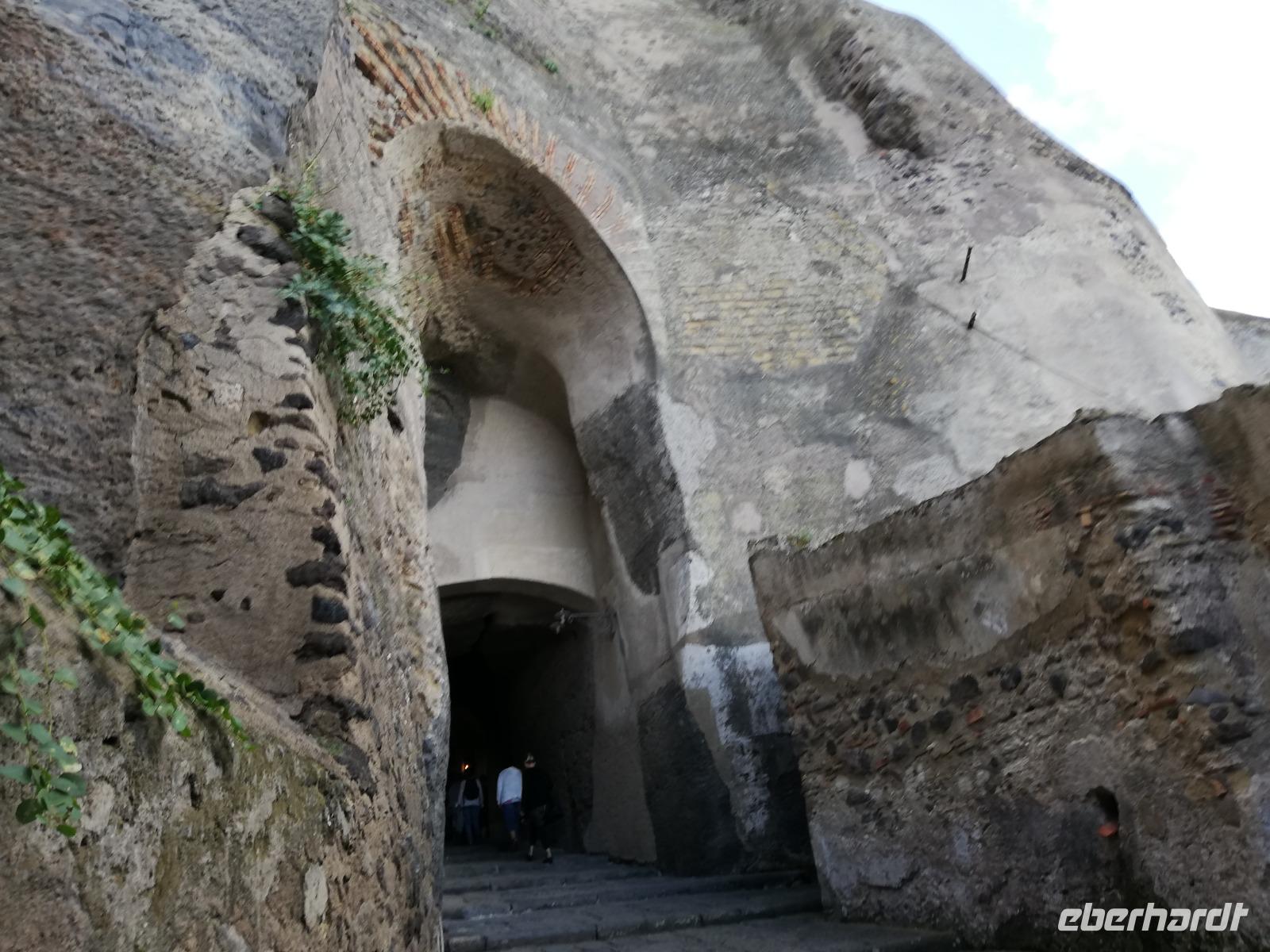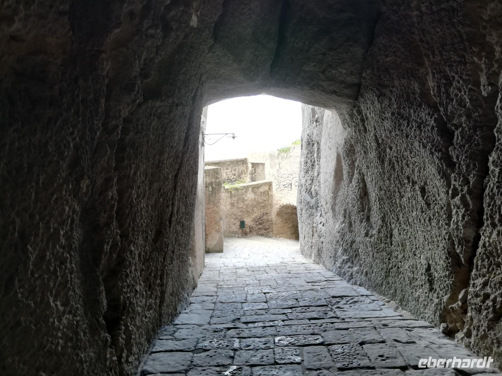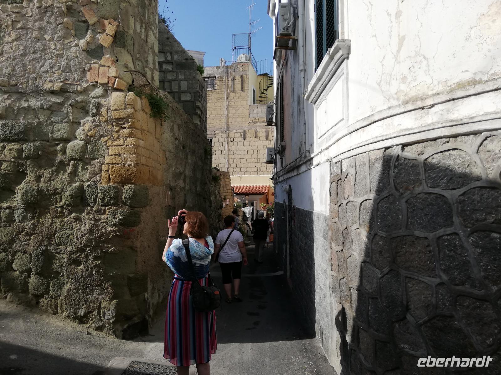 Heute erwartet uns Brigitte, die mit uns nach Ischia Ponte (Brücke)fährt und uns vieles zur Geschichte der Stadt erklärt. Ischia, ist der Hauptort der Insel und hat viele Behörden, Banken und exklusive Geschäfte. Die wichtigste Sehenswürdigkeit der Stadt, ist das Castello Aragonese. Es liegt auf einen über hundert Meter hohen Felsen und war im 15.und 16. Jh. Sitz der aragonischen Statthalter. Wir laufen entlang der Brücke zum Castello. Hier trennen sich die Wege unserer kleinen Gruppe. Einige nehmen den Fahrstuhl und der größere Teil läuft entlang des beeindruckenden Tunnels.Es war Alfonso von Aragona, der den Bau des Tunnels 1441 in Auftrag gab und der mühsam mit Hammer und Meißel in den Felsen gehauen wurde. Das alles erfahren wir von Brigitte, interessant ist auch das Museum welches wir während des Aufgangs besuchen. Wir könnten einen ganzen Tag auf der Burg verbringen, beschränken uns aber auf die wichtigsten Sehenswürdigkeiten.