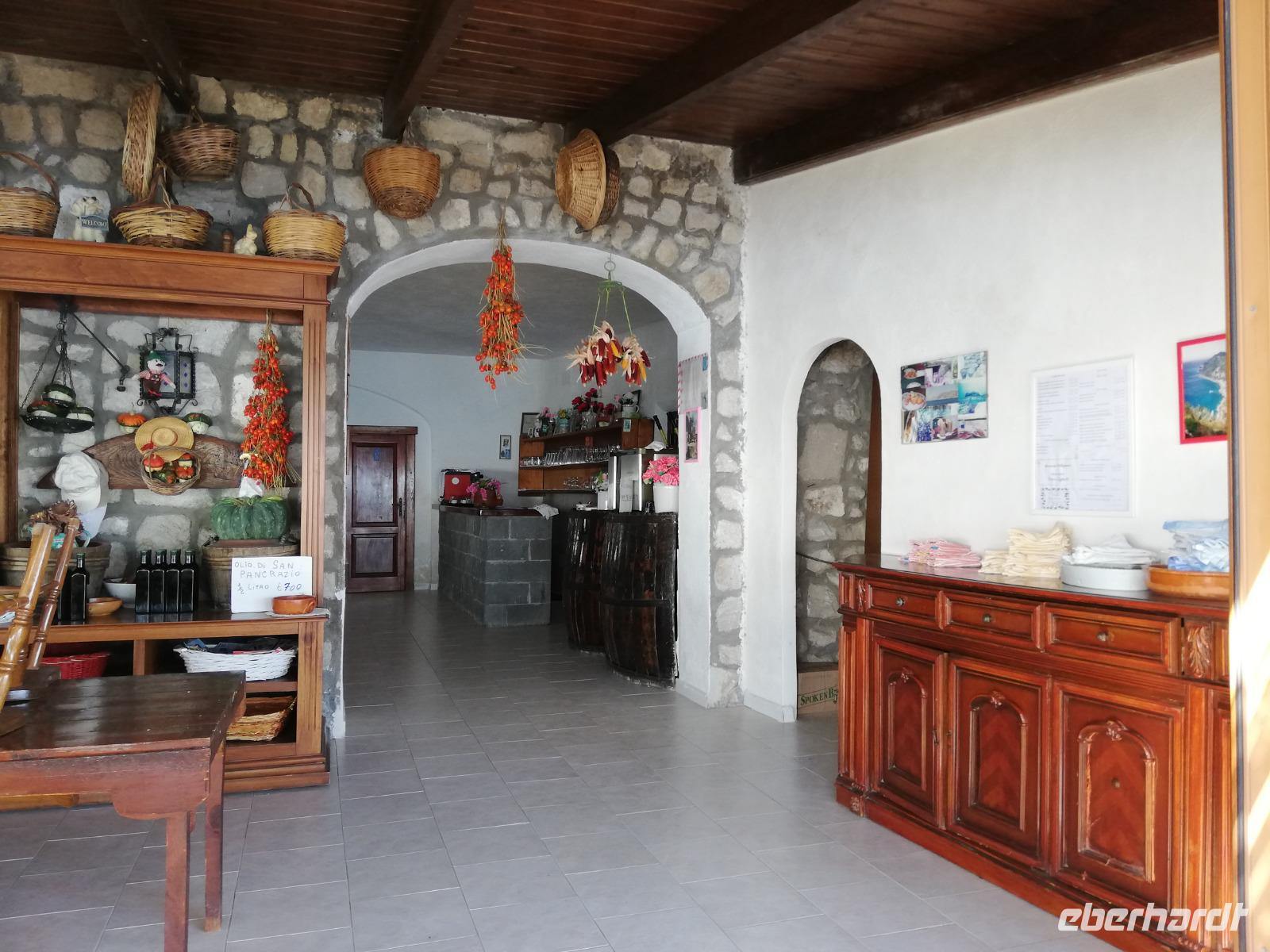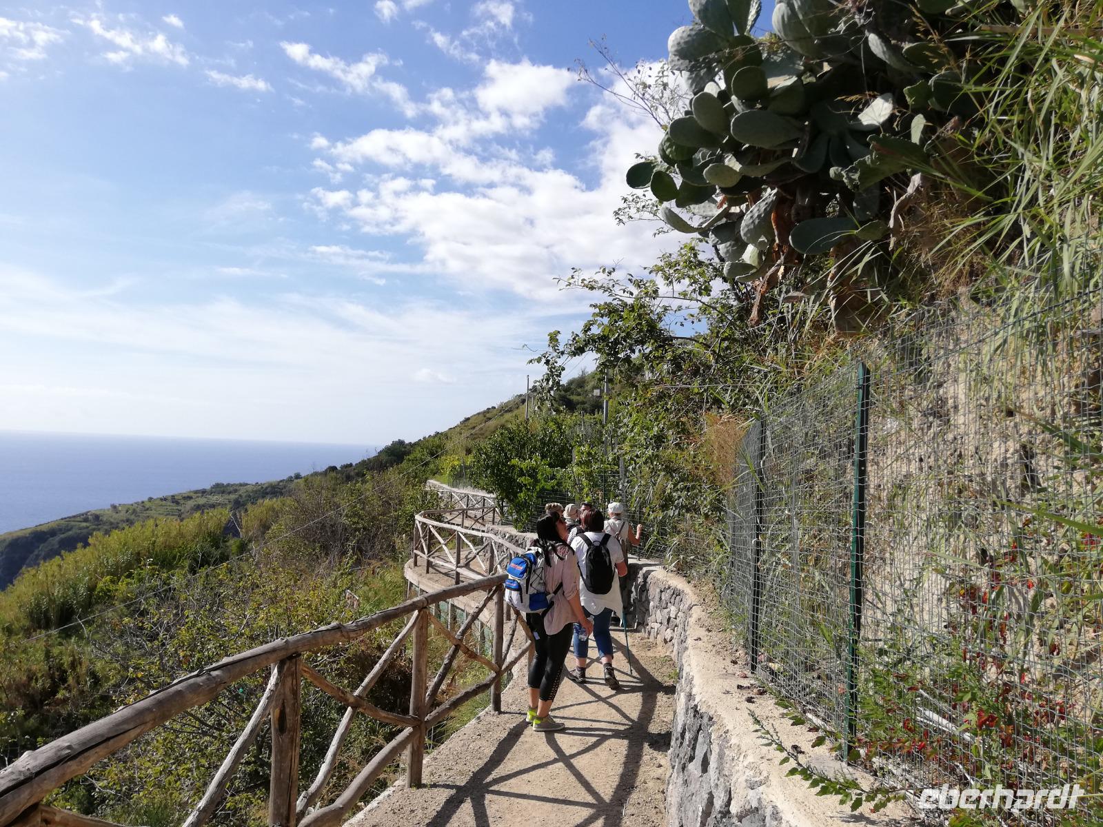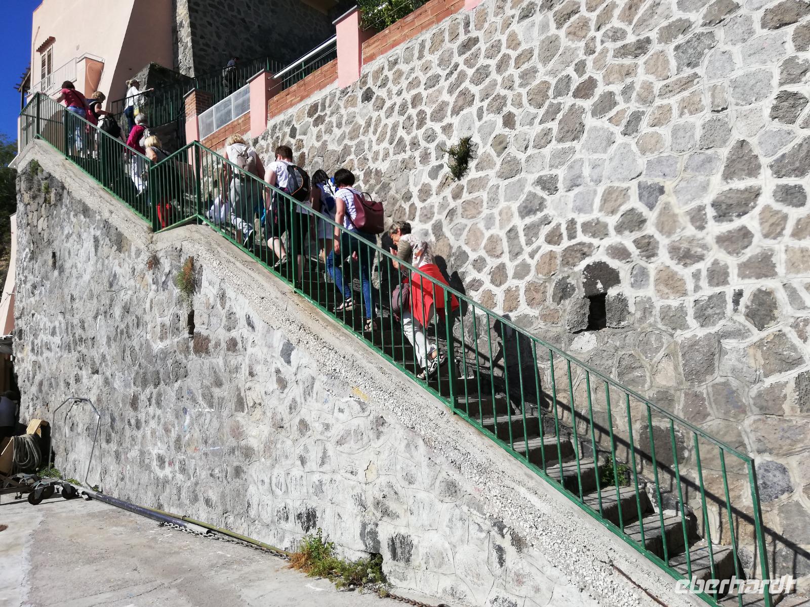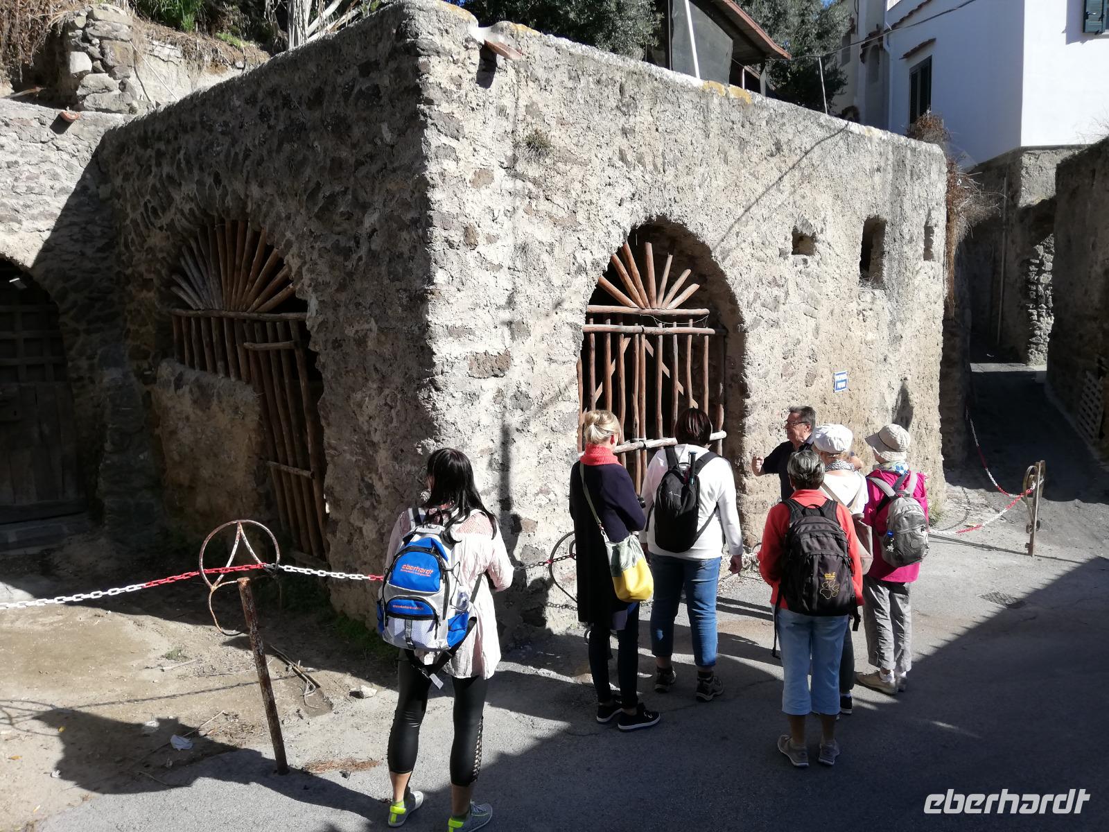 auch heute wiederum mit einem Kleinbus in die Richtung des Ortes Ischia. In Campagnano starten wir unsere Wanderung. Wir beginnen in der Kirche Santa Maria Annunziata.Auf unserem weiteren Weg informiert uns Giovanni zur Herstellung und Anbaus des Weins auf der Insel. Auf dem Weg in die Berge haben wir immer wieder einen tollen Blick auf das Castello Argagonese. Die Strecke ist angenehm zu wandern und wir haben Freude mit der Gruppe in dieser Natur zu sein. Erst später reicht uns Giovanni einige „Wanderstöcke" und kurz vor dem Ziel müssen wir uns schon noch anstrengen. Für uns aber keine Hürde, egal wie alt, wir schaffen das. Sehr zufrieden kommen wir im Restaurant Piano Liguori an und werden hier sehr verwöhnt.Maria hat für uns gekocht und reicht uns
