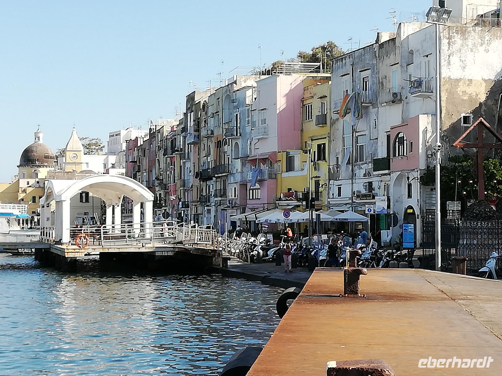 Aufregend ist unsere anschließende Inselrundfahrt durch enge Straßen. An einigen Punkten planen wir einen Fotostopp und sehen u.a.auch die Brücke, die die kleine Insel Vivara mit Procida verbindet.