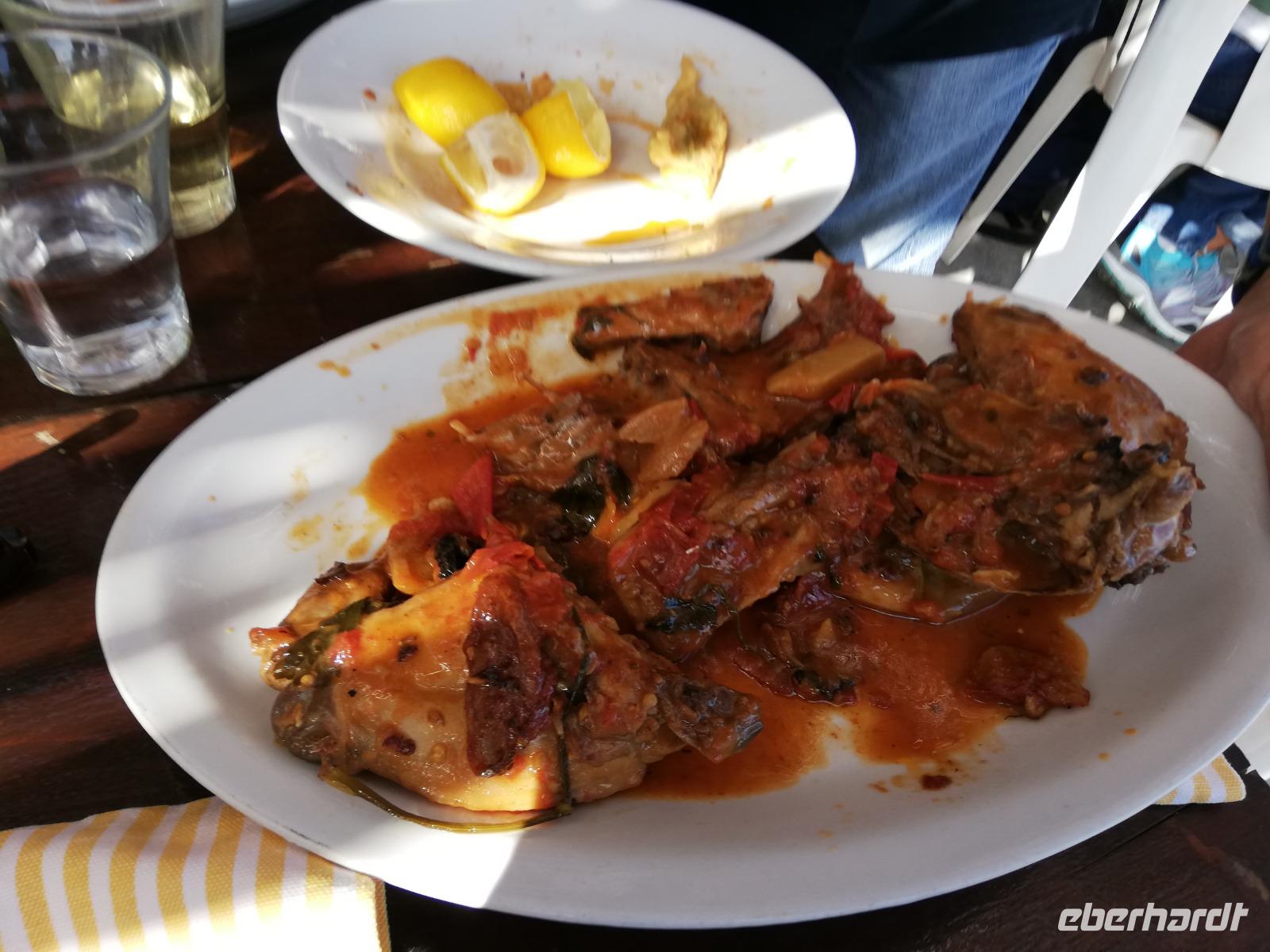 Antipasti, Spaghetti mit Kaninchensoße ,Kaninchenfleisch mit Artischocken , Wasser ,weißen und roten Hauswein und auch der leckere Nachtisch lässt keine Wünsche offen.