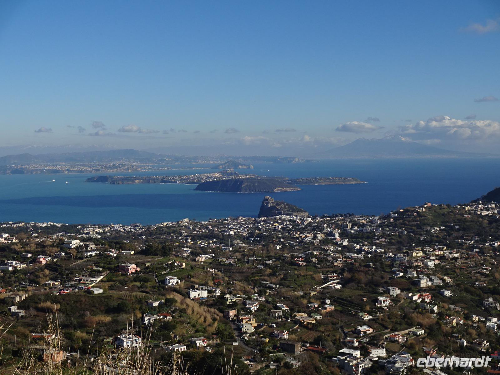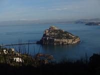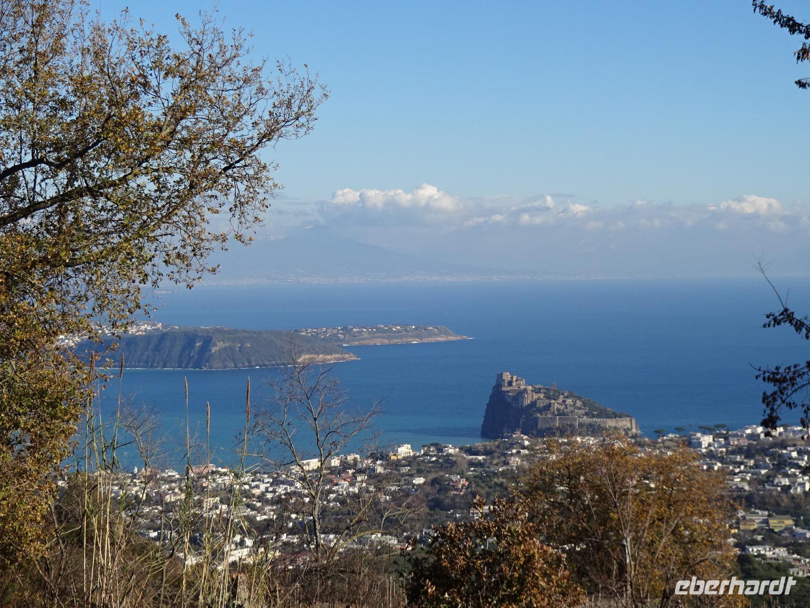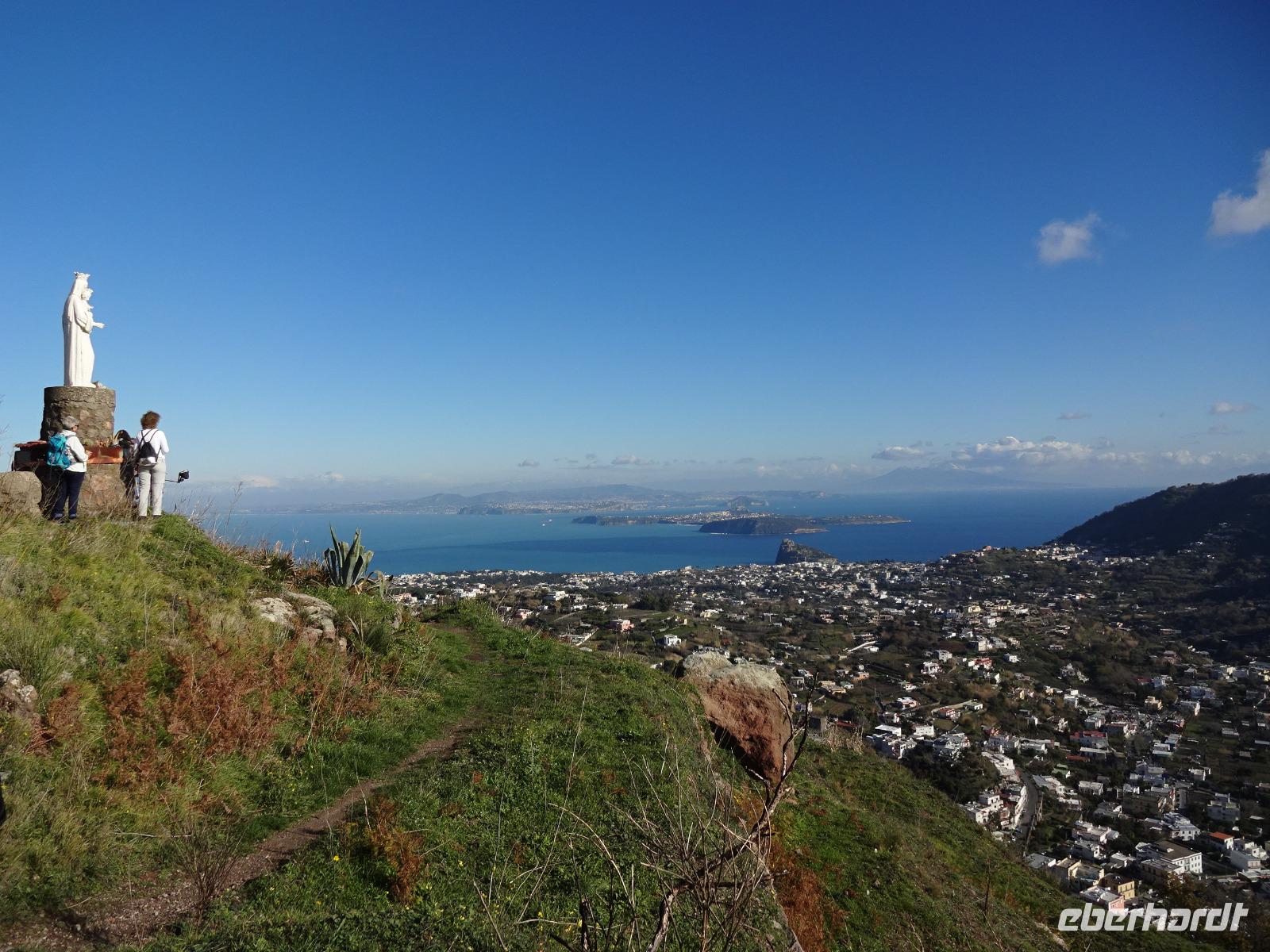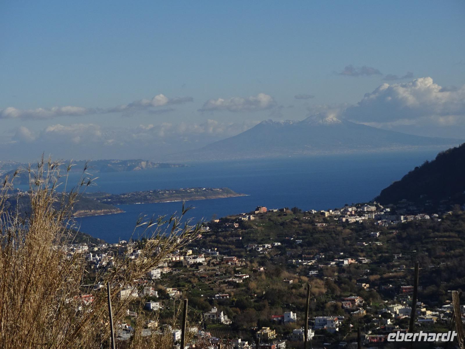 Der Sturm hatte alle Wolken weggefegt, und als wir am 2. Tag unserer Reise mit unserem local guide Biagio zu unserer ersten Wanderung aufbrachen, erwartete uns Sonnenschein und blitzblauer Himmel in Bounopane, von wo aus wir starteten. Unsere Wanderung führte uns auf schmalen Pfaden bergauf und bergab mit einem traumhaften Blick auf den verschneiten Vesuv durch Eichenwälder und Weinberge an einer Marienstatue vorüber. Zur Mittagszeit kehrten wir in den Weinbergen ein. Leckere Bruschetta und ein herrlicher Salat wurde uns aufgetischt. Wir saßen draußen in der Sonne und unser Blick fiel auf die Insel Procida, das Kap Miseno, den Vesuv und das Castello Aragonese, das vor Ischias Hauptstadt auf einer extra Insel liegt, die über einen künstlichen Damm mit Ischia verbunden ist. Weiter ging's durch Pinienwälder abwärts. Am Ende dieser beeindruckenden ersten Wanderung erreichten wir Fumarole, die kräftig qualmten. Tifeo oder Typhon, der Herr der heißen Taifune, soll, wenn man einer Geschichte der Mythologie glaubt, unter Ischia lebendig begraben liegen. Seine Körperteile finden sich in den Ortsnamen wieder: bei Testa liegt sein Kopf, bei Panza sein Bauch, bei Piedimonte seine Füße. Er gibt, folgt man den Ortsnamen, eine komische Figur ab, dessen Auge weit entfernt vom Kopf liegt. Tifeo schnaubt vor Wut über seine missliche Lage und aus seinen Nasenlöchern, den Fumarolen vor denen wir nun standen, qualmt es. Gegen Abend kehrten die Wanderer voller bunter Bilder im Kopf und in der Kamera ins Hotel zurück und verschwanden mehrheitlich im hoteleigenen Thermalbad. Unser Grüppchen Nicht-Wanderer hatte sich diesen Tag nach persönlichen Wünschen gestaltet und dabei waren die meisten natürlich auch im Thermalwasser gelandet.