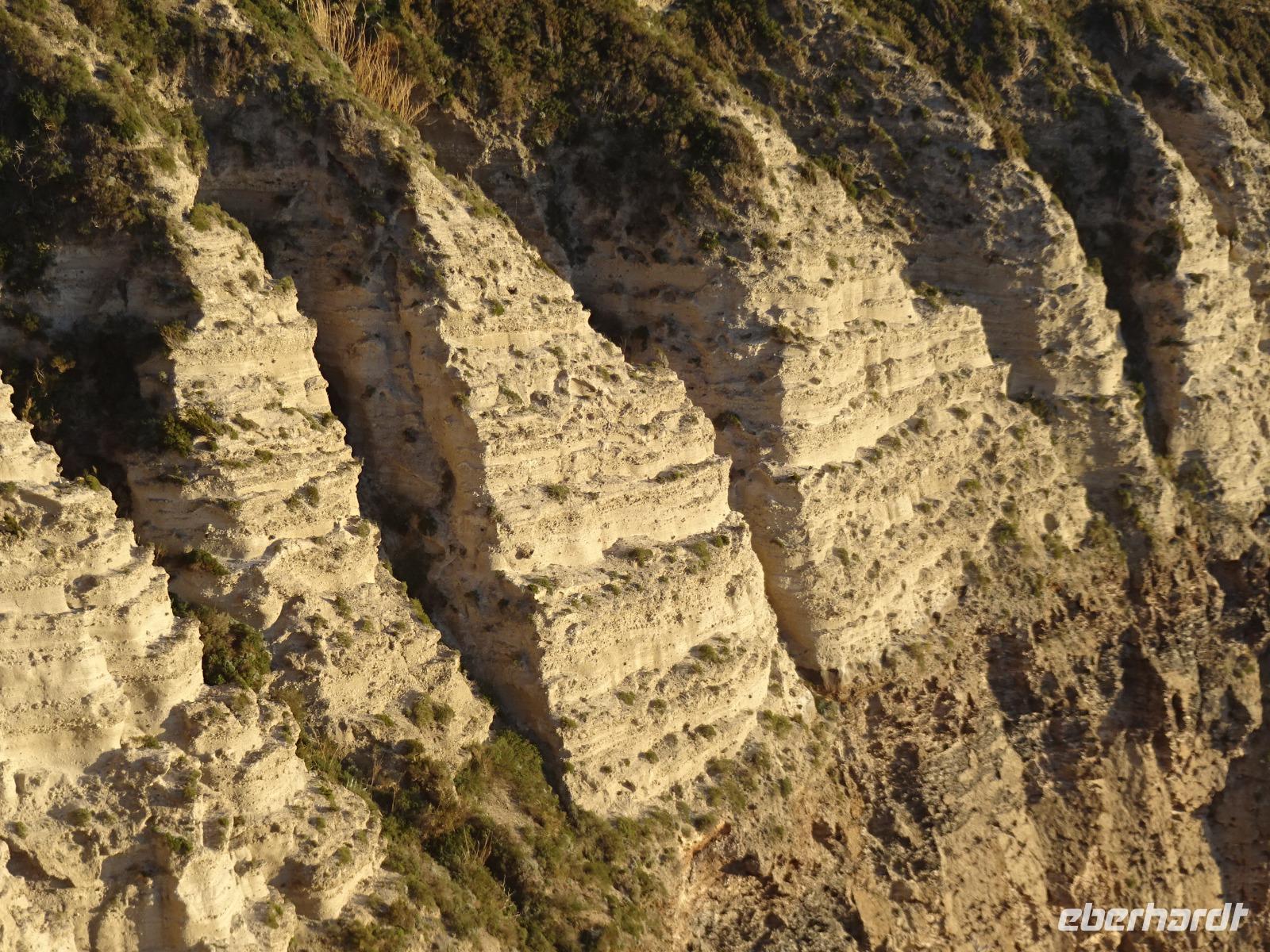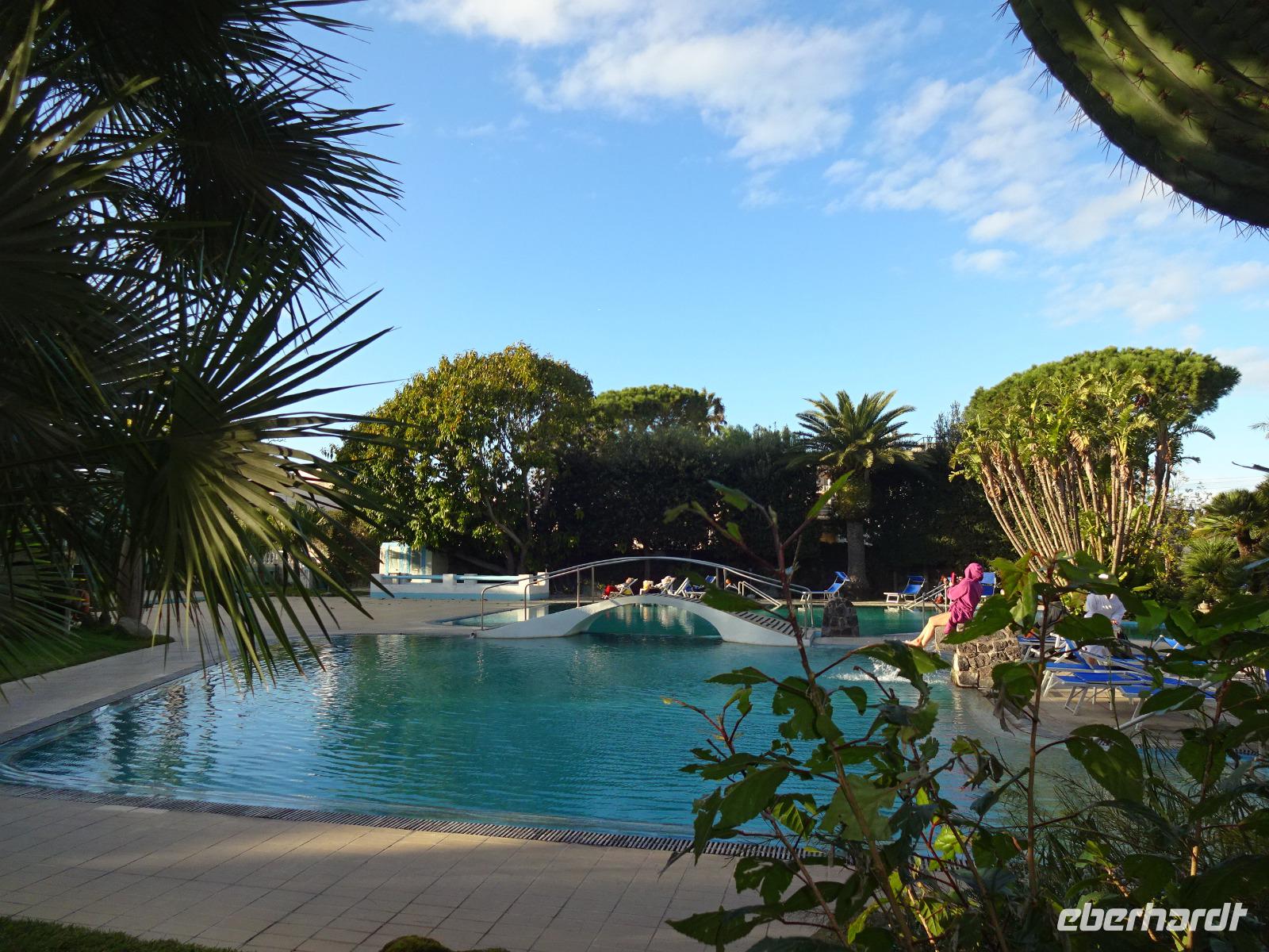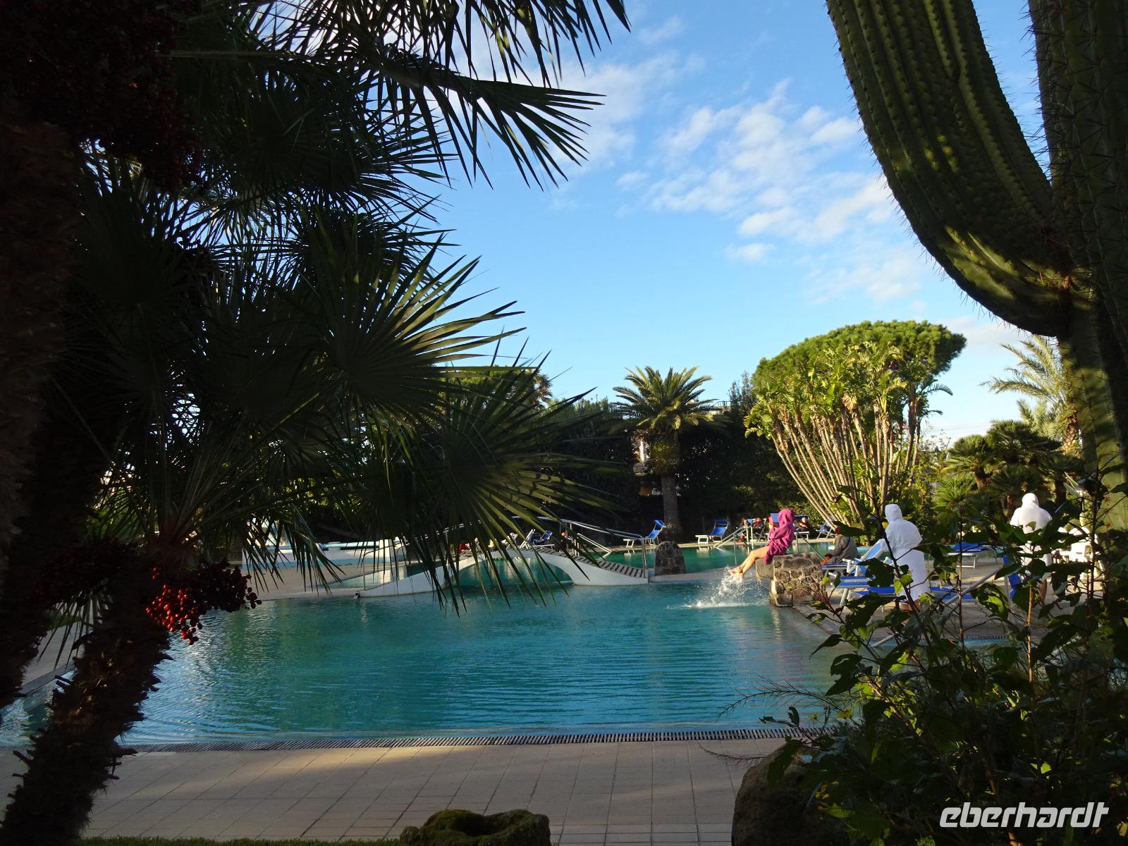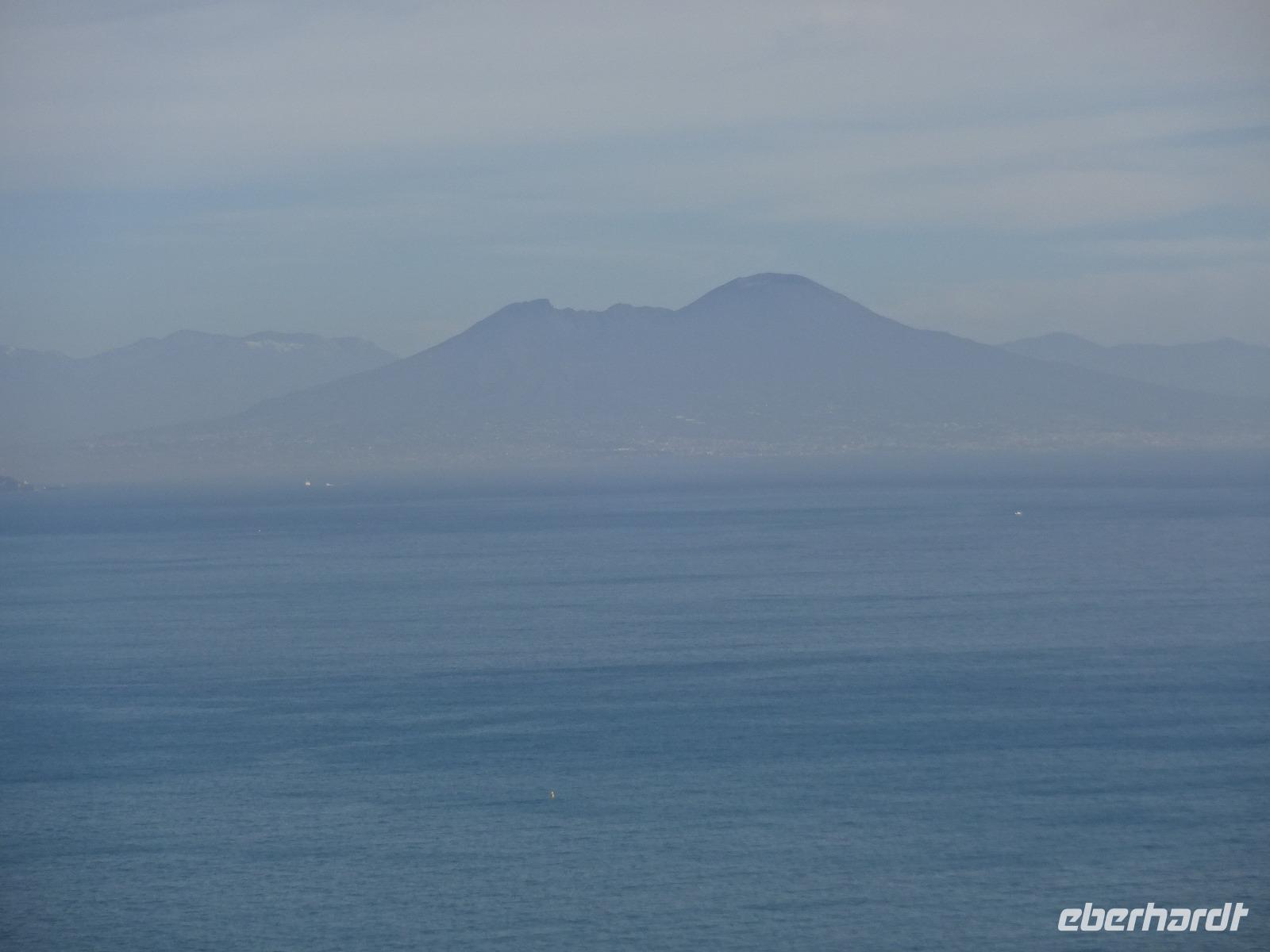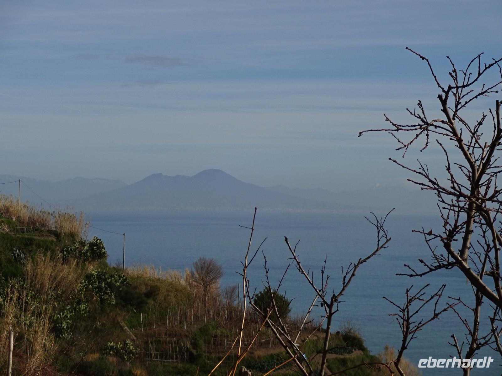 Der Sturm hatte alle Wolken weggefegt, und als wir am 2. Tag unserer Reise mit unserem local guide Biagio zu unserer ersten Wanderung aufbrachen, erwartete uns Sonnenschein und blitzblauer Himmel in Bounopane, von wo aus wir starteten. Unsere Wanderung führte uns auf schmalen Pfaden bergauf und bergab mit einem traumhaften Blick auf den verschneiten Vesuv durch Eichenwälder und Weinberge an einer Marienstatue vorüber. Zur Mittagszeit kehrten wir in den Weinbergen ein. Leckere Bruschetta und ein herrlicher Salat wurde uns aufgetischt. Wir saßen draußen in der Sonne und unser Blick fiel auf die Insel Procida, das Kap Miseno, den Vesuv und das Castello Aragonese, das vor Ischias Hauptstadt auf einer extra Insel liegt, die über einen künstlichen Damm mit Ischia verbunden ist. Weiter ging's durch Pinienwälder abwärts. Am Ende dieser beeindruckenden ersten Wanderung erreichten wir Fumarole, die kräftig qualmten. Tifeo oder Typhon, der Herr der heißen Taifune, soll, wenn man einer Geschichte der Mythologie glaubt, unter Ischia lebendig begraben liegen. Seine Körperteile finden sich in den Ortsnamen wieder: bei Testa liegt sein Kopf, bei Panza sein Bauch, bei Piedimonte seine Füße. Er gibt, folgt man den Ortsnamen, eine komische Figur ab, dessen Auge weit entfernt vom Kopf liegt. Tifeo schnaubt vor Wut über seine missliche Lage und aus seinen Nasenlöchern, den Fumarolen vor denen wir nun standen, qualmt es. Gegen Abend kehrten die Wanderer voller bunter Bilder im Kopf und in der Kamera ins Hotel zurück und verschwanden mehrheitlich im hoteleigenen Thermalbad. Unser Grüppchen Nicht-Wanderer hatte sich diesen Tag nach persönlichen Wünschen gestaltet und dabei waren die meisten natürlich auch im Thermalwasser gelandet.