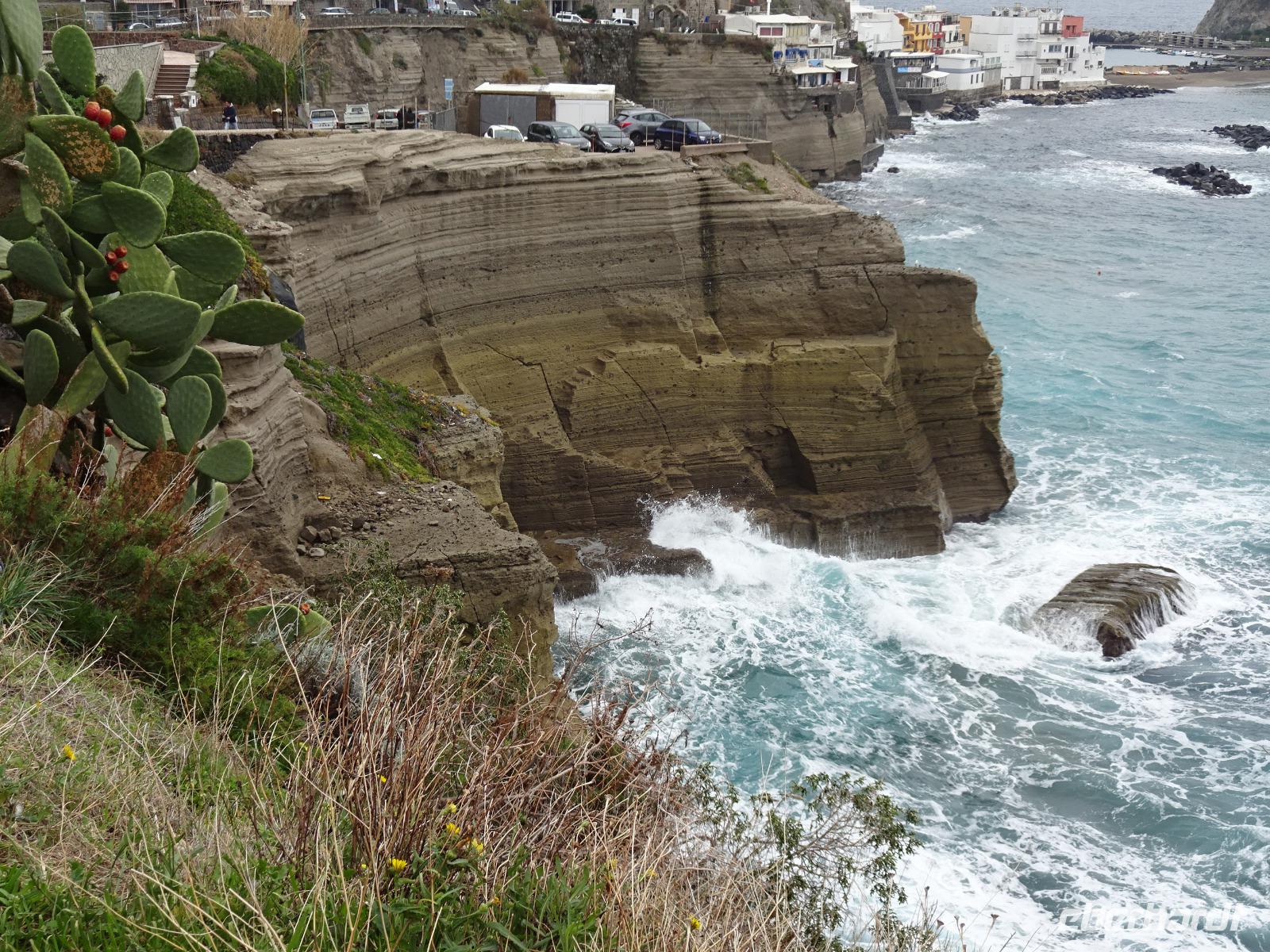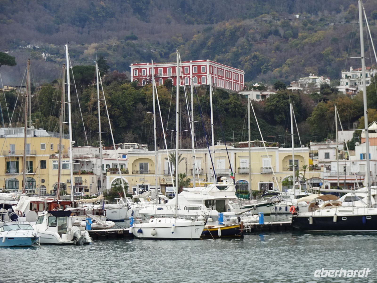 Für einige von uns ging es schon sehr früh los, denn wir flogen oder fuhren von verschiedenen Orten aus morgens nach Frankfurt, von wo aus fast die ganze Gruppe am späten Vormittag nach Neapel flog. Dort trafen wir dann noch die Gäste, die auf anderen Wegen angereist waren. Der erste Tag unserer Silvester-Wanderreise hatte so seine Tücken, denn ein Sturm fegte über Süditalien hinweg und so mussten wir umplanen. Der Bus brachte uns nicht an den Hafen von Neapel, denn dort fuhren keine Schiffe mehr. Er brachte uns nach Pozzuoli. Geduldig warteten wir hier bis am frühen Abend schließlich ein großes Schiff noch bis Ischia fuhr. Ischia empfing uns feucht und dunkel, aber das Hotel wartete noch am späteren Abend mit einem leckeren Essen auf.
