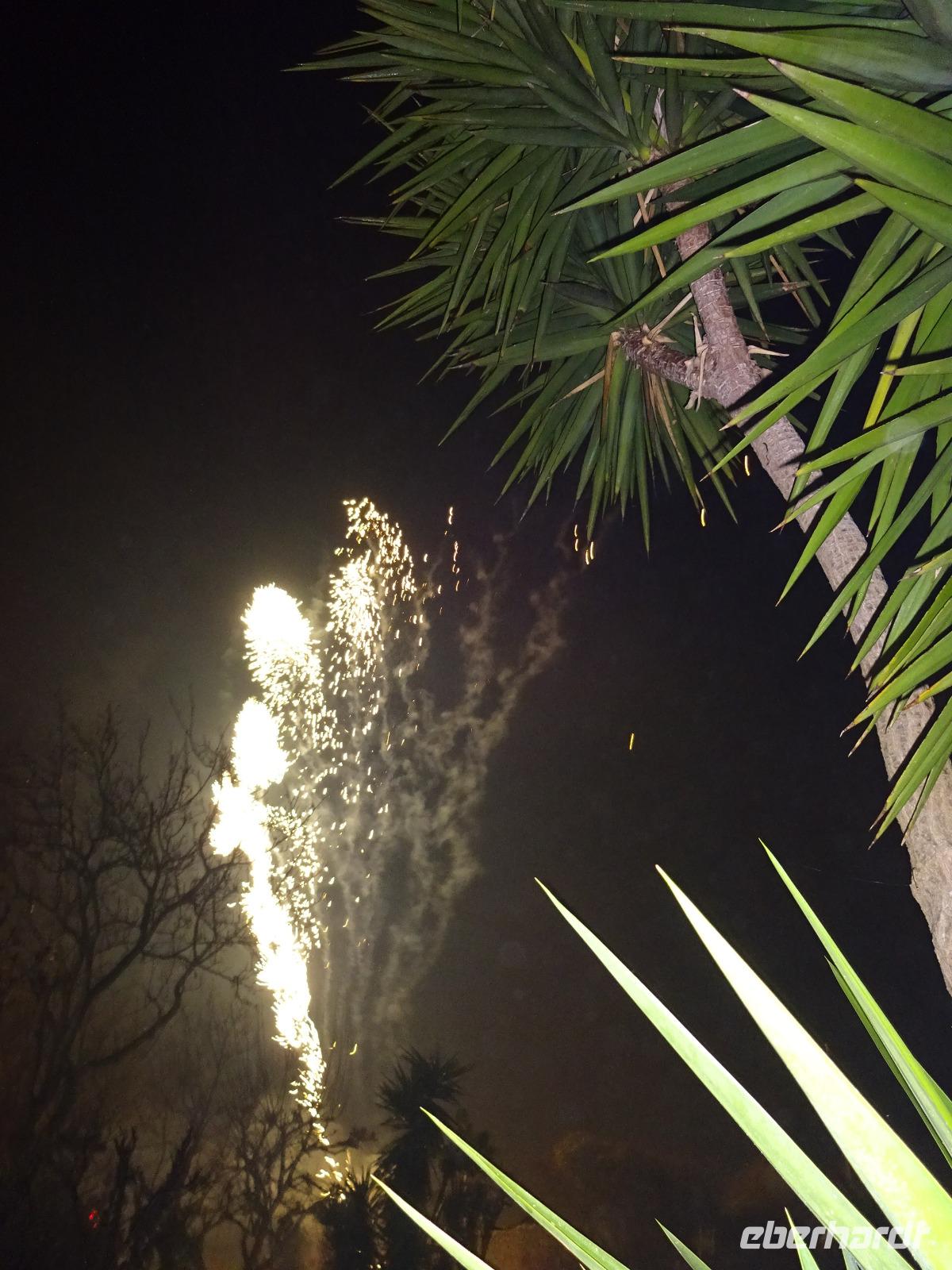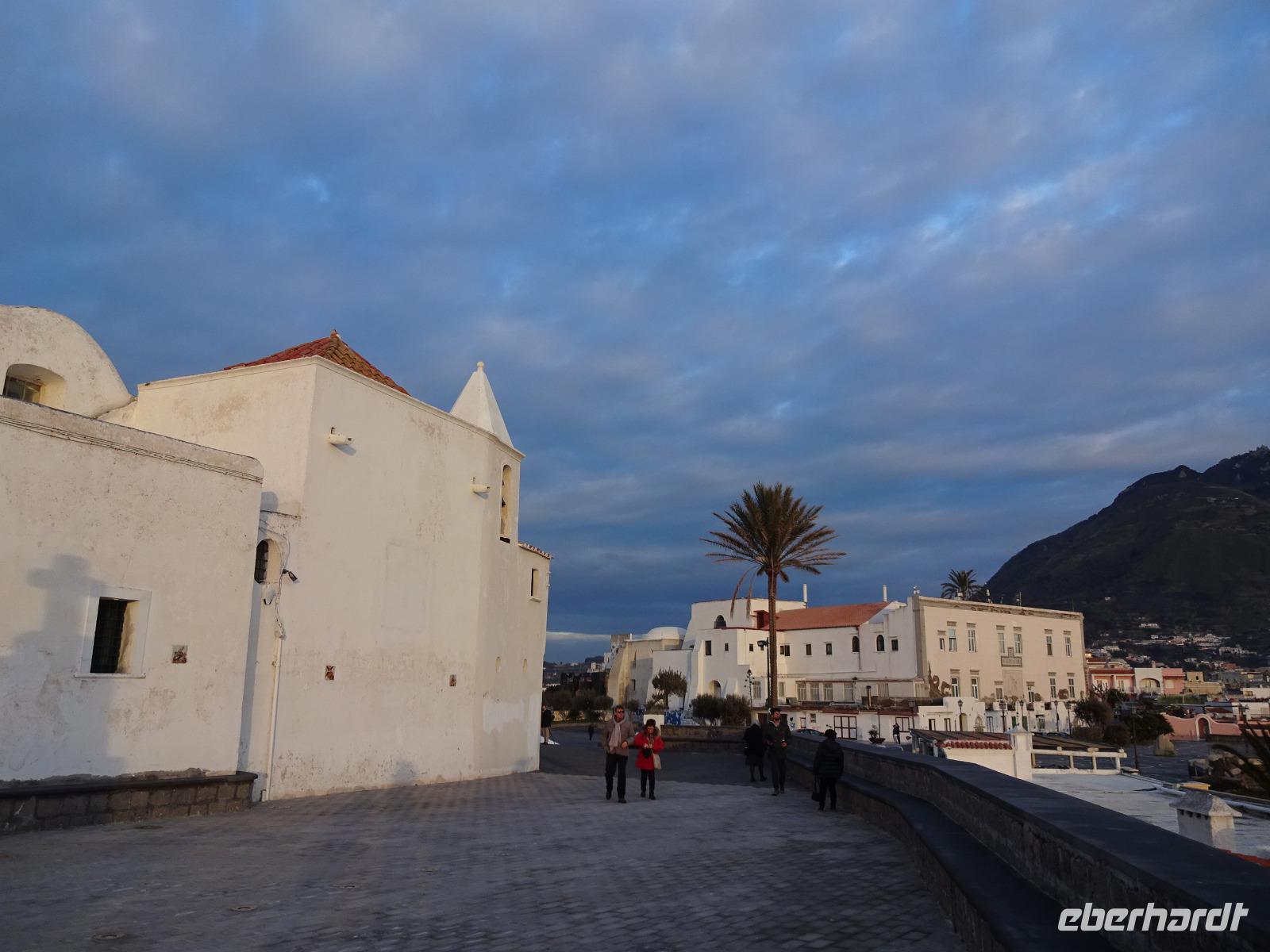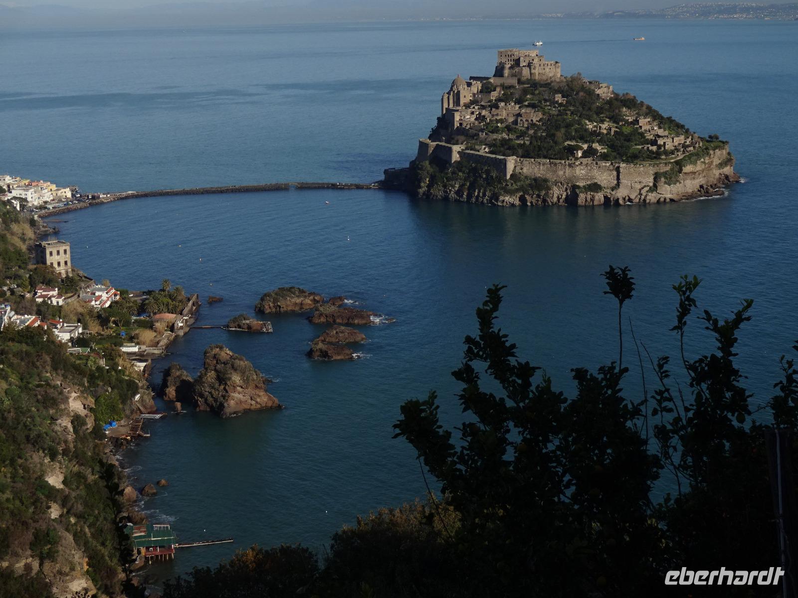 Der letzte Tag des Jahres 2017 brach an und unsere local guide Gabi führte uns mit dem Bus durch uns bisher unbekannte Orte der Insel Ischia. Unseren ersten Halt machten wir in Sant'Angelo, wo Angela Merkel wohl häufiger ihren Urlaub verbringt. Danach durchfuhren wir mehrere Bergdörfer, bewunderten die Felsenhäuser an der Straße, wagten einen Blick aufs Aquädukt, über das ab dem 17. Jh. bis ins 20. Jh. hinein das Trinkwasser der Inselhauptstadt geleitet wurde, und bummelten anschließend durch Ponte. Die Einheimischen essen hier am Neujahrstag gebratenen Fisch und andere Leckereien, die man an Ständen auf der Straße kauft. Wir taten es ihnen gleich. Dann trennten sich unsere Wege, denn ein paar Gäste wollten das Castello Aragonese sehen und die Reiseleiterin begleitete sie, während der Rest der Gruppe mit Gabi die Inselrundfahrt fortsetzte, noch einiges über Casamicciola, Lacco Ameno und Forio erfuhr, bevor diese Gäste schließlich wieder das Hotel erreichten und größtenteils im Thermalwasser verschwanden. Das Castello Aragonese bot seinen Besuchern einige interessante und schöne Eindrücke. So besichtigten wir die Begräbnisplätze des Klarissenklosters im Keller, durchstreiften Kirchenruinen, machten eine sehr nette Pause im Burgcafe und durchwanderten fast alle die alten Weinberg- und Oliventerrassen, wo wir wunderschöne Aussichtspunkte erreichten, schauten uns im Wachhaus noch die schaurigen Werkzeuge, die man früher zur Bestrafung unliebsamer Artgenossen verwendet hatte, an und fuhren dann mit öffentlichen Bussen zurück ins Hotel, was uns problemlos gelang. Man traf sich teils wieder im Thermalwasser, bevor unser Silvesterabend mit Tanz und langem Menu begann. Ein Feuerwerk begleitete uns ins neue Jahr - Auguri! Alles Gute in 2018!!