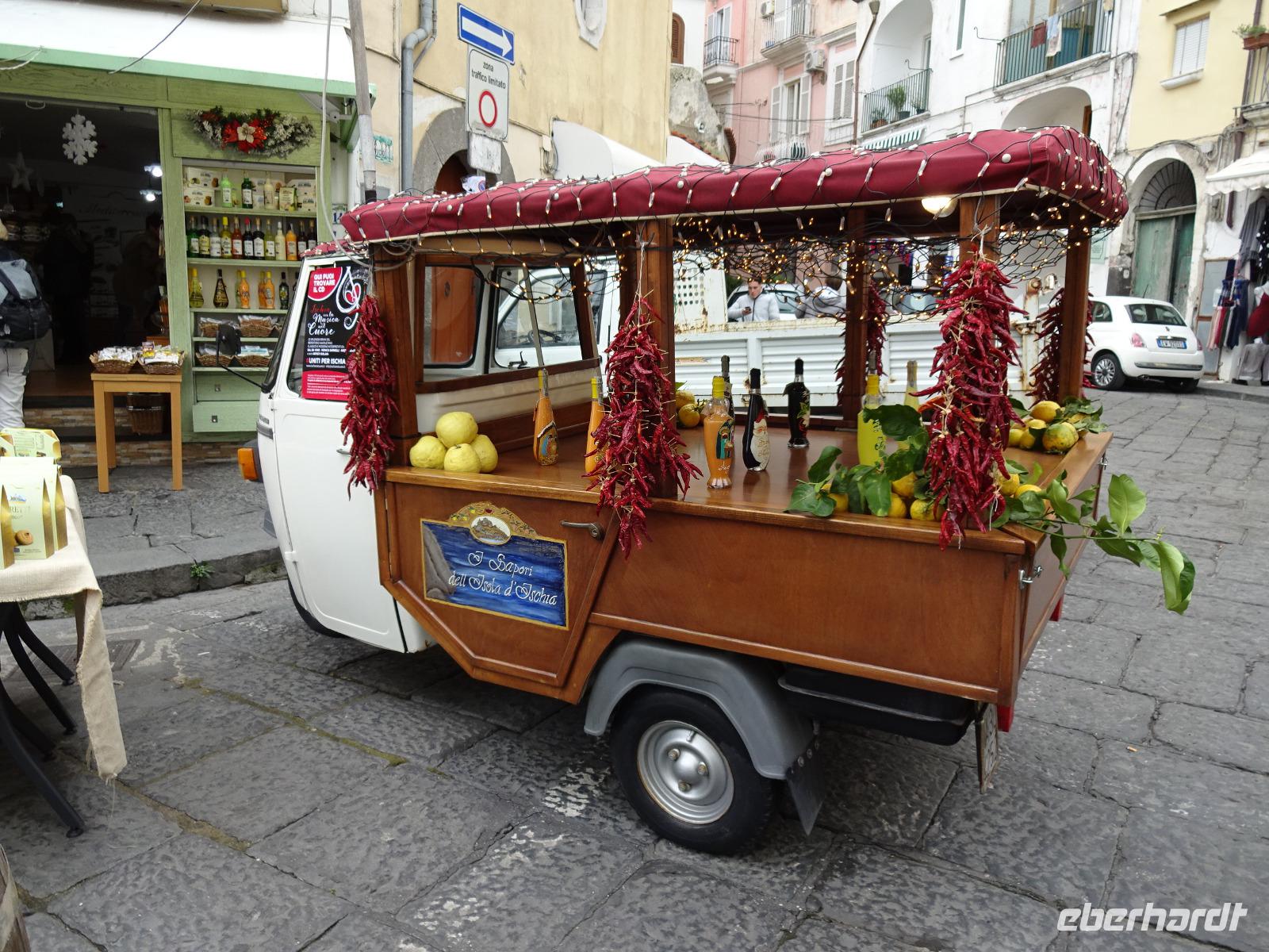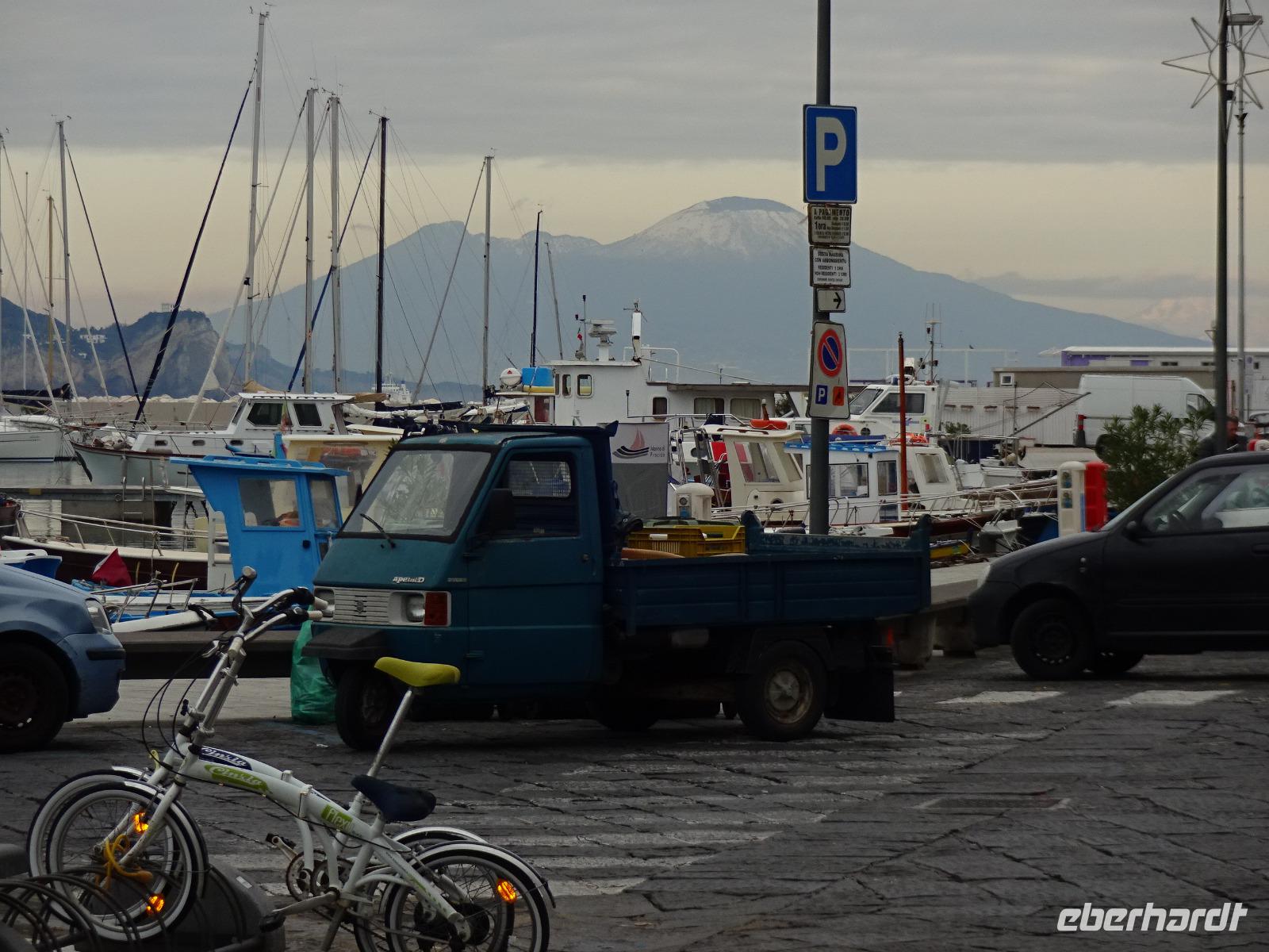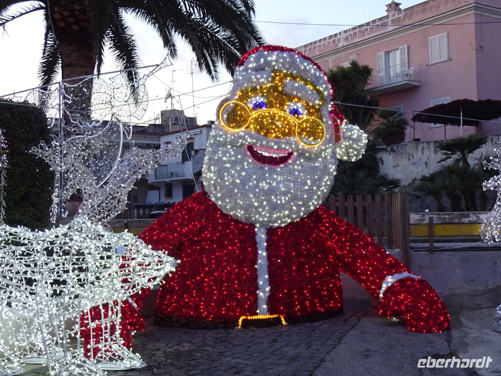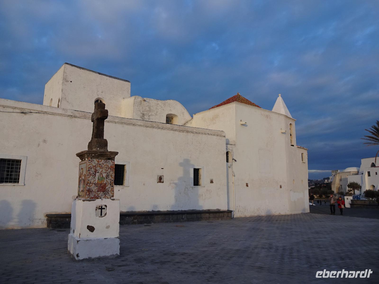 Heute mussten wir alle pünktlich sein - Schiffe warten nicht! Um 9 Uhr ging's los. Der Bus brachte uns an den Hafen von Casamicciola, wo uns Biagio erwartete, und per Schnellfähre ging's ab nach Procida, wo wir in Sancio Cattolico anlegten. Biagio verteilte uns in 3 Taxis, 2 normale und ein Microtaxi, bestehend aus einer Ape. Die Apefahrer hatten heute ihr privates Abenteuer. Wir fuhren laut knatternd hoch zur Festung Terra Murata, dem ummauerten Land, genossen dort die Aussicht, bewunderten in der Kirche die Weihnachtskrippen und zogen abwärts am Denkmal des Politikers Scialoja vorbei zum romantischen Hafen von Corricella. Hier war der in Italien zum Kultfilm gewordene Streifen „Il postino", eine nette Geschichte über den Briefträger Nablo Nerudas, gedreht worden. Danach umfuhren die Taxis mit uns die Insel und nach einer Fotopause landeten wir mal wieder vor vollen Tellern: sehr leckere Antipasti gibt's auch auf Procida! Nach einem Bummel durch Sancio Cattolico ging's mit dem Schiff zurück nach Ischia. Dieses Schiff legte nun im Hafen von Porto an, einem alten Vulkankrater, der erst im 19. Jh. zum Fährhafen ausgebaut wurde. Ein Teil der Gäste verließ mit der Reiseleiterin bereits unten am Meer in Forio den Bus, der uns am Hafen von Porto abgeholt hatte und die Gruppe zurück ins Hotel brachte. Wir bummelten zur Seefahrerkirche Chiesa del Soccorso, die den Malern der deutschen Künstlerkolonie, die sich hier in den 1940er und 50er Jahren gebildet hatte, als Motiv diente und schauten der Sonne zu, wie sie hinter den Wolken am Horizont verschwand. Danach bummelten wir durch die weihnachtlich geschmückte Einkaufsstraße heimwärts. Nach einem etwas mühevollen Marsch erwartete uns im Hotel wie jeden Abend wieder ein hervorragendes Essen, bei dem sich die ganze Gruppe wieder traf.