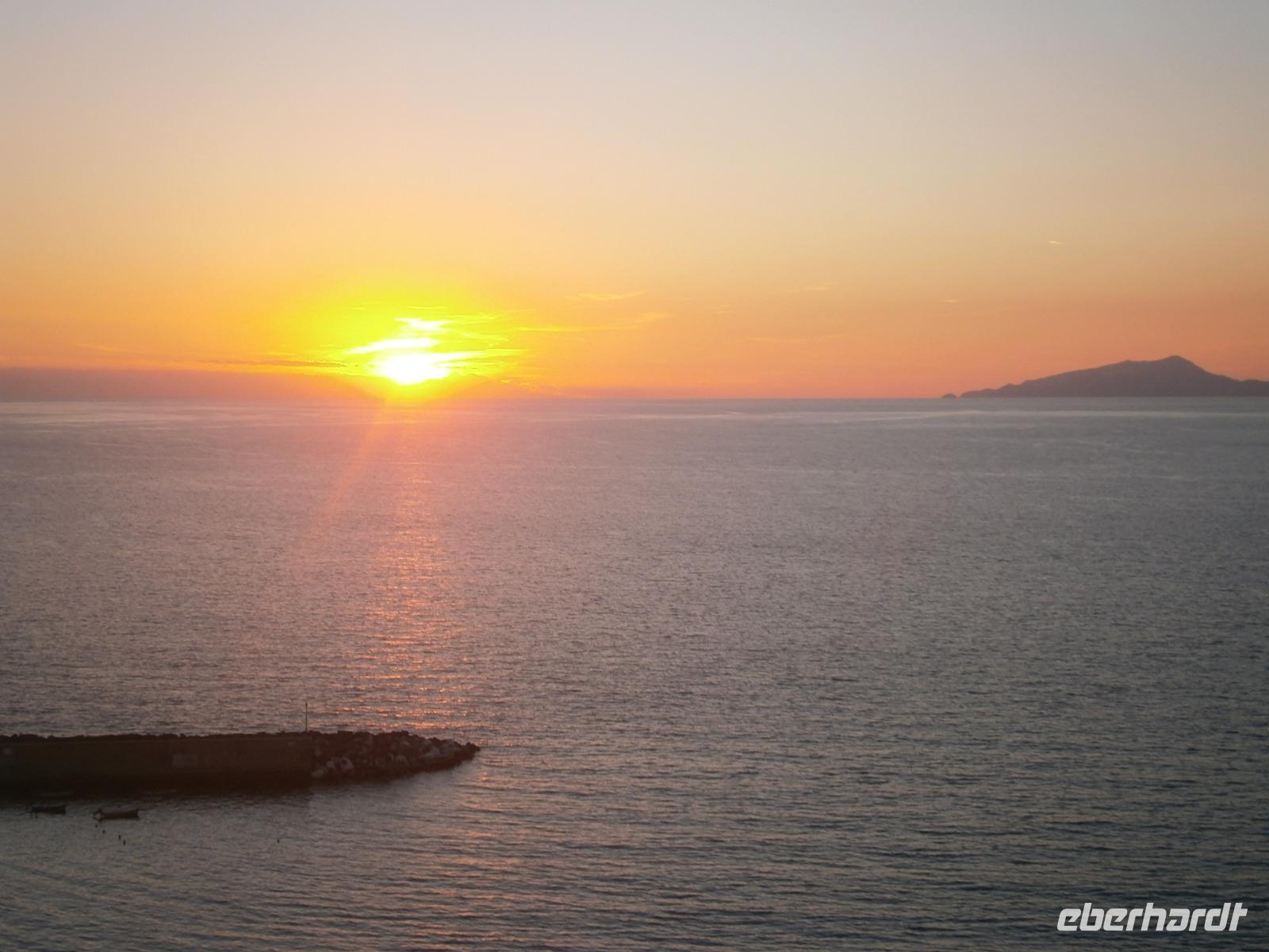 Am frühen Morgen wurden einige Reisegäste mit einem Kleinbus von Dresden zum Flughafen Berlin-Tegel gebracht, wo wir dann die anderen Reisegäste unserer Gruppe trafen. Im Transitraum ließ man uns lange auf eine Erklärung für die Verspätung des Fluges warten. Dies war aber eine gute Möglichkeit einander schon kennen zu lernen. Wir waren doch eine sehr kleine Gruppe, fast schon ein „ Familienausflug". Nach unsere Landung am Flughafen von Neapel, brachte uns unsere Busfahrer Salvatore nach Meta. Unterwegs boten sich fantastische Blicke auf den Golf von Sorrent mit dem Vesuv im Hintergrund und auf die Inseln Ischia und Capri- und die italienische Sonne strahlte auch! Von unserem Hotel bot sich ein einladender Blick in die Bucht und auf den Strand. So trafen wir uns nach einer kurzen Erfrischung gleich wieder zu einem Strand- und Stadtbummel, bei dem wir etliche verwinkelte Gässchen entdeckten. Vor dem Abendessen konnten wir uns noch an einem glutroten Sonnenuntergang - nicht bei Capri, aber ganz in der Nähe - erfreuen.