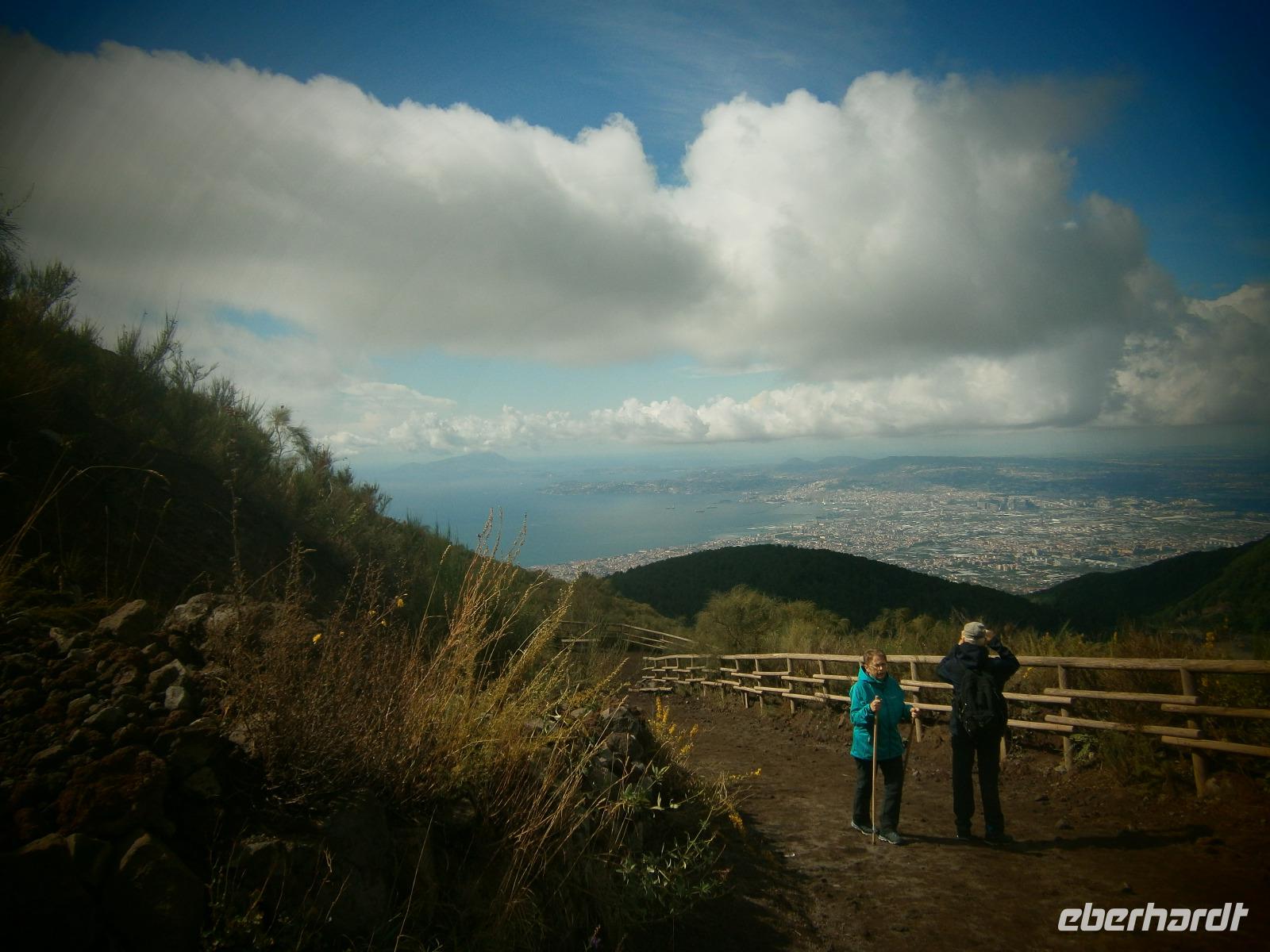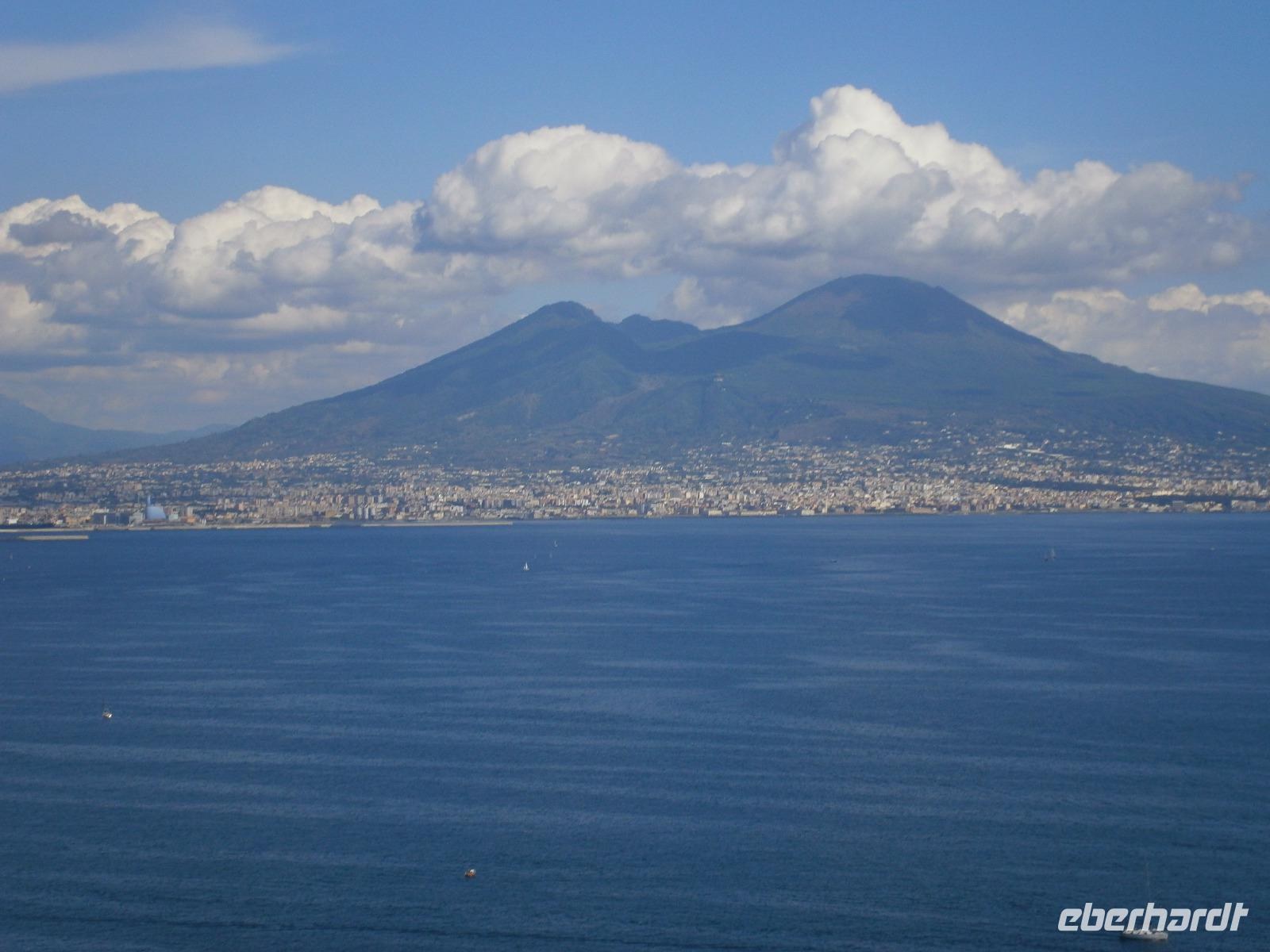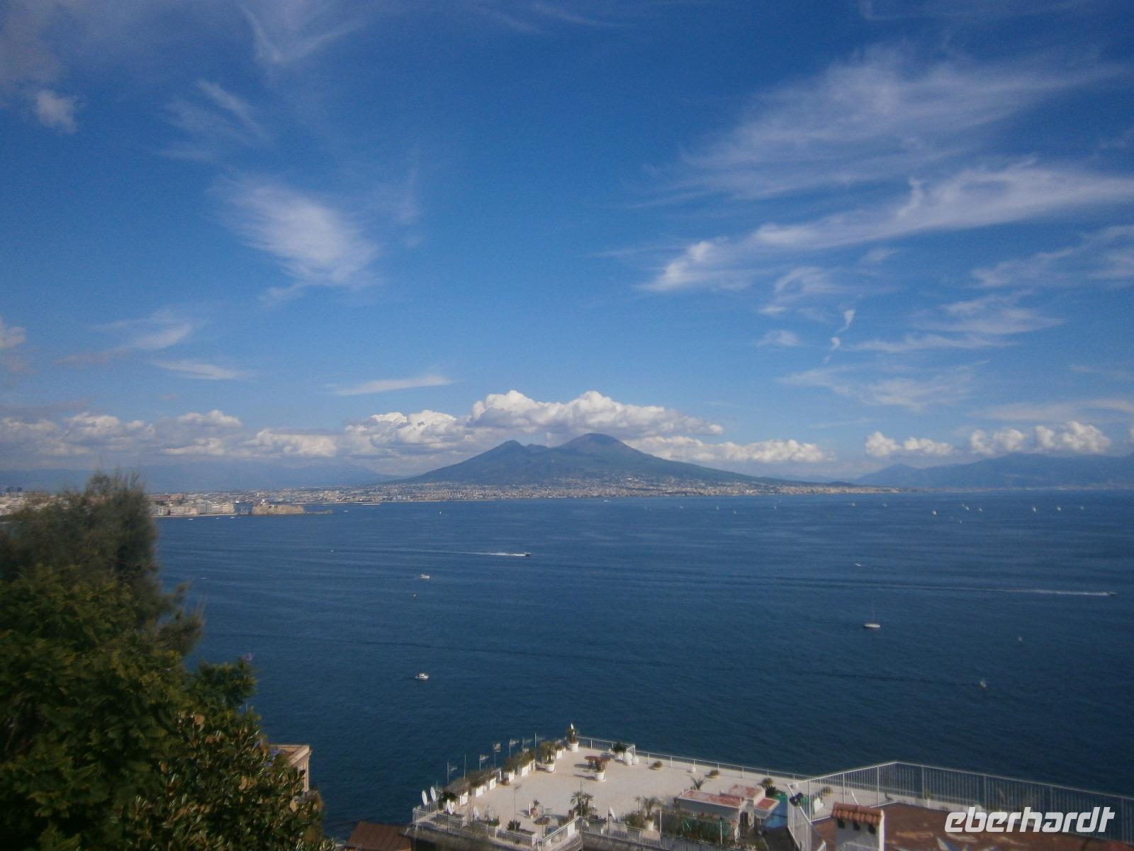 Am Morgen regnet es sehr stark, der Gipfel des Vesuvs ist in dicke Wolken gehüllt. So kaufen sich einige von uns in Pompeji erst mal ein Regencape, die Händler freuen sich - wahrscheinlich besonders, als es kurz darauf aufhörte zu regnen! Unser Reiseführer Antonio zeigt uns die nach dem Ausbruch im Jahre 79 unter einer dicken Ascheschicht begrabene und dadurch in ihrer Struktur sehr gut erhaltenen Stadt. Er machte uns auf viele kleine Zeichen aufmerksam, die wir vielleicht übersehen hätten, welche aber das Leben in der Stadt für uns nachvollziehbar machten. Nach einem kurzen Imbiss brachte uns der Bus zum Vesuv. Während des Aufstiegs boten sich uns immer wieder einzigartige Blicke auf den Golf von Neapel. Um den Kraterrand wurden wir von einem humorigen Bergführer geleitet, der natürlich auch Interessantes aus der Geschichte des Vulkans und seiner Besucher zu erzählen wusste.