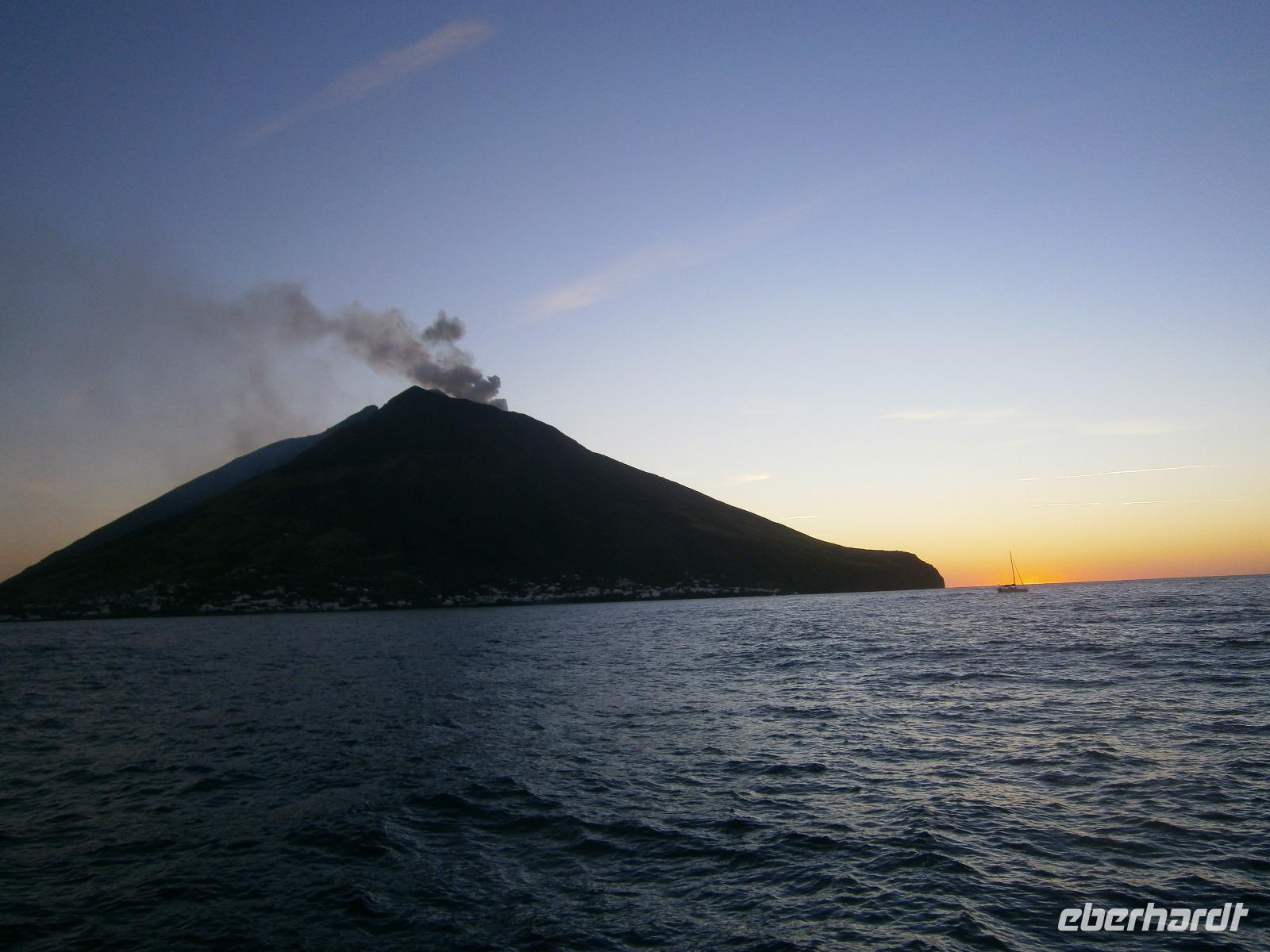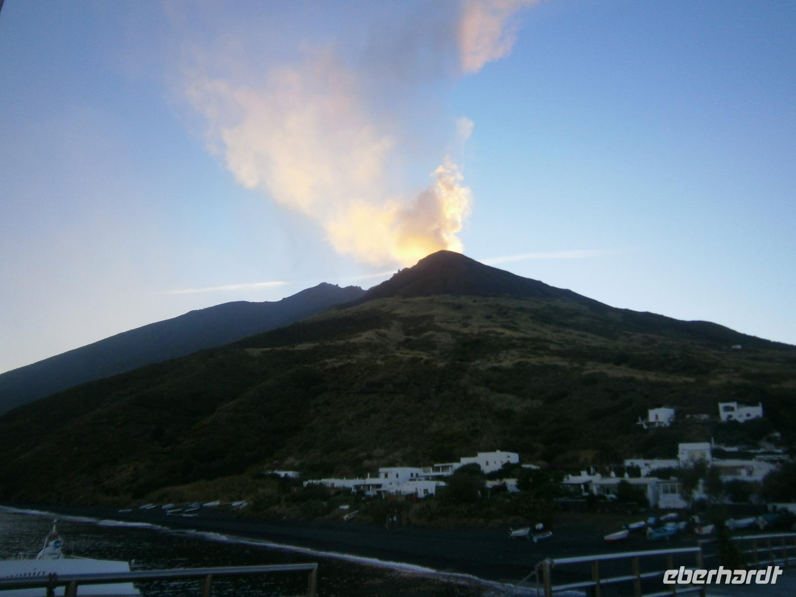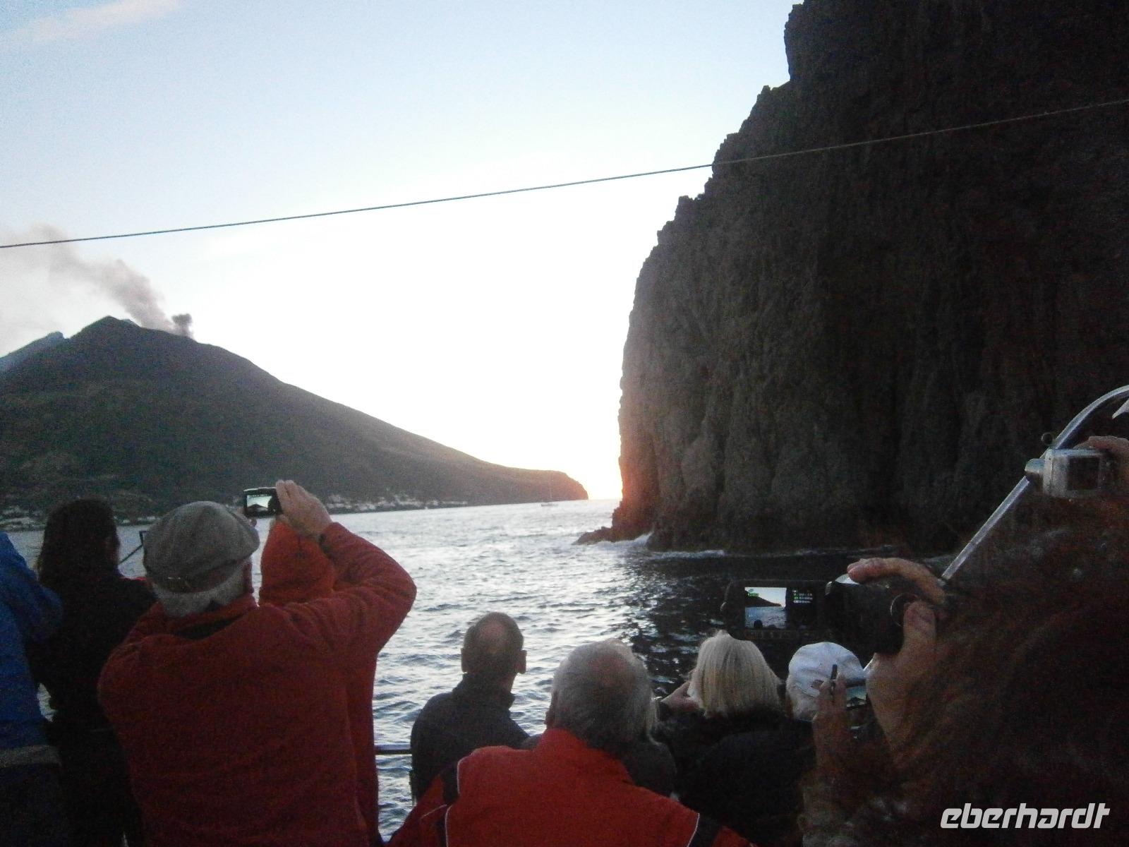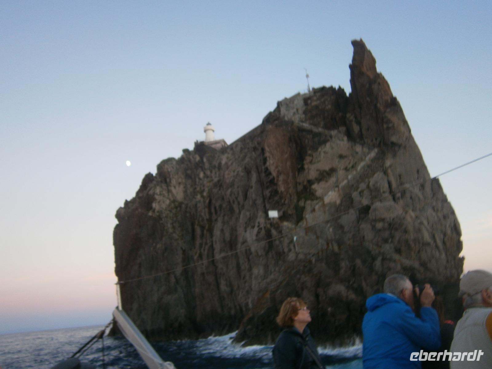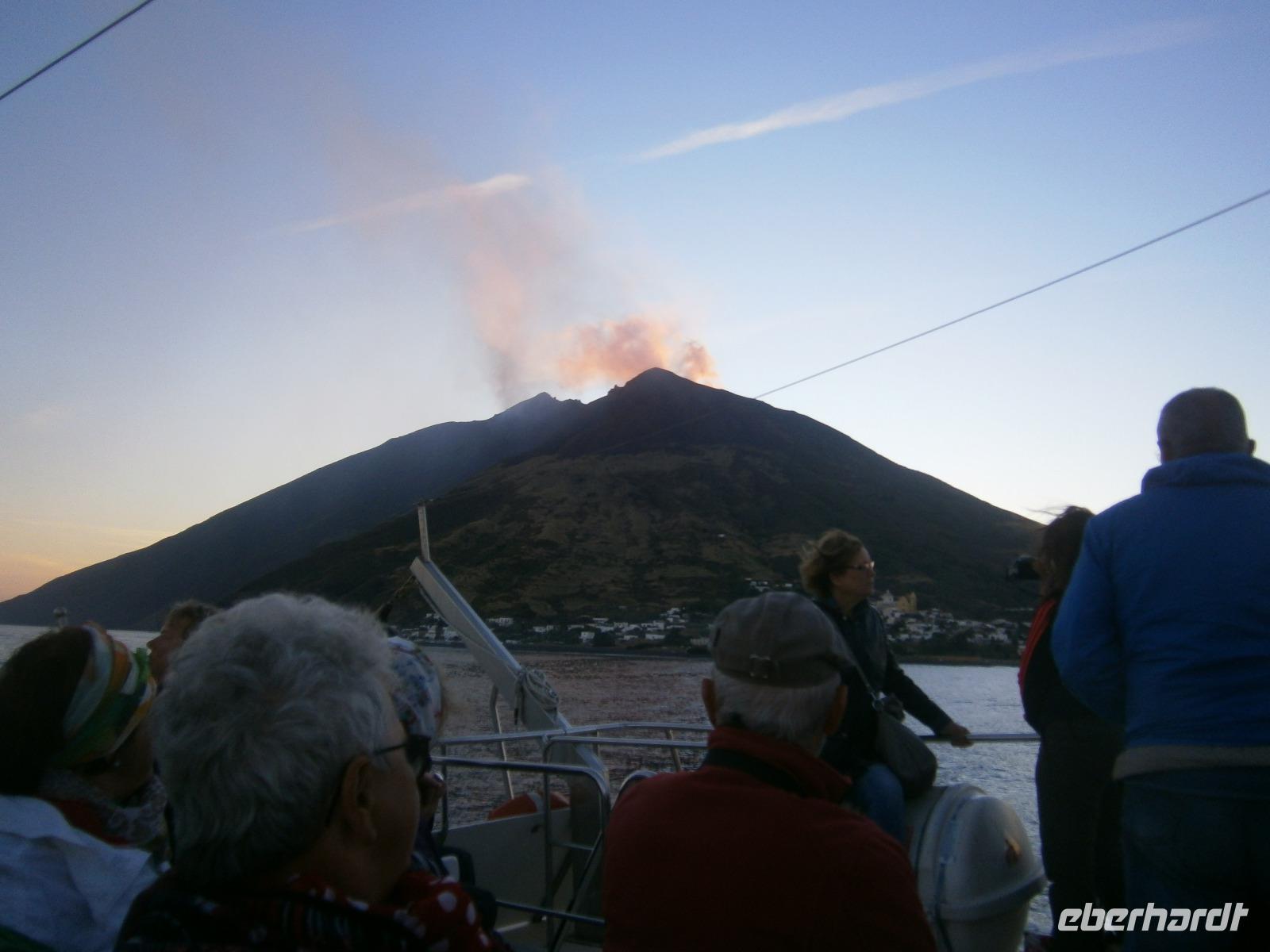 Heute Vormittag bummelten wir durch Lipari oder besuchten das Ärchäologische Museum des Ortes. Für den Nachmittag war eine Fahrt nach Panarea mit einem Spaziergang auf diesem Kleinod für uns organisiert worden. Weiter brachte uns das Schiff nach Stromboli. Schon vom Meer aus konnte man die Rauchwolken sehen, die der Vulkan ausstieß. Als wir nach einem Rundgang auf der Insel wieder an Bord gingen, war es schon dämmrig geworden und der Vulkan ließ uns mehrere Eruptionen sehen! So konnten wir wegen des für den nächsten Tag angekündigten Sciroccos nicht auf der Insel Stromboli bleiben, haben aber mehrere Ausbrüche des Stromboli sehen und fotografieren können- und waren zusätzlich noch auf der Insel Panarea. Zurück im Hafen von Lipari gab es Pasta an Bord des Schiffes.