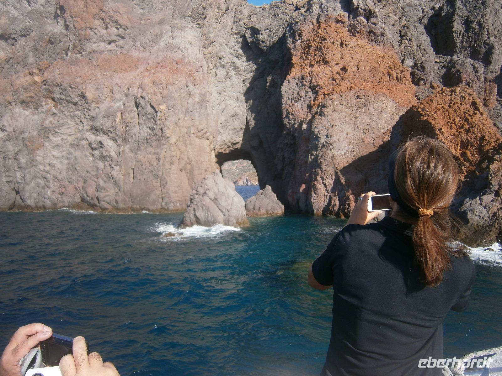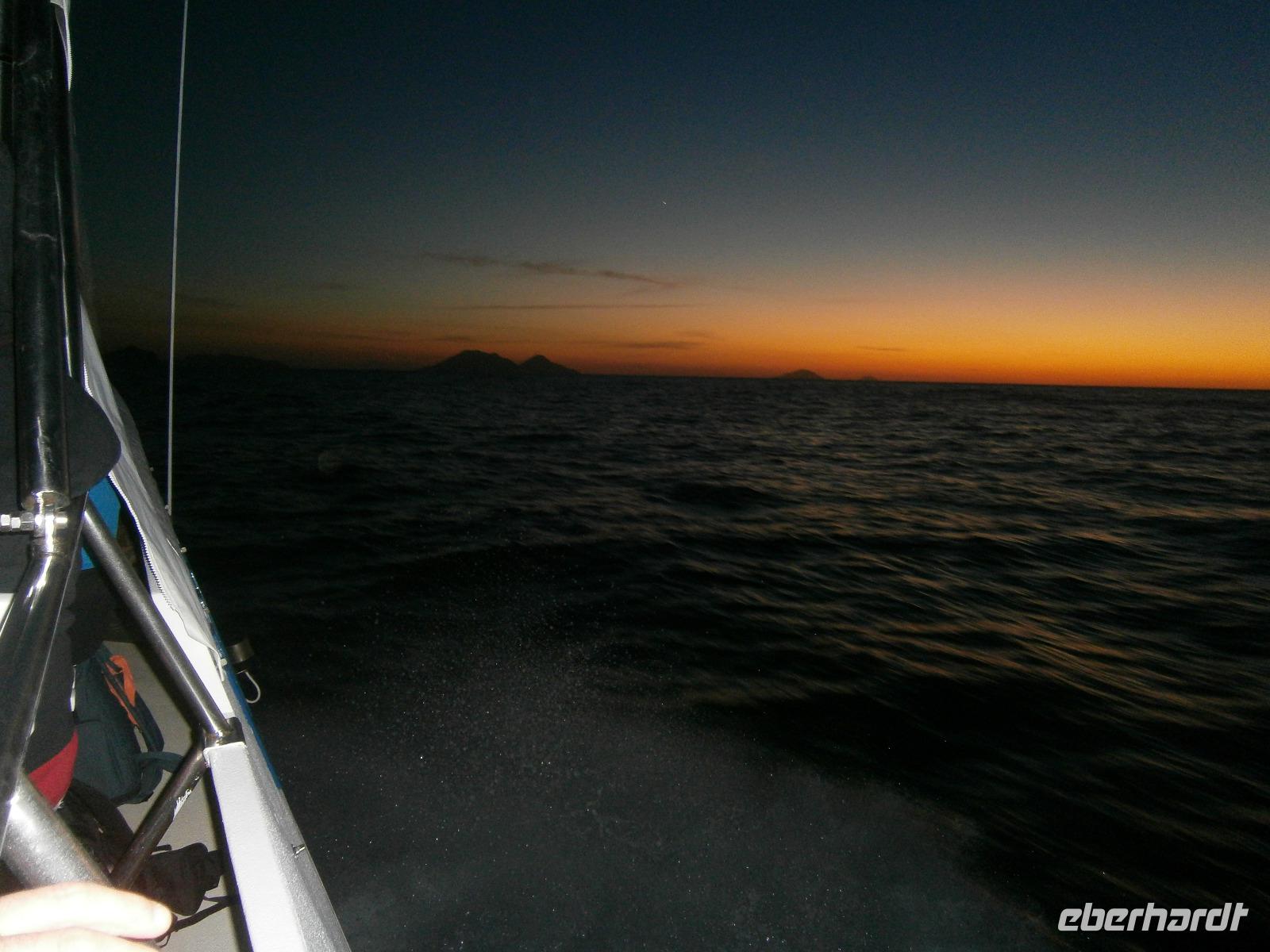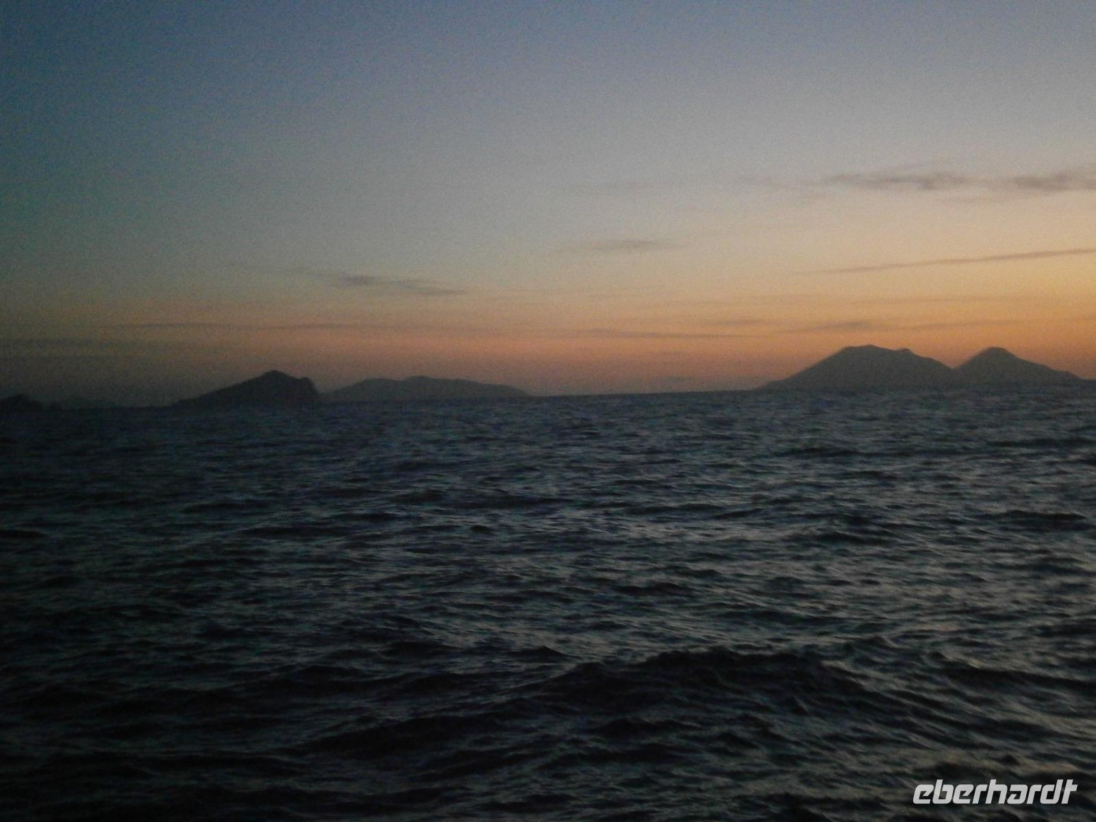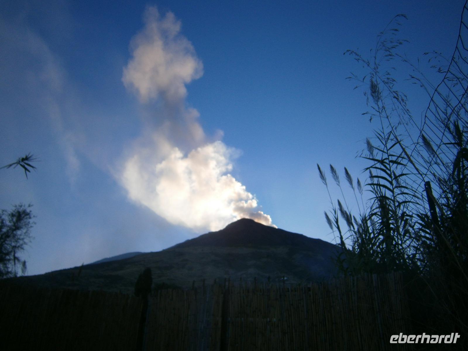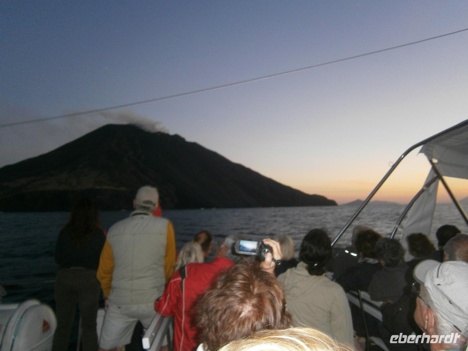 Heute Vormittag bummelten wir durch Lipari oder besuchten das Ärchäologische Museum des Ortes. Für den Nachmittag war eine Fahrt nach Panarea mit einem Spaziergang auf diesem Kleinod für uns organisiert worden. Weiter brachte uns das Schiff nach Stromboli. Schon vom Meer aus konnte man die Rauchwolken sehen, die der Vulkan ausstieß. Als wir nach einem Rundgang auf der Insel wieder an Bord gingen, war es schon dämmrig geworden und der Vulkan ließ uns mehrere Eruptionen sehen! So konnten wir wegen des für den nächsten Tag angekündigten Sciroccos nicht auf der Insel Stromboli bleiben, haben aber mehrere Ausbrüche des Stromboli sehen und fotografieren können- und waren zusätzlich noch auf der Insel Panarea. Zurück im Hafen von Lipari gab es Pasta an Bord des Schiffes.