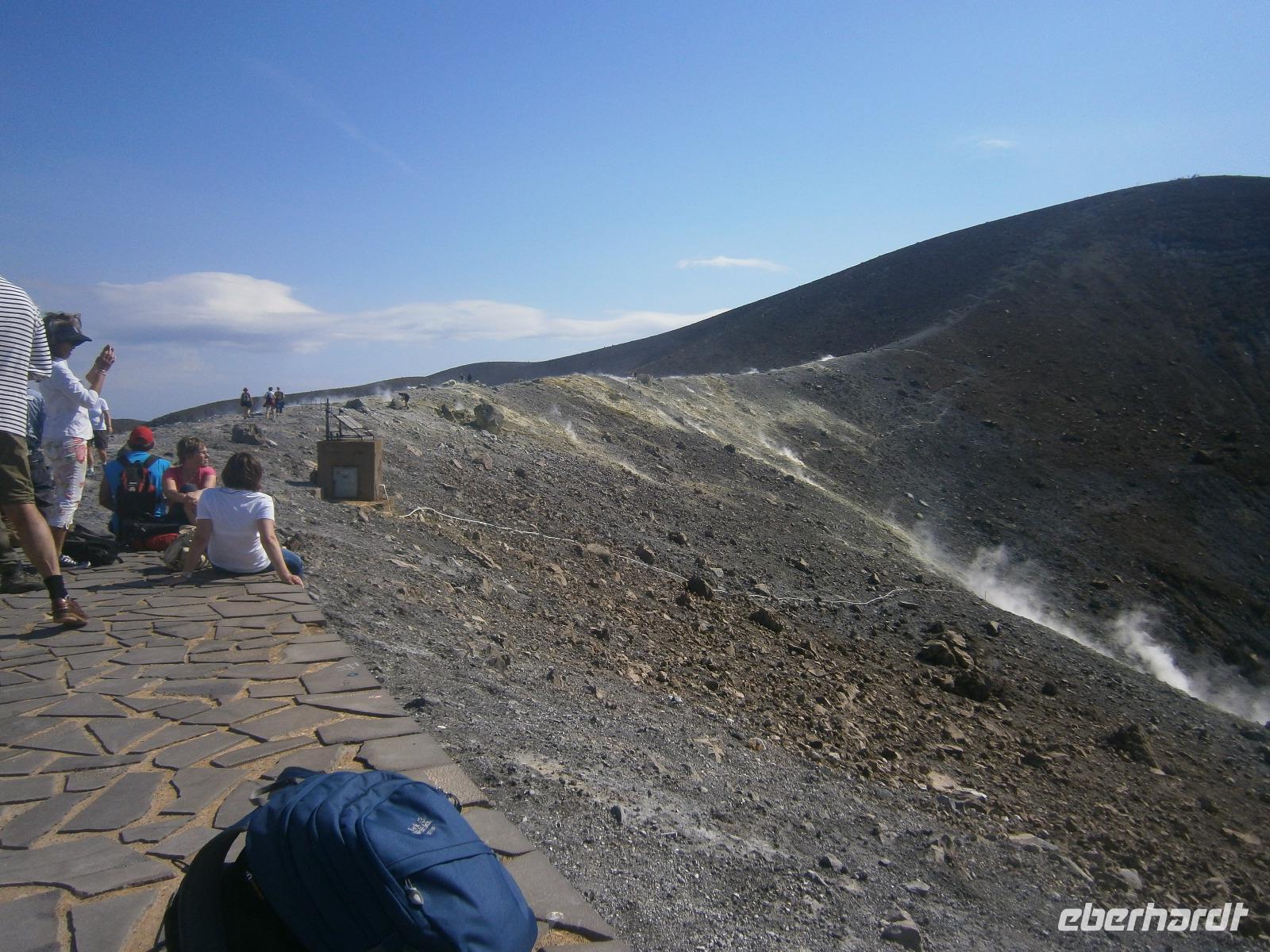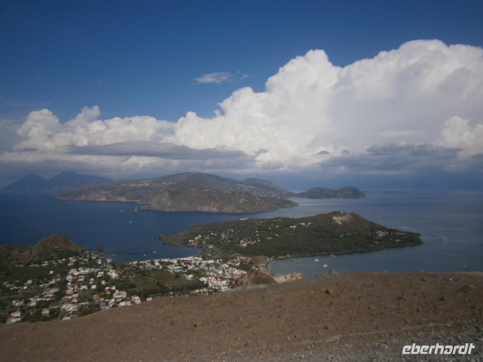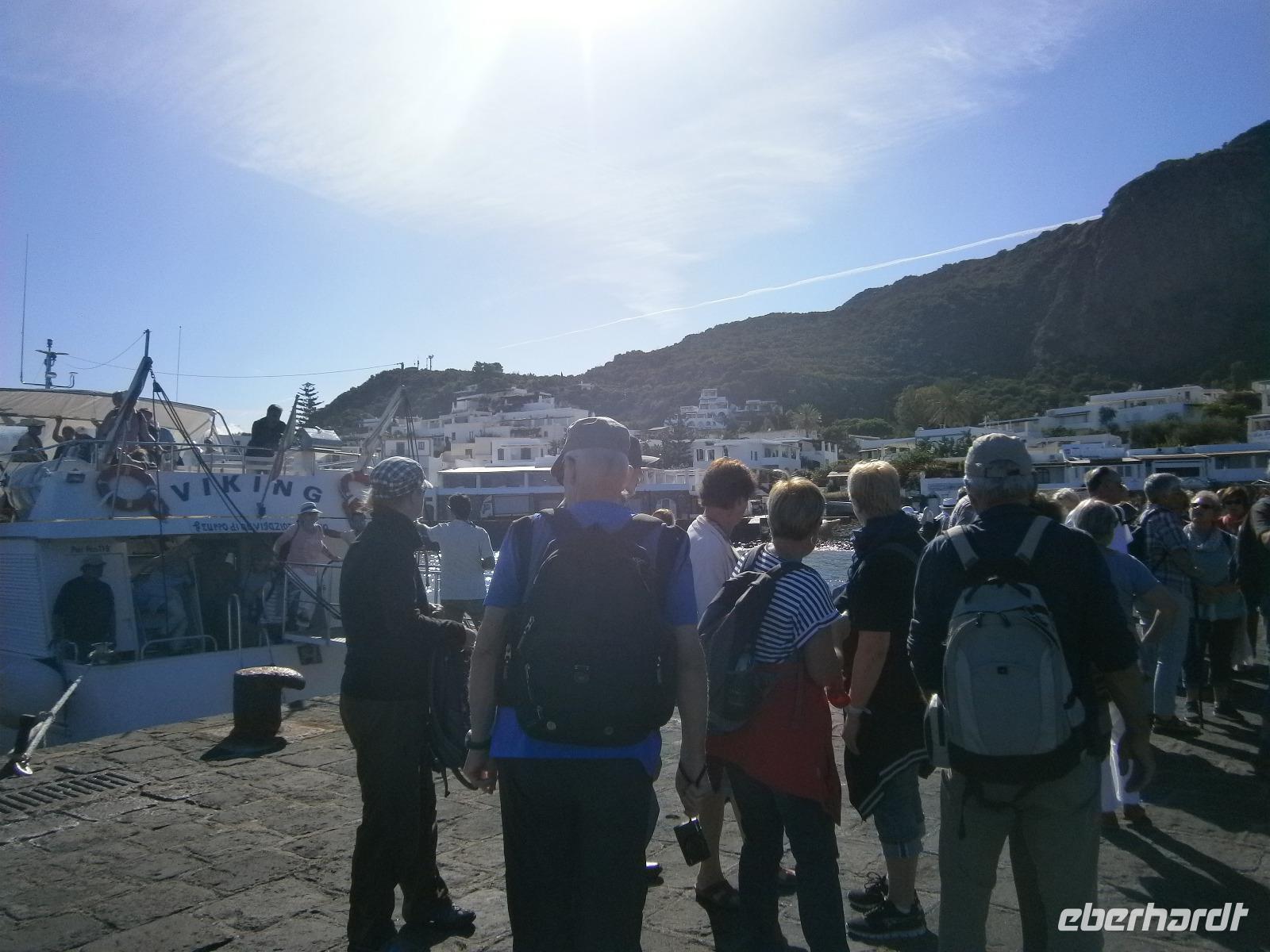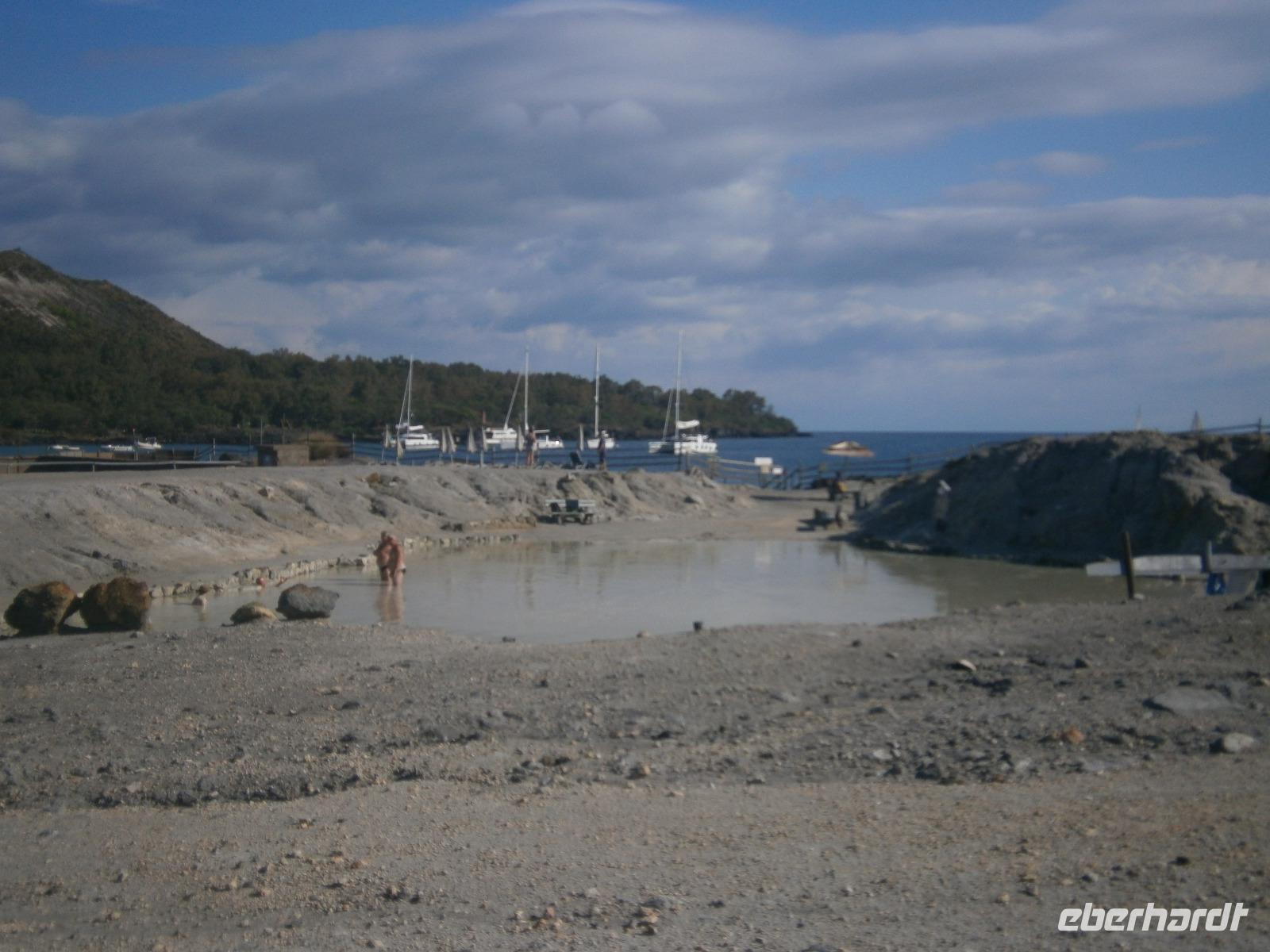 Nach einem nächtlichen Regenguß empfing uns der Tag wieder mit herrlichem Sonnenschein. So konnten wir die Schifffahrt zur Insel Vulcano richtig genießen. Dort meisterten wir den Aufstieg auf den allen anderen ihren Namen „Vulkan" gebenden Berg besser als manche von uns vermutet hatten. Am Kraterrand angekommen bot sich ein Blick in den riesigen Krater mit seinen rauchenden und sehr stark nach Schwefel riechenden Fumarolen. Wieder unten angelangt ging's ins Schwefel-Schlammbad und anschließend ins Meer baden. So um einiges verjüngt und viel gesünder brachte uns das Schiff nach Lipari zurück. Dort schauten wir auf einer Rundfahrt die Natur von Lipari, ihre ehemaligen Bimssteinbrüche und die Festung an. Immer wieder boten sich auch unbeschreiblich schöne Blicke aufs Meer und die Nachbarinseln an. Beim Abendessen merkte der Kellner sofort, wo wir gewesen waren. Aber wir hatten den Eindruck, dass er uns trotzdem noch „riechen konnte".