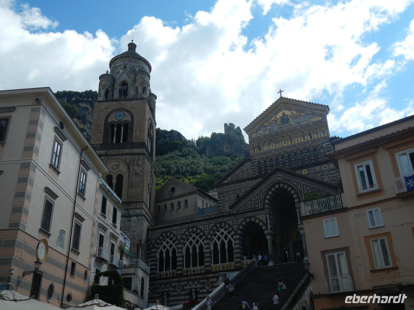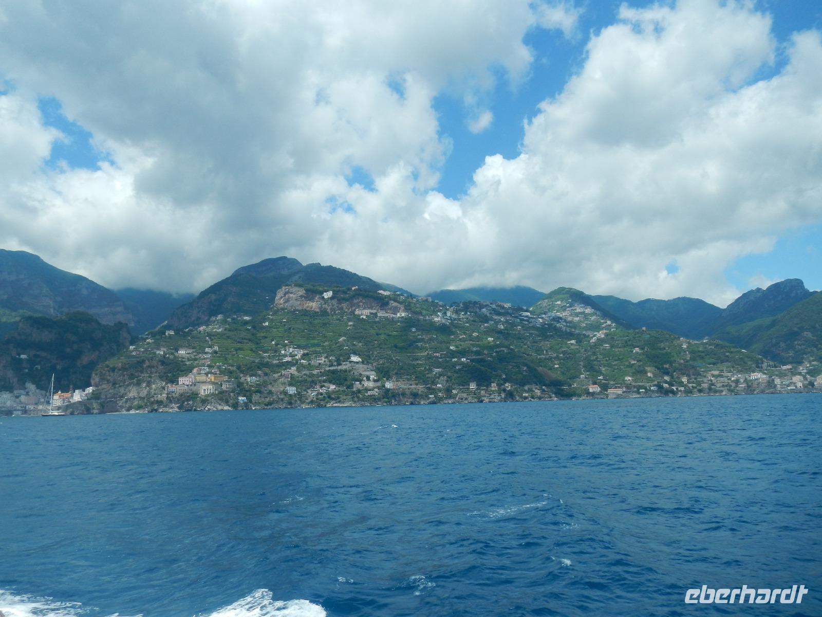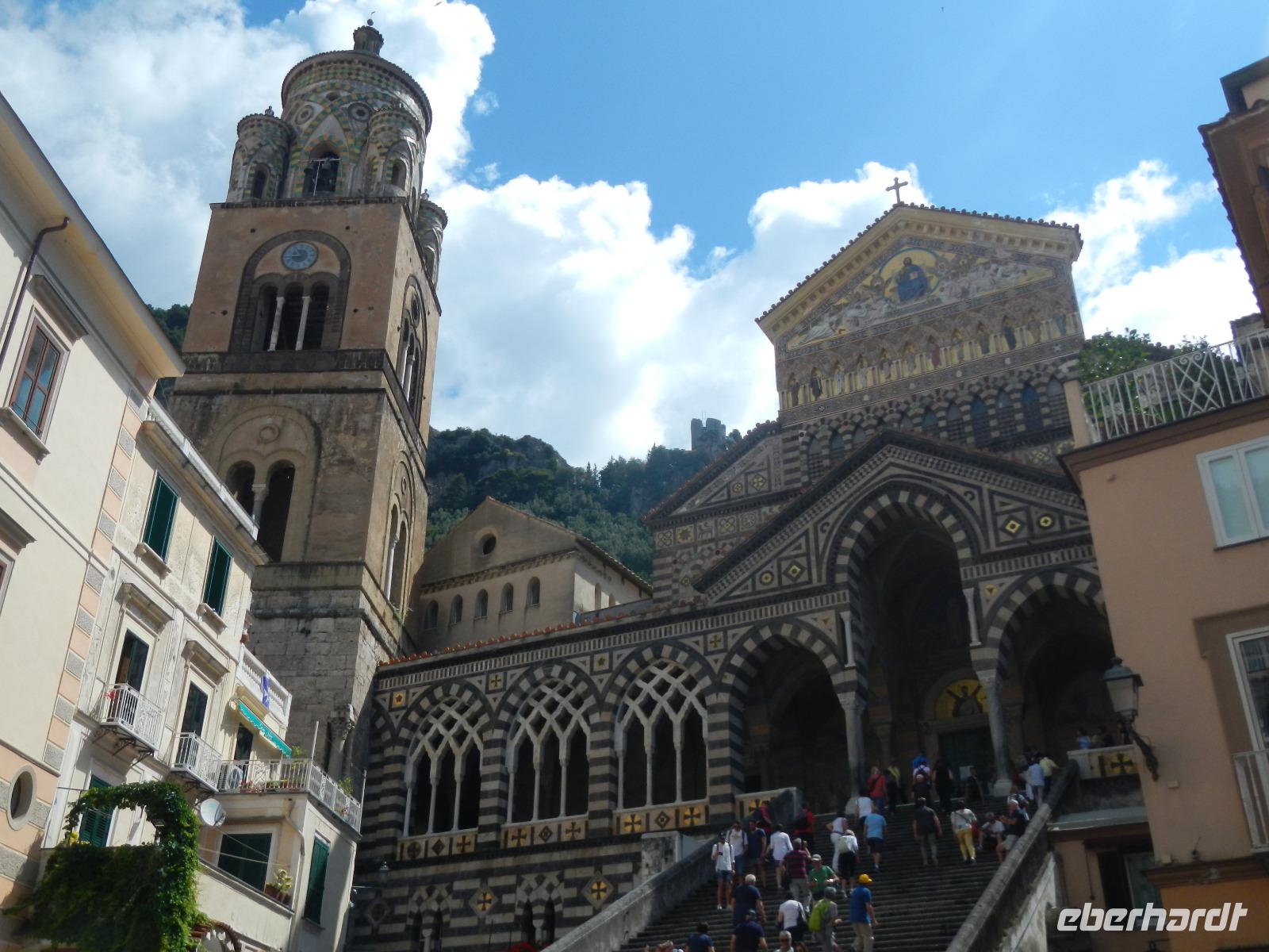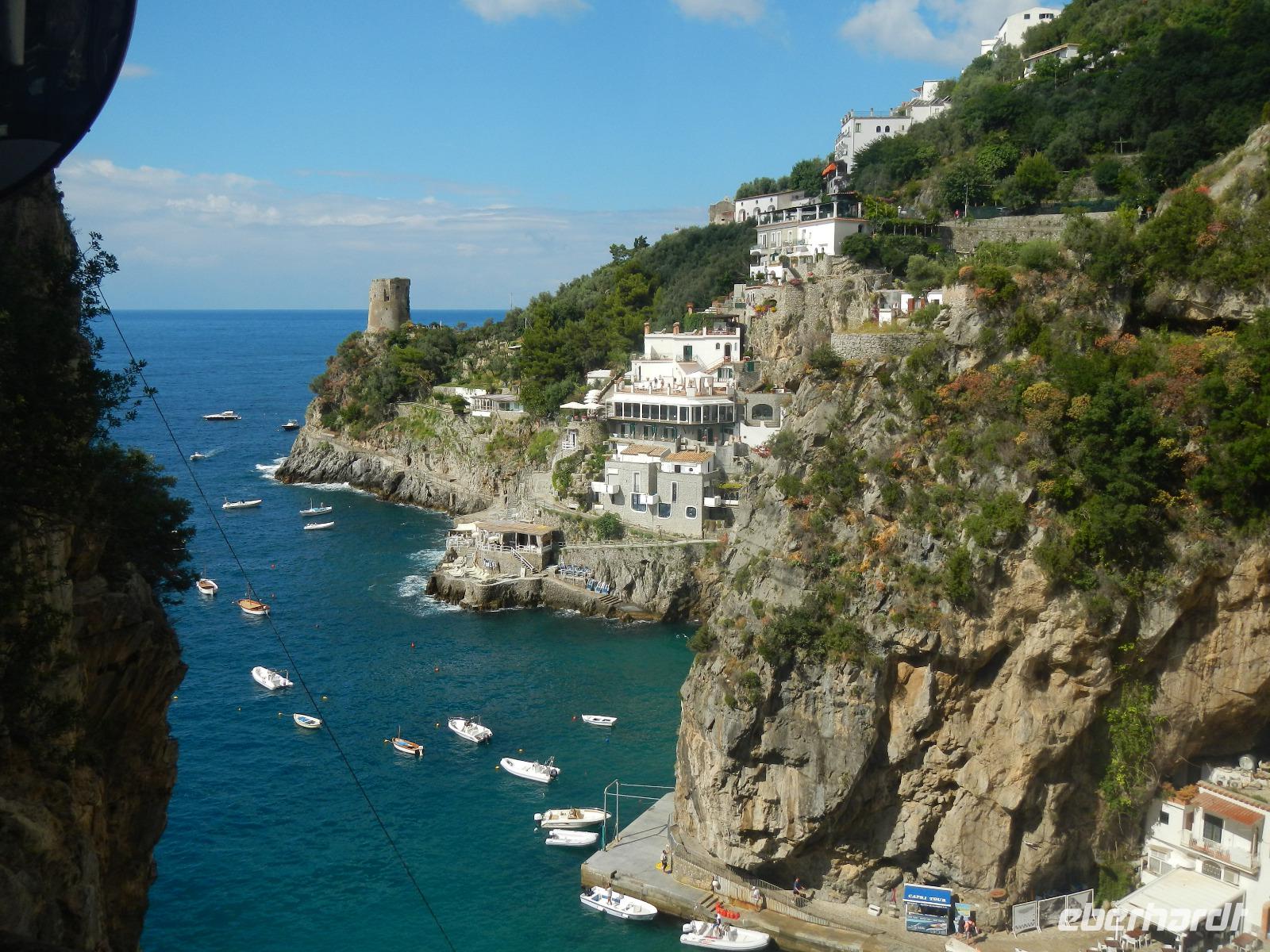 Der Ort verfügt über einen Busparkplatz mit einen angrenzenden Badestrand und einem kleinen Kai, der als Hafen dient. Die Besichtigung des Domes beginnt mit den Erläuterungen zum Paradieskreuzgang mit seinen in sich verflochtenen Bögen, die auf schlanken Säulen ruhen. Dieser Platz diente als letzte Ruhestätte für amalfitanische Edelleute. Unser Blick schweift ebenso auf den mit Majolikakacheln dekorierten Glockenturm bis wir zur Krypta gelangen. Hier wurden 1208 die Gebeine und der Kopf des Heiligen Andreas beigesetzt. Es bildet das Zentrum Amalfis. Nach etwas Freizeit treffen wir uns im Hafen und unternehmen eine Bootsfahrt mit Perspektivwechsel bis nach Salerno. Am Nachmittag fährt uns unser Chauffeur zum Landgut "Le Colline" in Sorrent. Hier leben und arbeiten 10 Familien in einer Genossenschaft und kümmern sich um den Anbau und die Verarbeitung von Zitronen, Oliven, Wein und Käse, dessen Milch deren Kühe im Stall liefern.