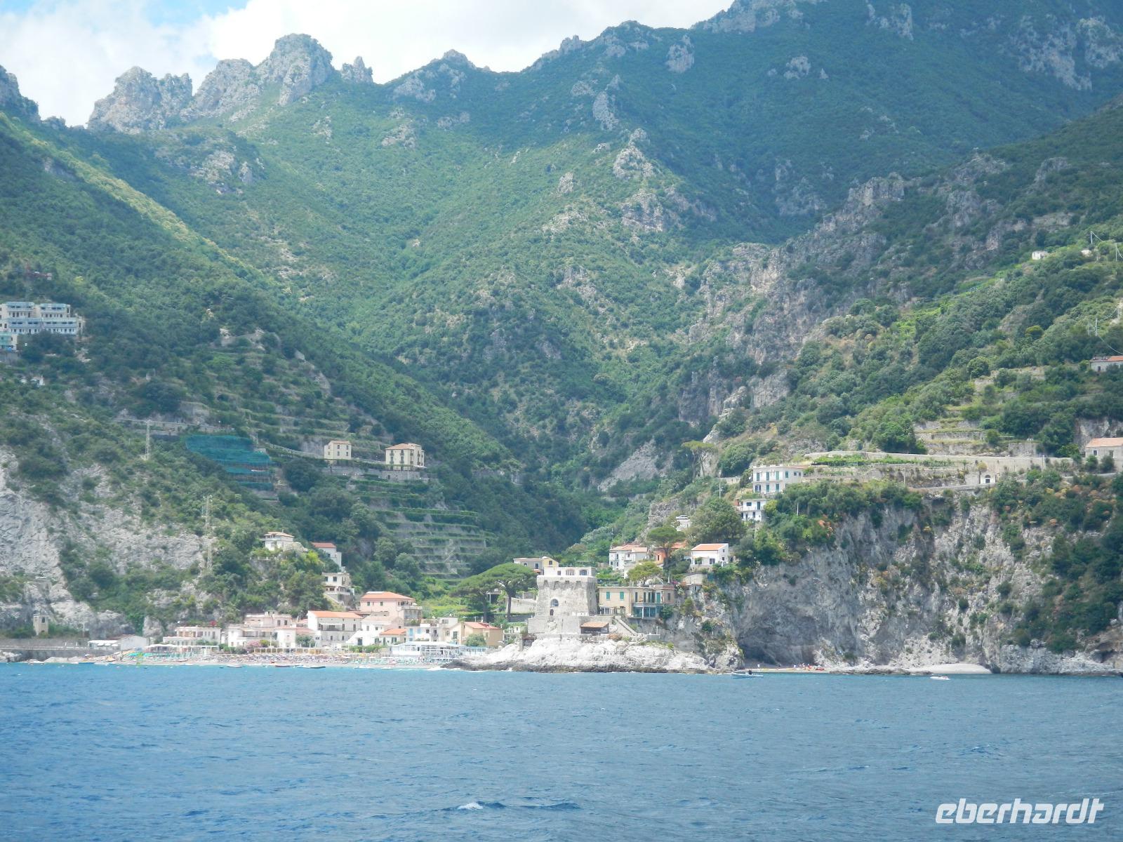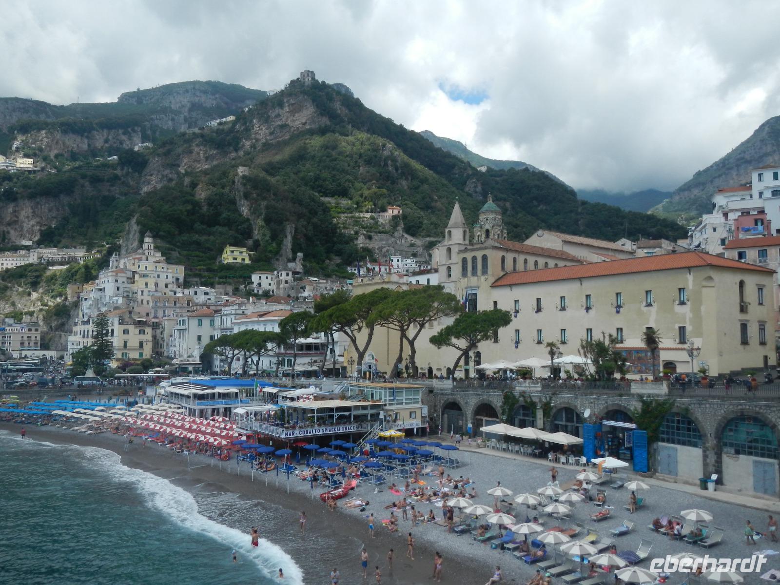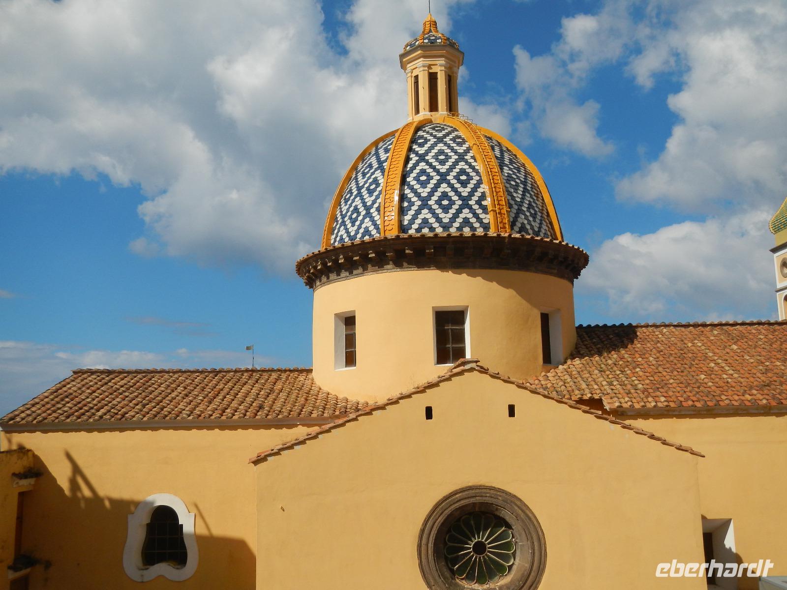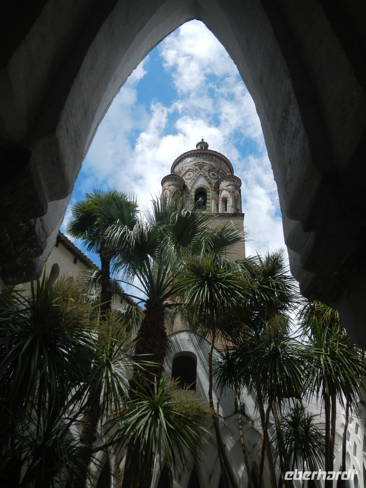 Der Ort verfügt über einen Busparkplatz mit einen angrenzenden Badestrand und einem kleinen Kai, der als Hafen dient. Die Besichtigung des Domes beginnt mit den Erläuterungen zum Paradieskreuzgang mit seinen in sich verflochtenen Bögen, die auf schlanken Säulen ruhen. Dieser Platz diente als letzte Ruhestätte für amalfitanische Edelleute. Unser Blick schweift ebenso auf den mit Majolikakacheln dekorierten Glockenturm bis wir zur Krypta gelangen. Hier wurden 1208 die Gebeine und der Kopf des Heiligen Andreas beigesetzt. Es bildet das Zentrum Amalfis. Nach etwas Freizeit treffen wir uns im Hafen und unternehmen eine Bootsfahrt mit Perspektivwechsel bis nach Salerno. Am Nachmittag fährt uns unser Chauffeur zum Landgut "Le Colline" in Sorrent. Hier leben und arbeiten 10 Familien in einer Genossenschaft und kümmern sich um den Anbau und die Verarbeitung von Zitronen, Oliven, Wein und Käse, dessen Milch deren Kühe im Stall liefern.