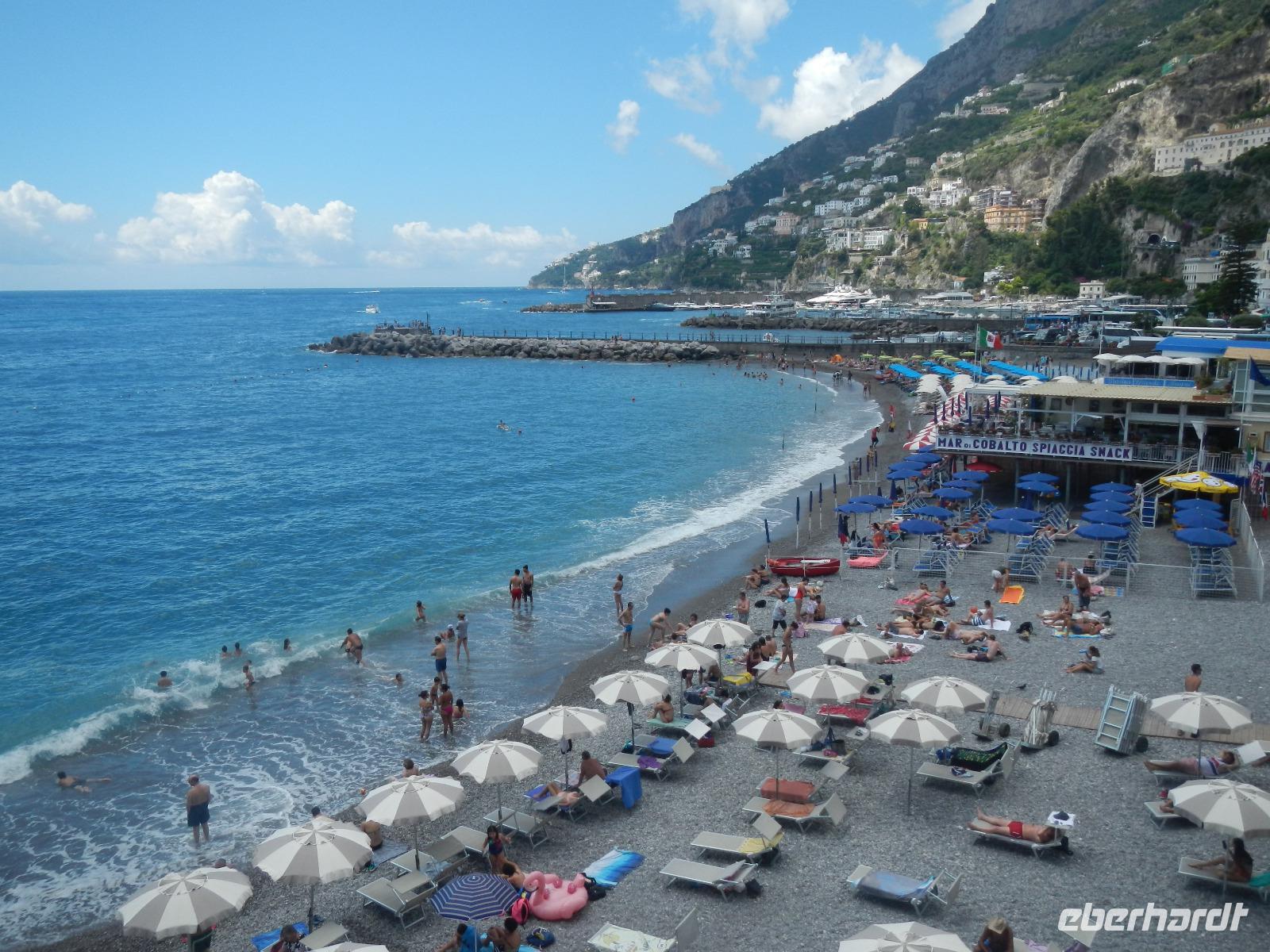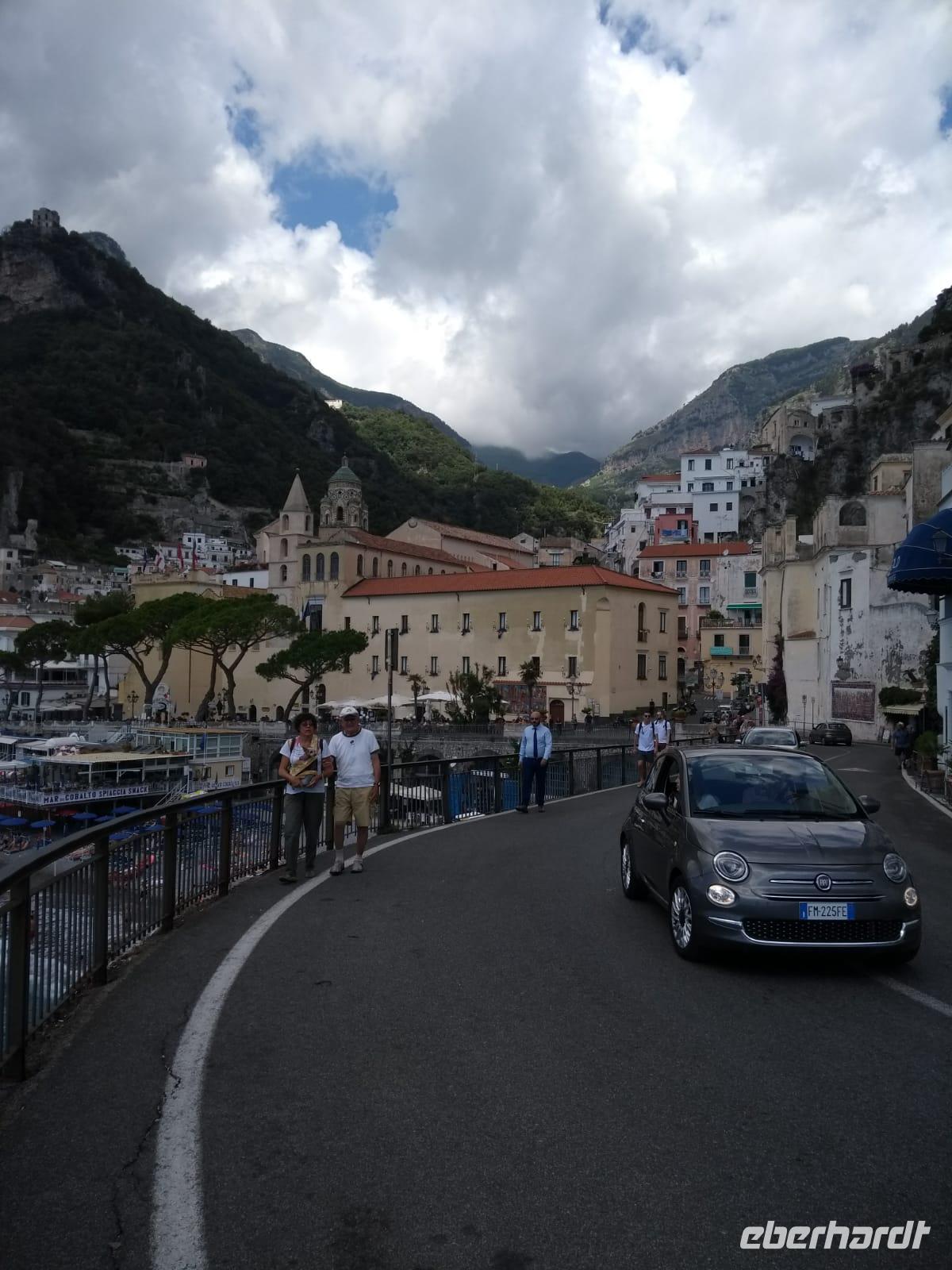 Bei wiederum optimalen Wetterbedingungen reisen wir heute entlang der berühmten 32 km langen Amalfi-Küstenstraße, die sich kurvenreich und schmal oberhalb der Gebirgsklippen an der Südküste der Sorrentinischen Küste entlangschlängelt. Wir bestaunen bei einer gemütlichen Busfahrt das sich ständig ändernde Panorama mit traumhaften Ausblicken über das glitzernde Meer, die steil abfallenden Klippen und die farbenfrohe Vegetation, die in pastellfarben gehaltenen Dörfer bis wir Amalfi erreichen.