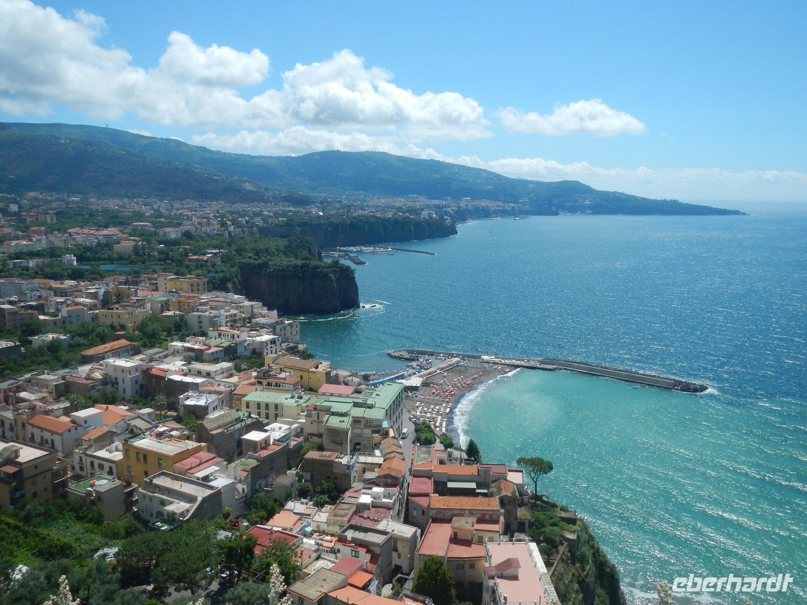 Nach 2 Stunden Flugzeit landen wir im sommerlichen Neapel und treffen auf unsere Frankfurter Reiseteilnehmer, die ebenso am Kofferband mit Spannung ihr Gepäck erwarten. Froh bin ich, als ich angesprochen werde, ob ich Frau Kirsche sei. Nun sind wir mit 14 Reiseteilnehmern komplett und wir treffen auf unseren Chauffeur Antonio, der uns in seinem Minibus in das " Hotel Cesare Augusto" in die Küstenstadt Sorrent bringt. Nach dem Check-in verabreden wir uns zu einem ersten Orientierungsspaziergang. Die hoch über den Klippen bebaute Stadt bietet uns einen herrlichen Panoramablick über den Golf von Neapel mit dem über ihn thronenden Vulkan Vesuv. An der Piazza Tasso gönnen sich einige ein leckeres italienisches Eis, weitere schlendern über den Corso Italia oder sogar runter zum Hafen. Im Hotel erhalten wir ein reichhaltiges italienisches Abendessen serviert und freuen uns auf die Erlebnisse der kommenden Tage.