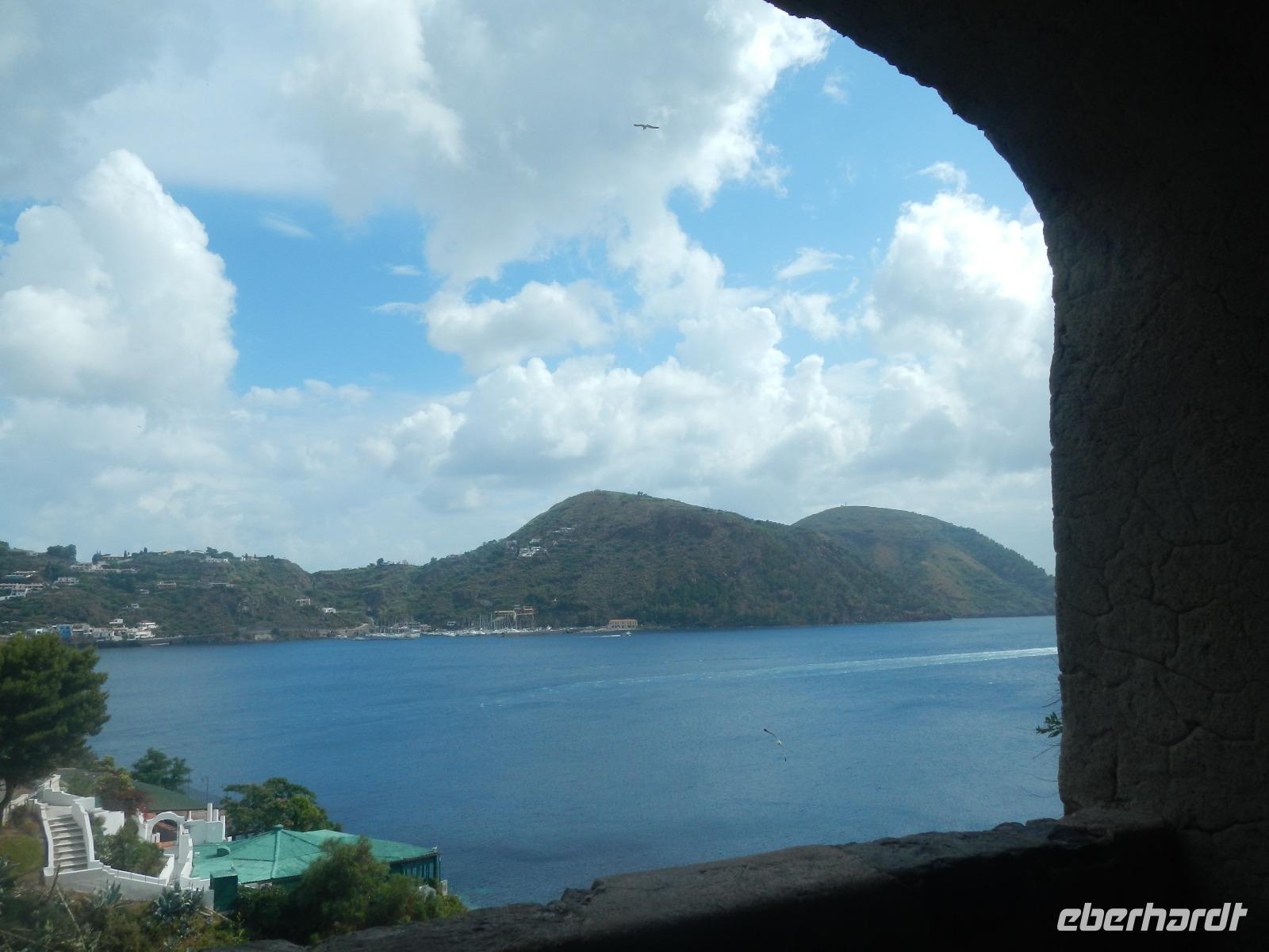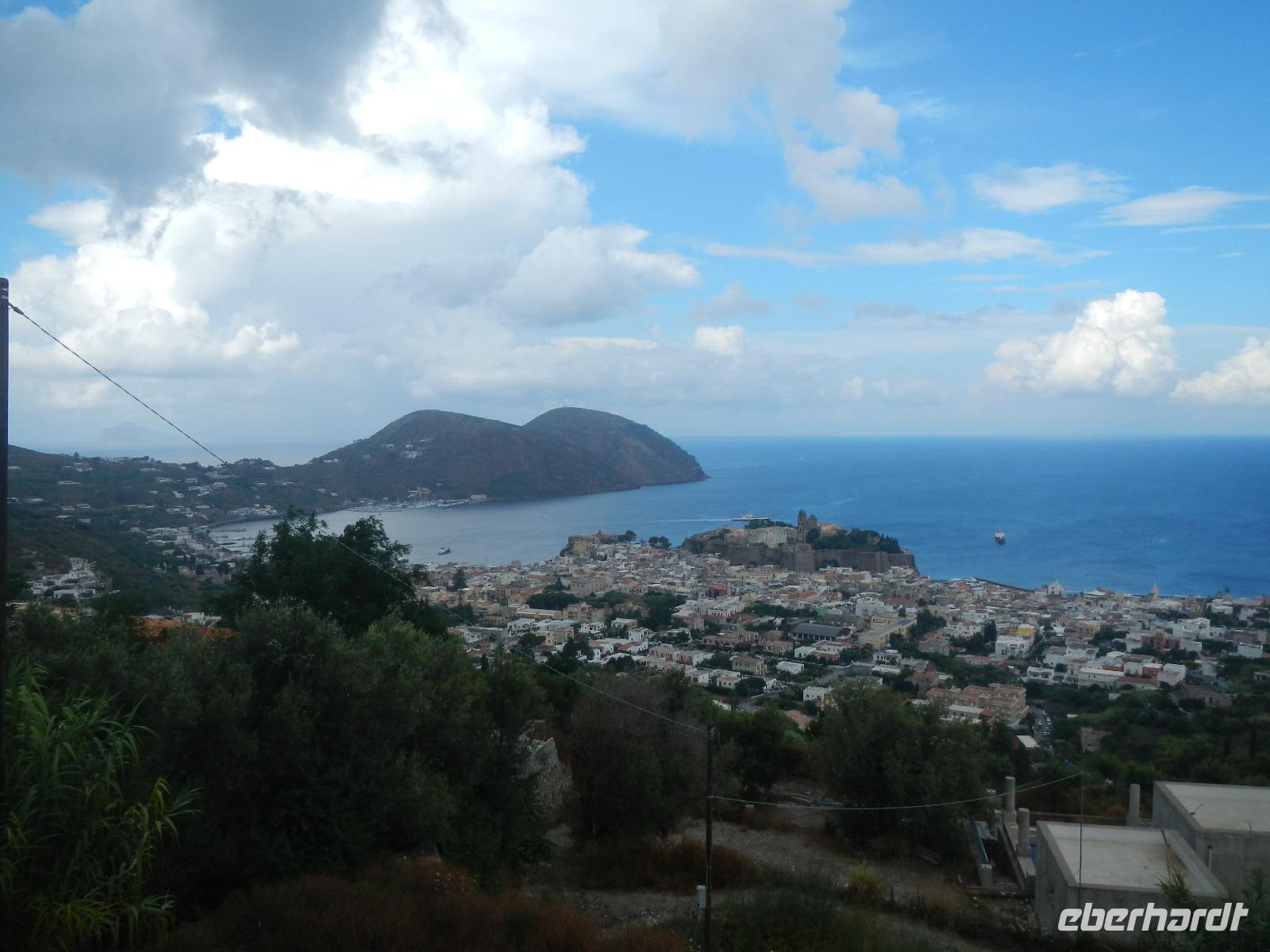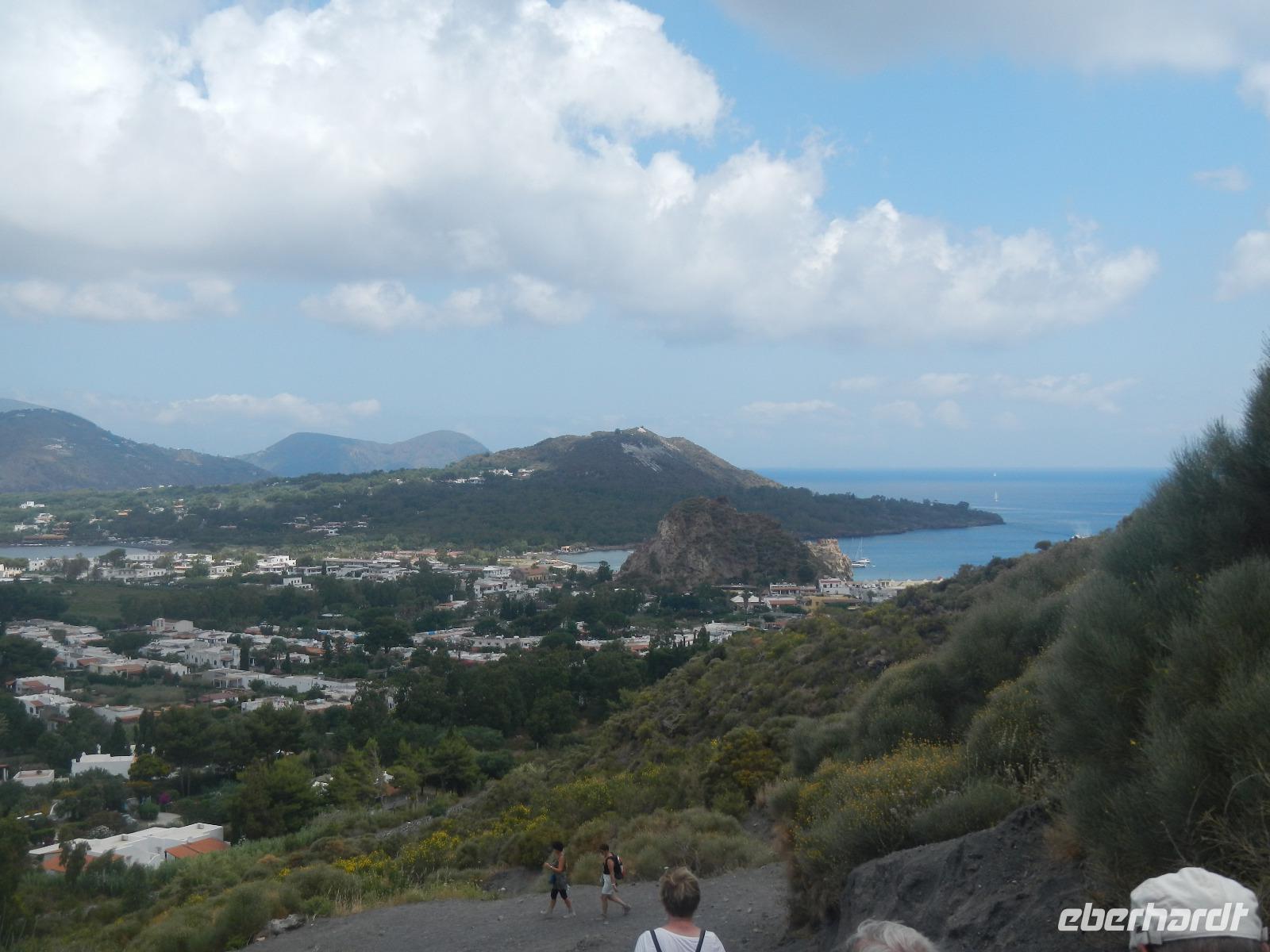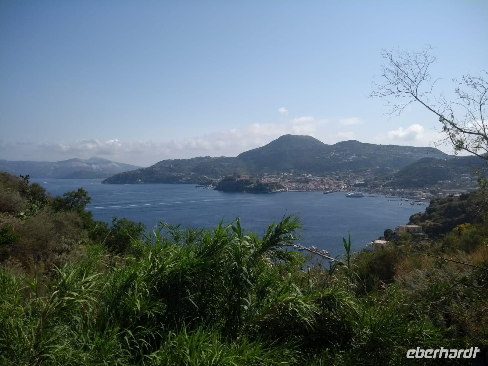 Heute früh beginnen wir mit unserer Erkundungstour auf der zum UNESCO Welterbe zählenden Äolischen Insel Lipari. Wir besuchen die Aussichtspunkte Quattroocci und betrachten die Steilküste der Nachbarinsel Vulcano. Vom Aussischtpunkt Quattropani sehen wir die Umrisse der Inseln Salina und Panarea sowie der Feuerberginsel Stromboli. Was die zahlreichen Bimssteinablagerungen anbelangt, erläutert uns Doreen die Eigenschaften des hellen und porösen Gesteins, das sogar auf Wasser schwimmt und im Gegensatz zu den ebenso vulkanisch entstandenen schwarzen, scharfkantigen und schweren Obsidian. Beide Steine sind chemisch betrachtet gleich, aber in ihren Eigenschaften grundverschieden. Nach dieser „Geologieexkursion" lernen wir auch einiges über die Vegetation wie z.B. Kapernblüten, verschiedene Küchenkräuter und Baumsorten kennen. Zurück im Hauptort Lipari besuchen wir nun die am Meer gelegene Burganlage aus dem 16. Jahrhundert mit der Kathedrale San Bartolomeo. Dieser ist auch der Schutzpatron der Liparischen Inseln. Am Nachmittag lockt das tolle Sommerwetter einige von uns ins kühle Nass und manch einer möchte in Bewegung bleiben. Wir haben uns den Aufstieg zum Berg Monte Rosa vorgenommen.