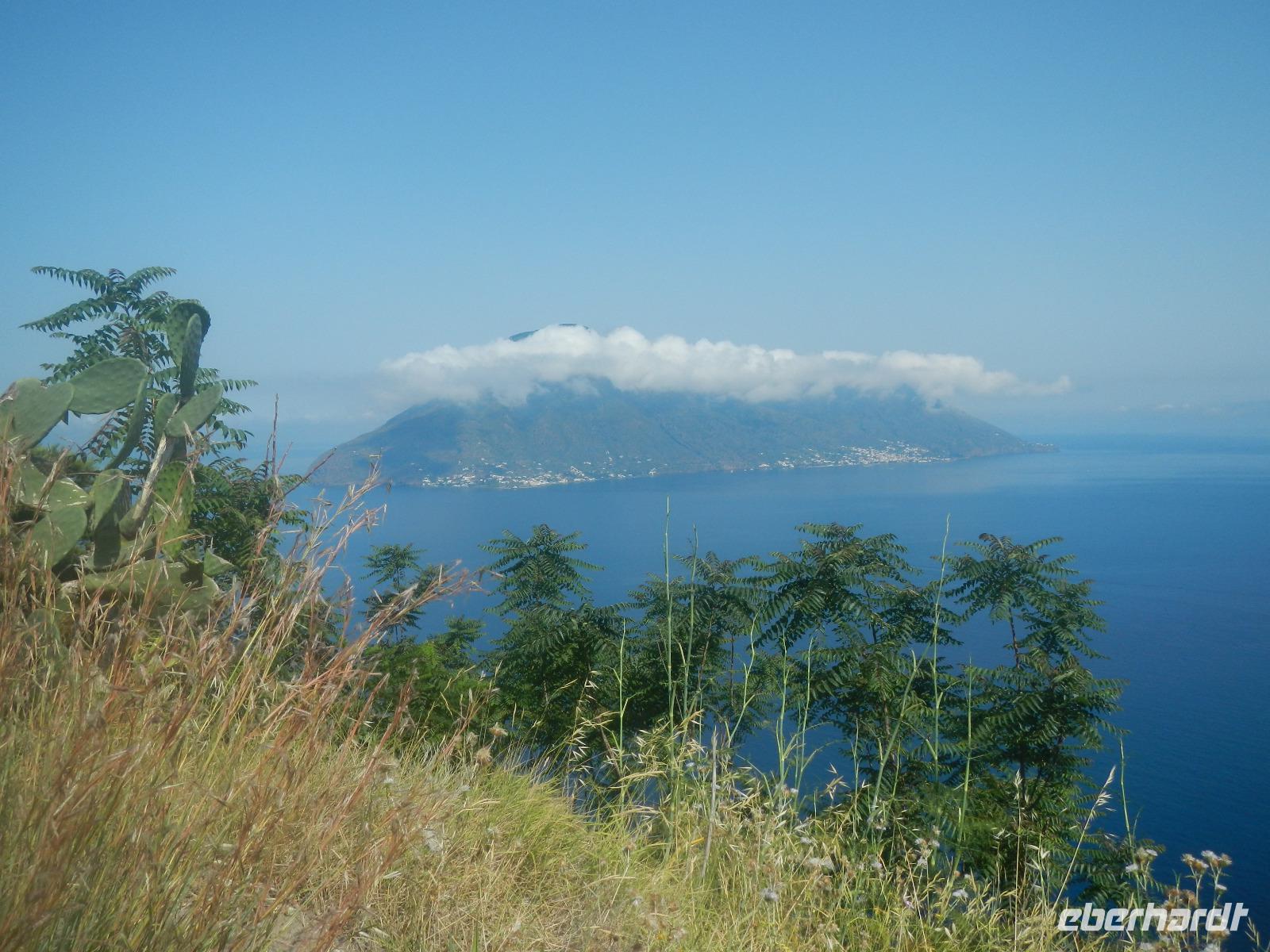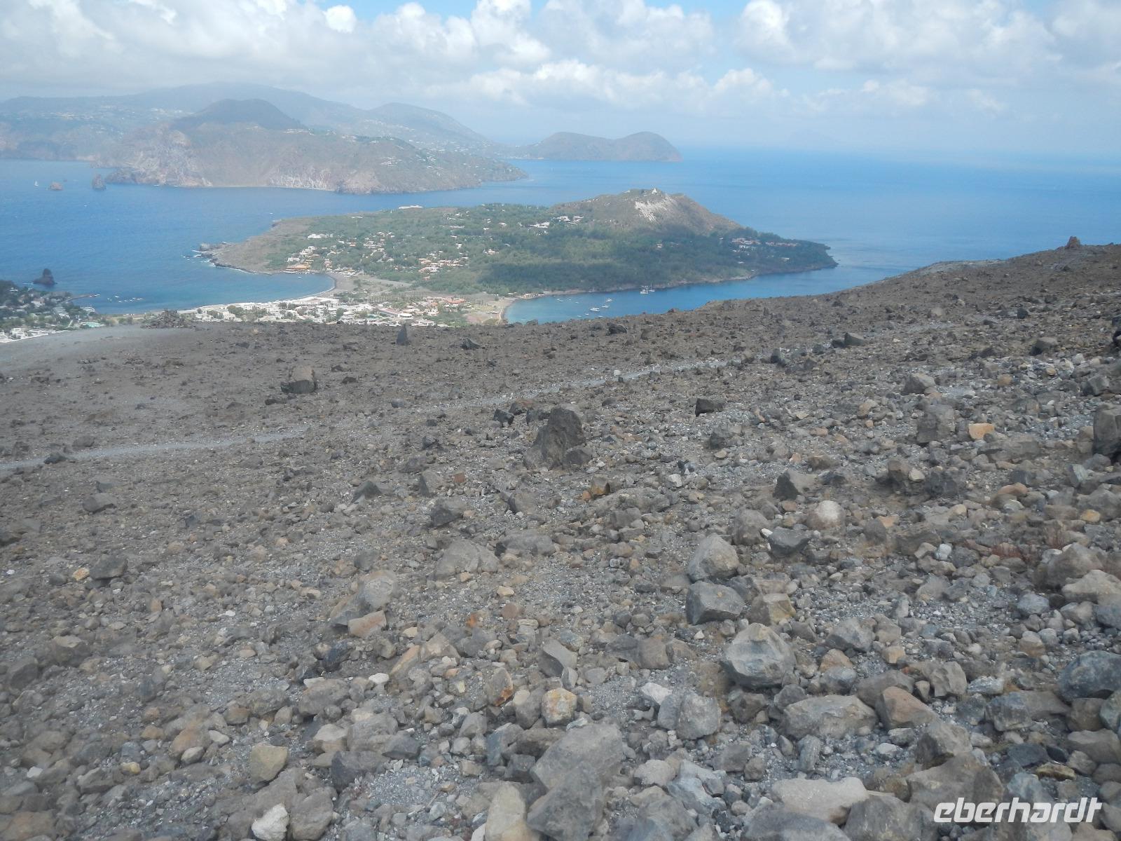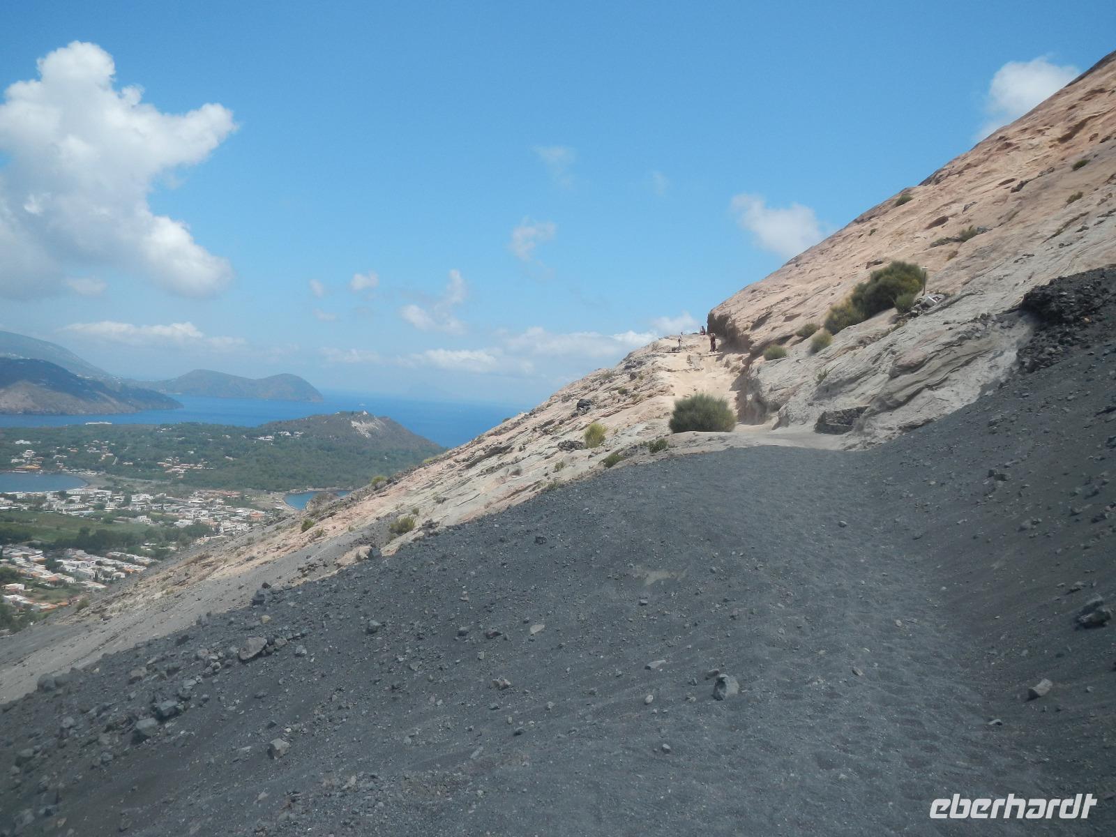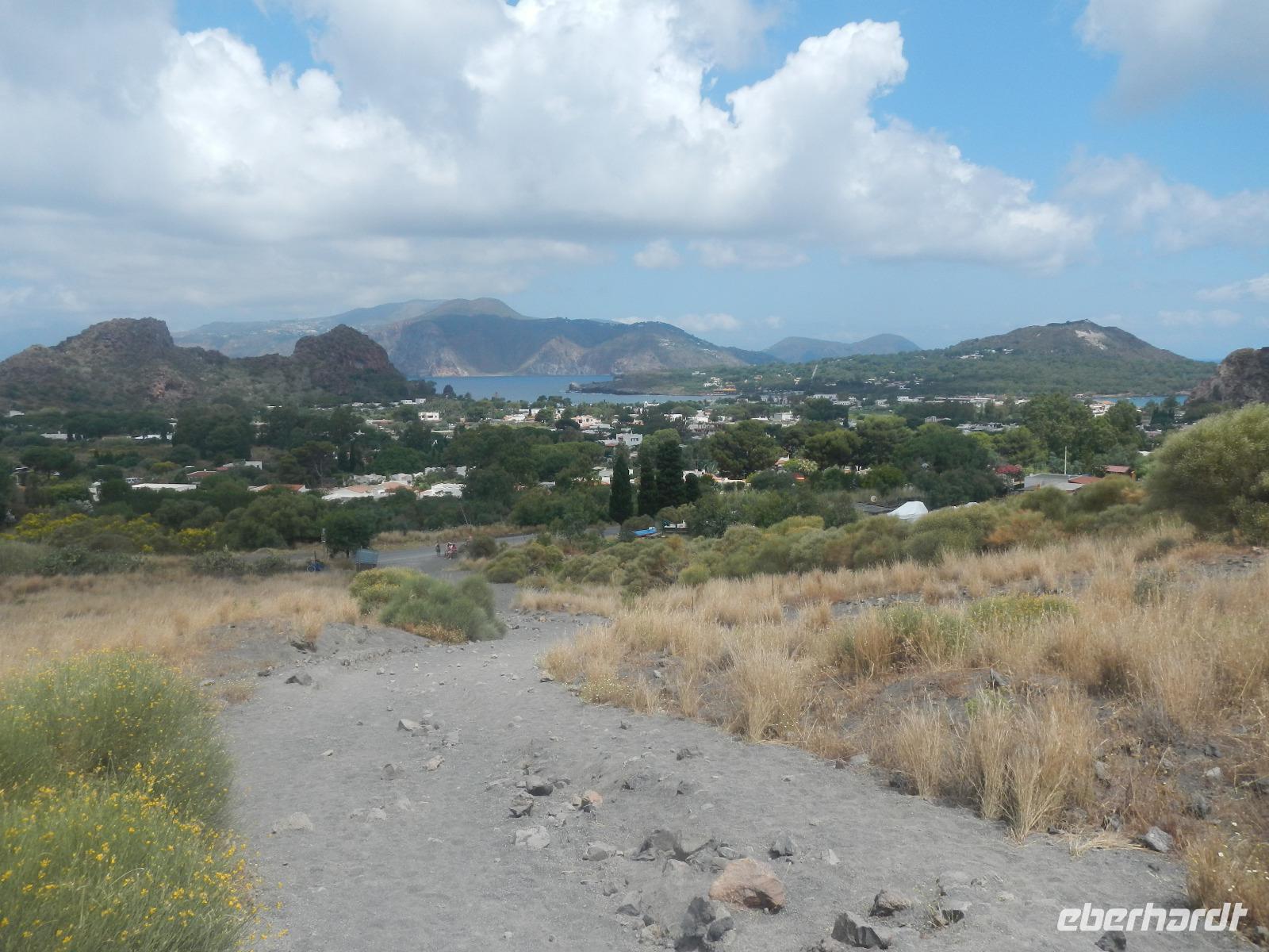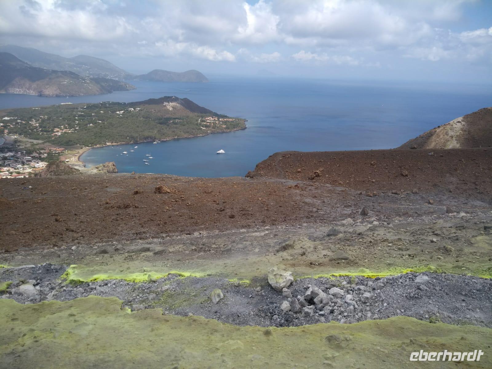 Heute früh beginnen wir mit unserer Erkundungstour auf der zum UNESCO Welterbe zählenden Äolischen Insel Lipari. Wir besuchen die Aussichtspunkte Quattroocci und betrachten die Steilküste der Nachbarinsel Vulcano. Vom Aussischtpunkt Quattropani sehen wir die Umrisse der Inseln Salina und Panarea sowie der Feuerberginsel Stromboli. Was die zahlreichen Bimssteinablagerungen anbelangt, erläutert uns Doreen die Eigenschaften des hellen und porösen Gesteins, das sogar auf Wasser schwimmt und im Gegensatz zu den ebenso vulkanisch entstandenen schwarzen, scharfkantigen und schweren Obsidian. Beide Steine sind chemisch betrachtet gleich, aber in ihren Eigenschaften grundverschieden. Nach dieser „Geologieexkursion" lernen wir auch einiges über die Vegetation wie z.B. Kapernblüten, verschiedene Küchenkräuter und Baumsorten kennen. Zurück im Hauptort Lipari besuchen wir nun die am Meer gelegene Burganlage aus dem 16. Jahrhundert mit der Kathedrale San Bartolomeo. Dieser ist auch der Schutzpatron der Liparischen Inseln. Am Nachmittag lockt das tolle Sommerwetter einige von uns ins kühle Nass und manch einer möchte in Bewegung bleiben. Wir haben uns den Aufstieg zum Berg Monte Rosa vorgenommen.