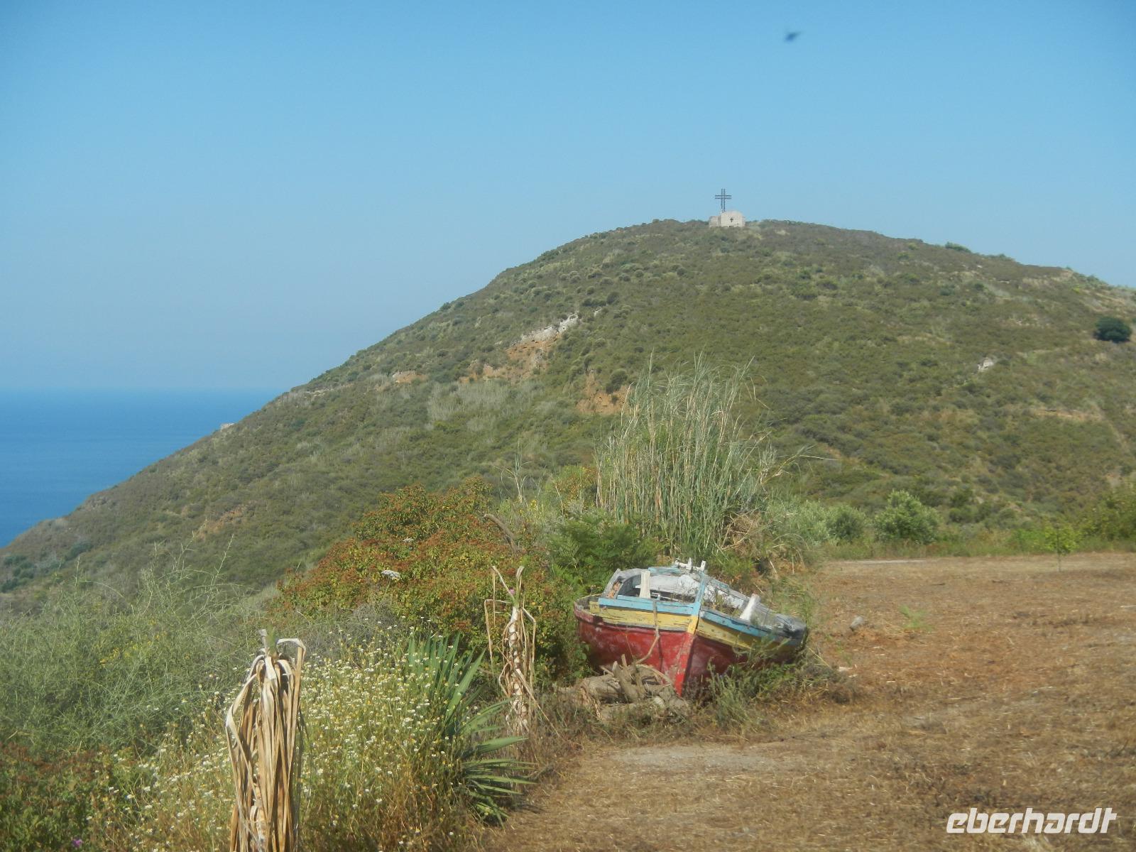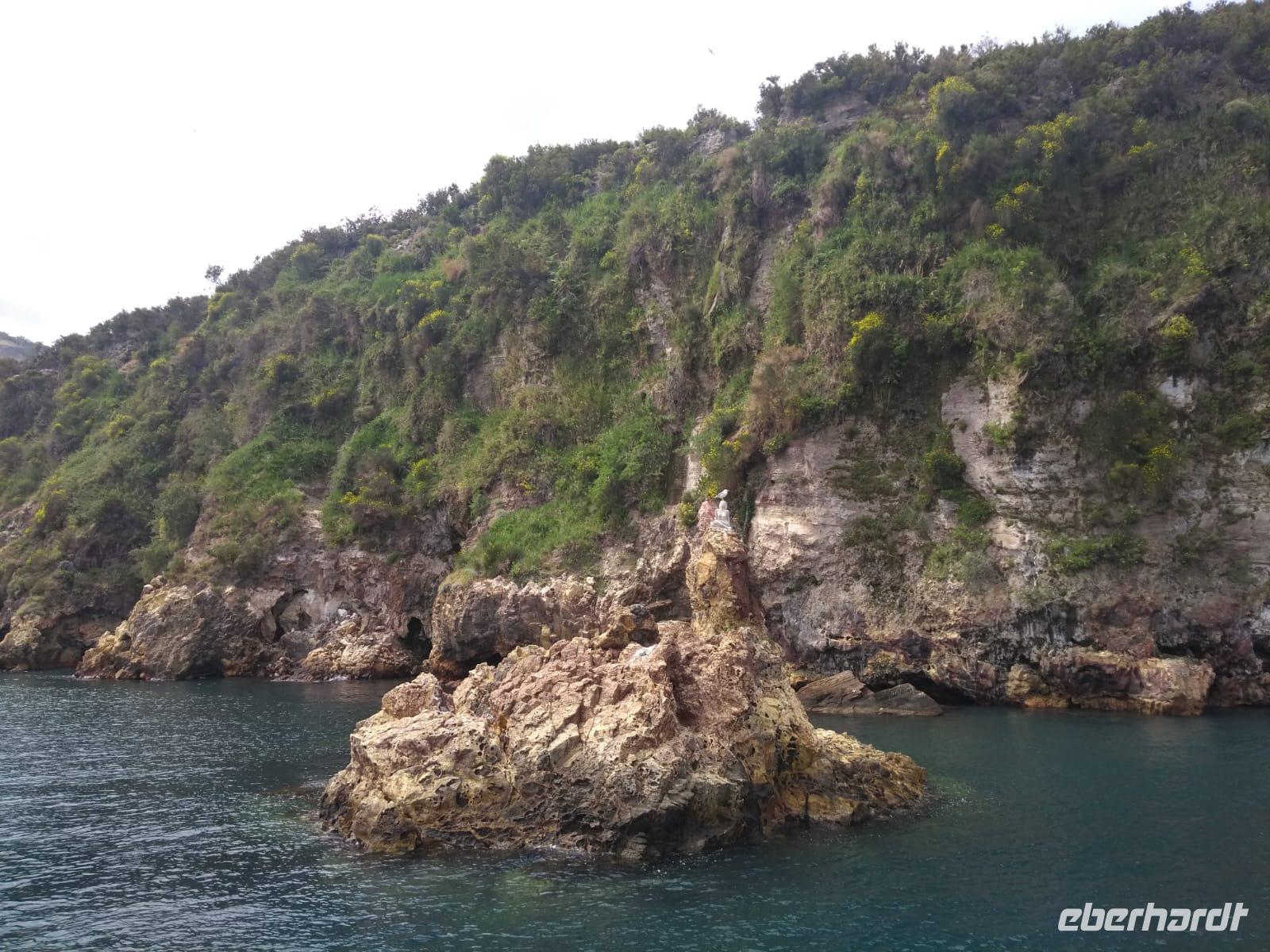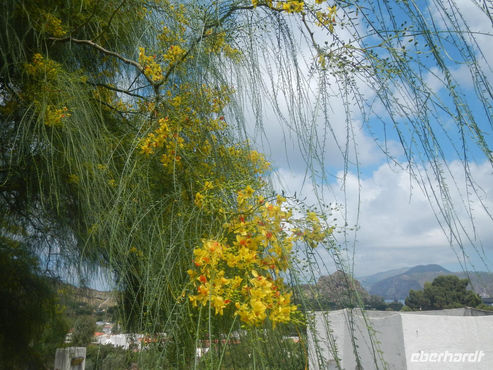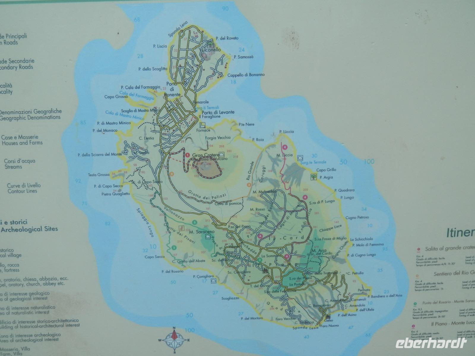 Heute früh beginnen wir mit unserer Erkundungstour auf der zum UNESCO Welterbe zählenden Äolischen Insel Lipari. Wir besuchen die Aussichtspunkte Quattroocci und betrachten die Steilküste der Nachbarinsel Vulcano. Vom Aussischtpunkt Quattropani sehen wir die Umrisse der Inseln Salina und Panarea sowie der Feuerberginsel Stromboli. Was die zahlreichen Bimssteinablagerungen anbelangt, erläutert uns Doreen die Eigenschaften des hellen und porösen Gesteins, das sogar auf Wasser schwimmt und im Gegensatz zu den ebenso vulkanisch entstandenen schwarzen, scharfkantigen und schweren Obsidian. Beide Steine sind chemisch betrachtet gleich, aber in ihren Eigenschaften grundverschieden. Nach dieser „Geologieexkursion" lernen wir auch einiges über die Vegetation wie z.B. Kapernblüten, verschiedene Küchenkräuter und Baumsorten kennen. Zurück im Hauptort Lipari besuchen wir nun die am Meer gelegene Burganlage aus dem 16. Jahrhundert mit der Kathedrale San Bartolomeo. Dieser ist auch der Schutzpatron der Liparischen Inseln. Am Nachmittag lockt das tolle Sommerwetter einige von uns ins kühle Nass und manch einer möchte in Bewegung bleiben. Wir haben uns den Aufstieg zum Berg Monte Rosa vorgenommen.