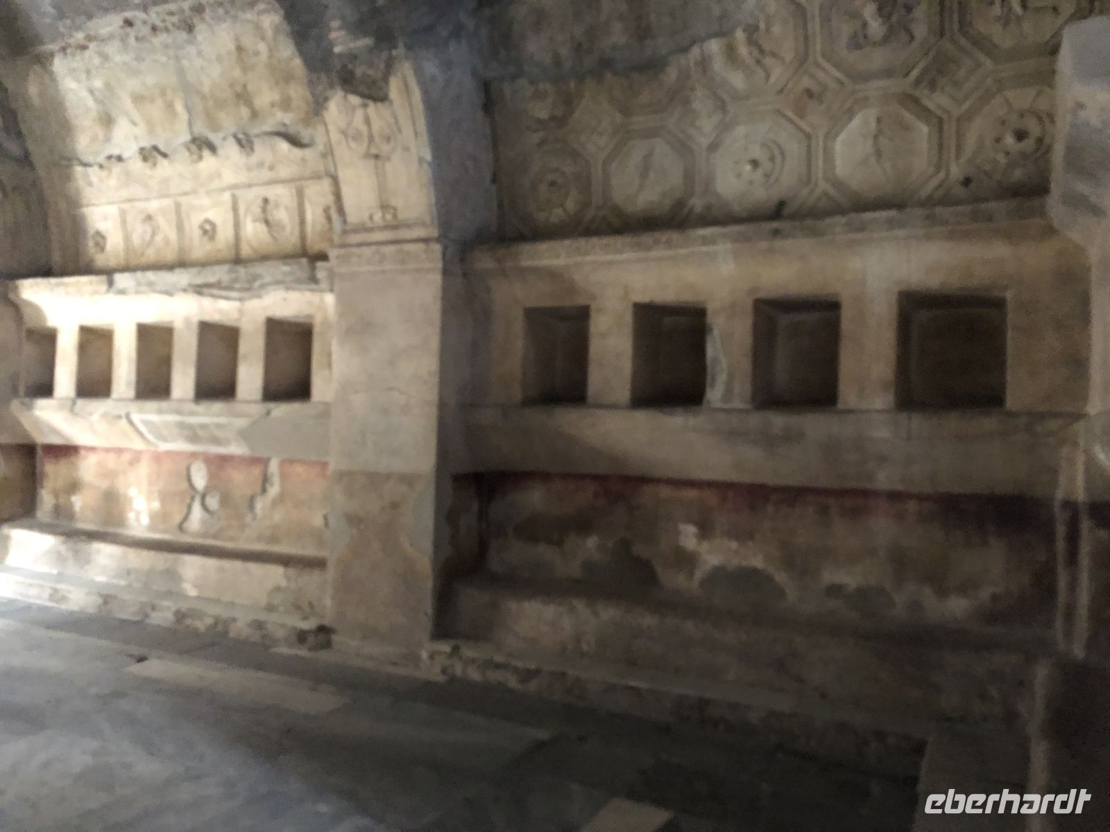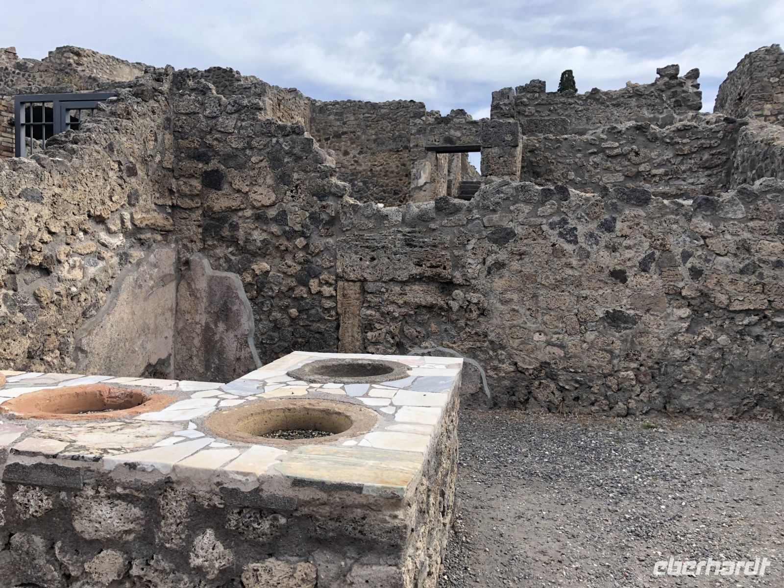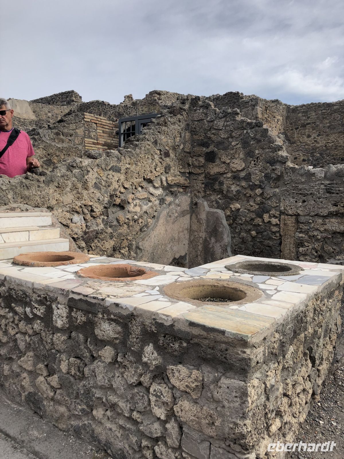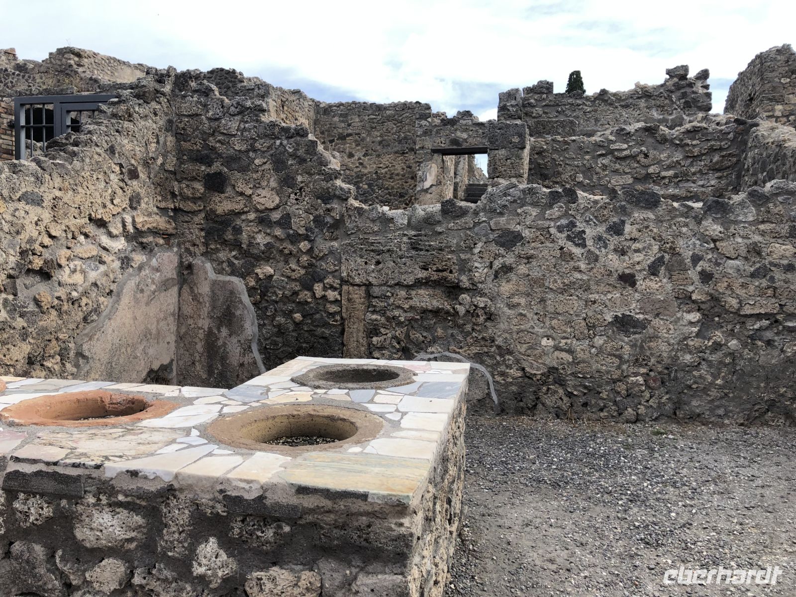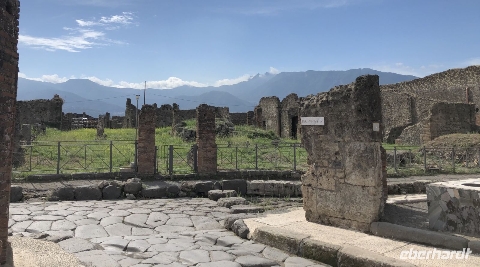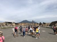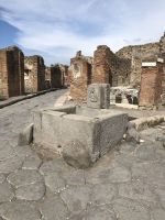„Sonntag waren wir in Pompeji. – Es ist viel Unheil in der Welt geschehen, aber wenig, das den Nachkommen so viel Freude gemacht hätte“ schrieb schon 1787 Johann Wolfgang von Goethe in seinem Buch „Italienische Reise“. Wie wahr. Und was für ein Glücksfall für die Archäologen bzw. für die gesamte Nachwelt. Diese antike Stadt wurde beim Ausbruch des Vulkans Vesuv im Jahr 79 n. Ch. unter sieben Meter Asche und Bimsstein begraben sowie gleichzeitig konserviert, so blieb all das erhalten, was uns heutzutage so fasziniert. In den letzten Jahrhunderten haben Archäologen große Teile der Stadt ausgegraben. Pompeji ist wohl eine der bekanntesten Ausgrabungsstätten der Welt, denn hier sind Häuser, Straßen, Geschäfte, Bilder, Statuen und sogar die Leichen der ehemaligen Bewohner sehr gut erhalten. Wir erlebten einen Einblick ins Alltagsleben der Menschen von Damals, sahen die Backstube, Gasthäuser, die Therme, welche schon mit einer Fußbodenheizung ausgestattet war und schlenderten einmal durch das Freudenhaus, natürlich nur aus wissenschaftlichem Interesse ??. Im Haus einer reichen Familie sahen wir dagegen die Unterschiede bereits an den Wandmalereien. Fast fühlte man sich zurückversetzt in die damalige Zeit, sah vor dem inneren Geiste die Frauen an den Brunnen schwatzend beim Wasserholen oder im Theater die Schauspieler eine Komödie aufführen. Und und und … so viel gäbe es noch zu sehen, mindestens einen Tag benötigt man, damit man annähernd einen Großteil gesehen hat, sagte uns Peppe, dabei sind nur etwa 60 % der Gesamtfläche Pompejis freigelegt. Staunend spazierten wir auf Straßen, auf denen vor uns schon vor mehr als 2000 Jahren Menschen wandelten. Mit unserem zweistündigen Besuch bekamen wir einen kleinen Eindruck von Ausmaß der ehemaligen Stadt als auch der Katastrophe, welche sie heimsuchte.